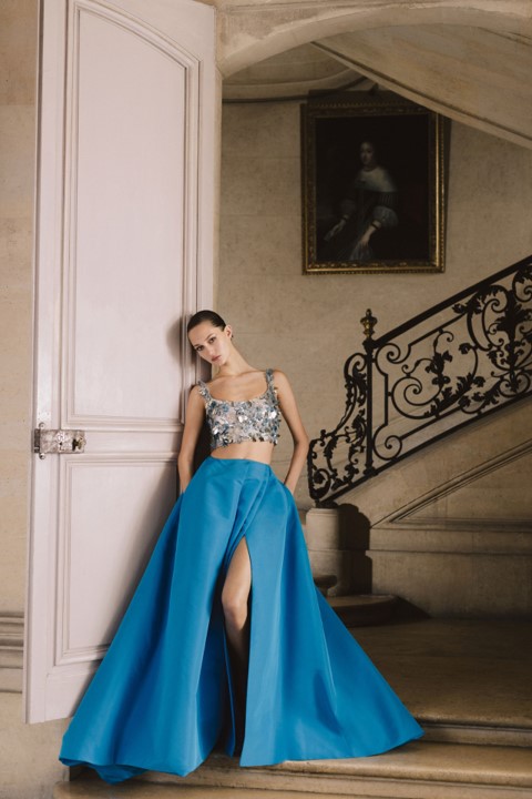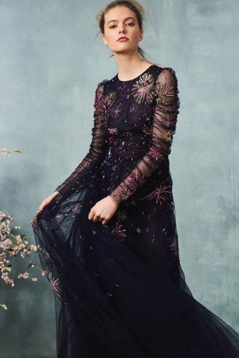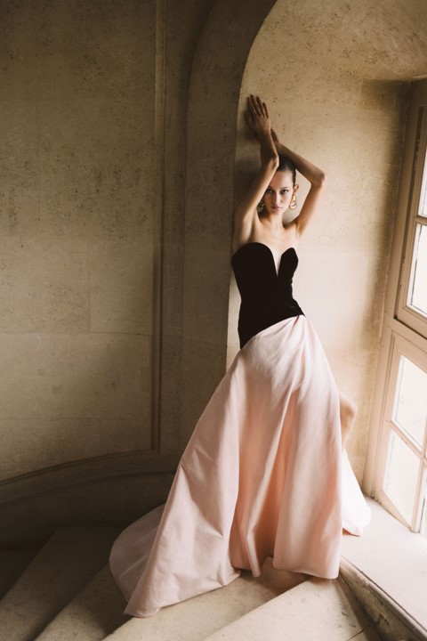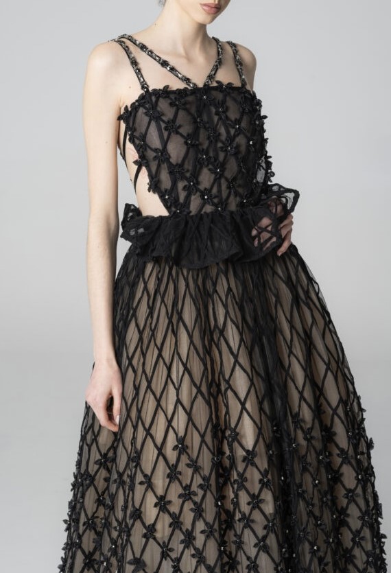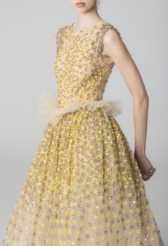 上半身から腰まで体にフィットしたラインで、膝から裾にかけてのフレアがコンシャスなシルエットのドレス