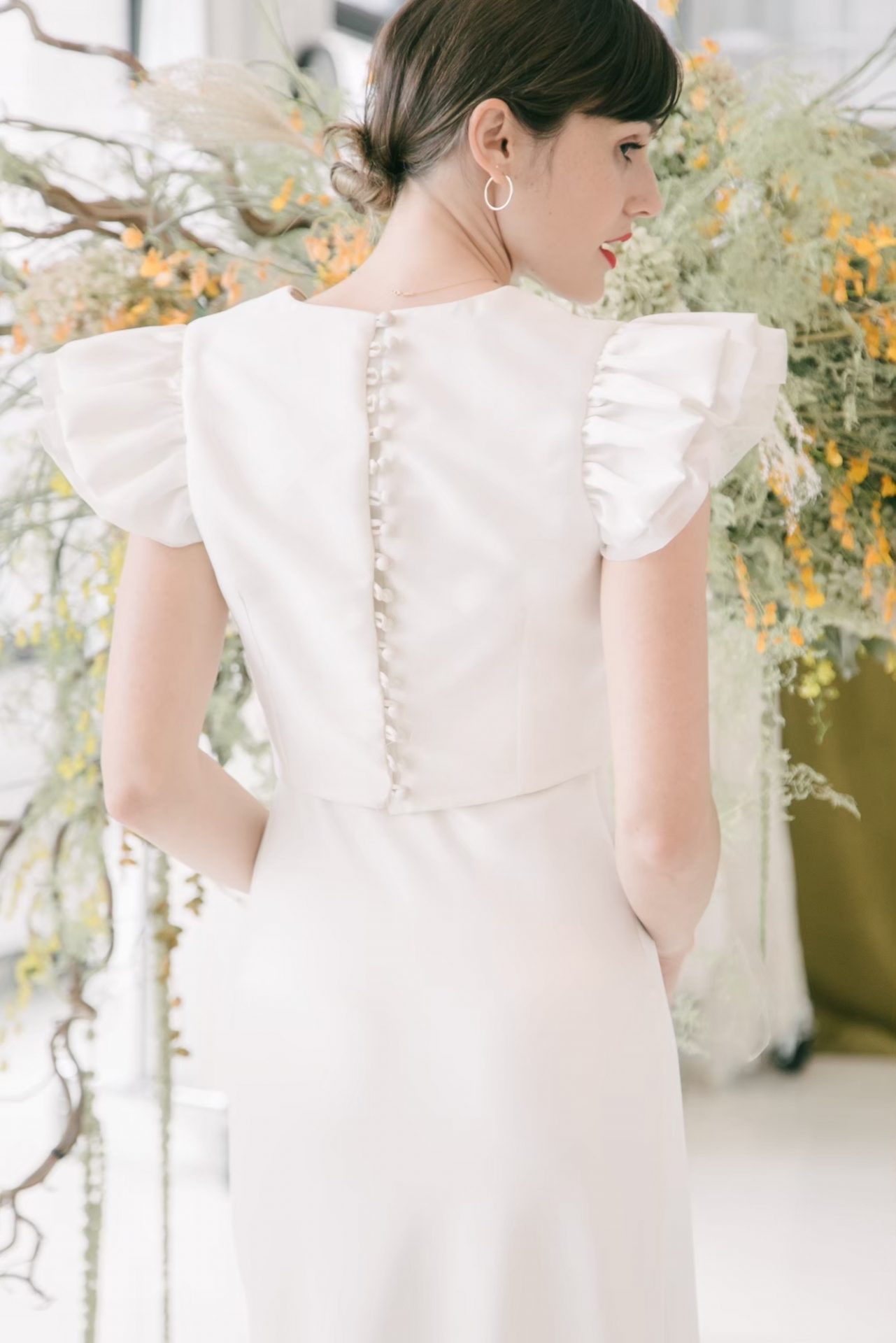 艶やかな光沢を放ち、滑らかな肌触りの素材で創られたセパレートドレス。袖にあしらったフリルと背中のくるみボタンが、ハーフペニーロンドンらしい遊び心を感じさせます。