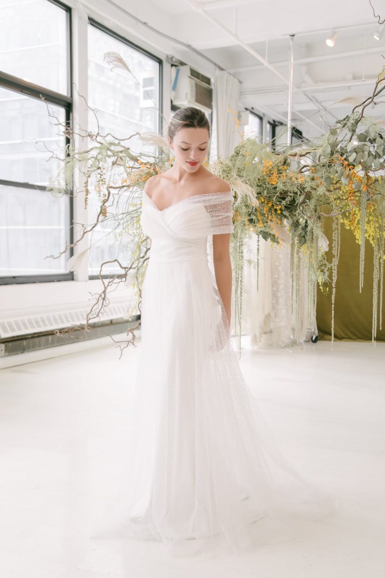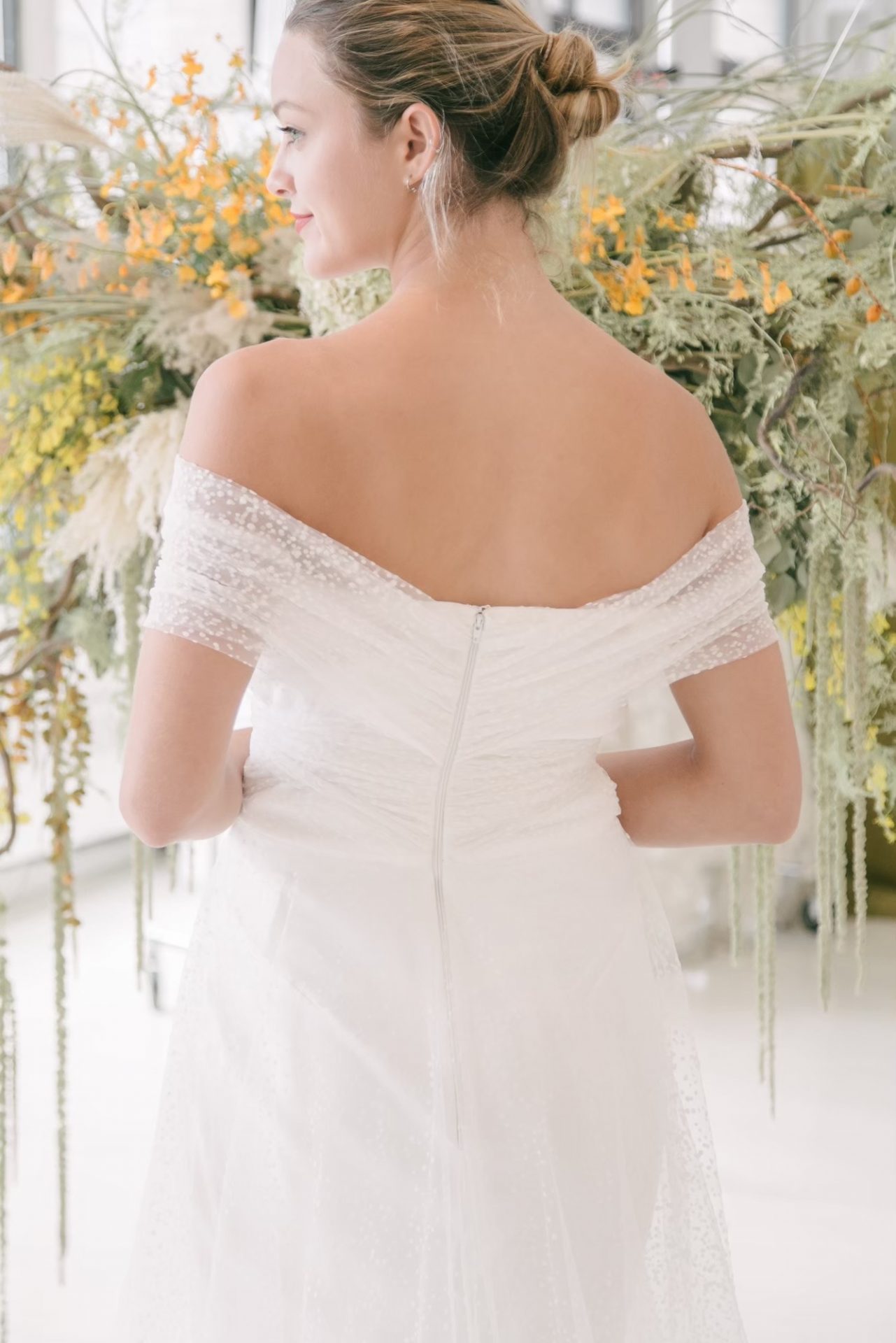 ドット模様をあしらった繊細なソフトチュールを使用したオフショルダードレス。エレガントさと、程よいぬけ感を感じさせてくれる1着です。