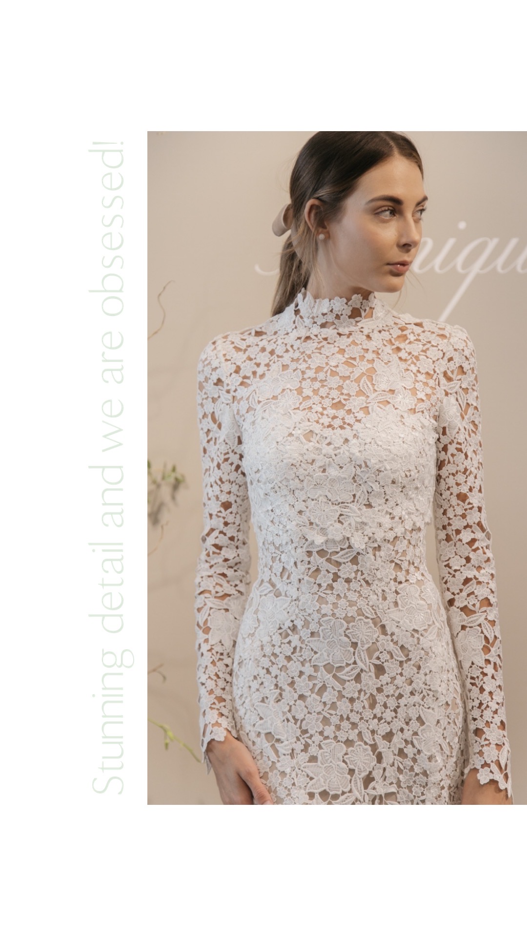 今コレクションのブランドLOOKが撮影されたのは イタリアのCOMO湖のほとりにあるVilla Garden。歴史あるヨーロピアンな建物に合いそうな 重厚感のあるレースが多く見受けられました。まるで絵画を思わせるような くっきりと模様が浮かび上がる大柄のレース。これは他ブランドをみてもウェディング業界の2020年FALLコレクションのトレンドの一つだといえます。