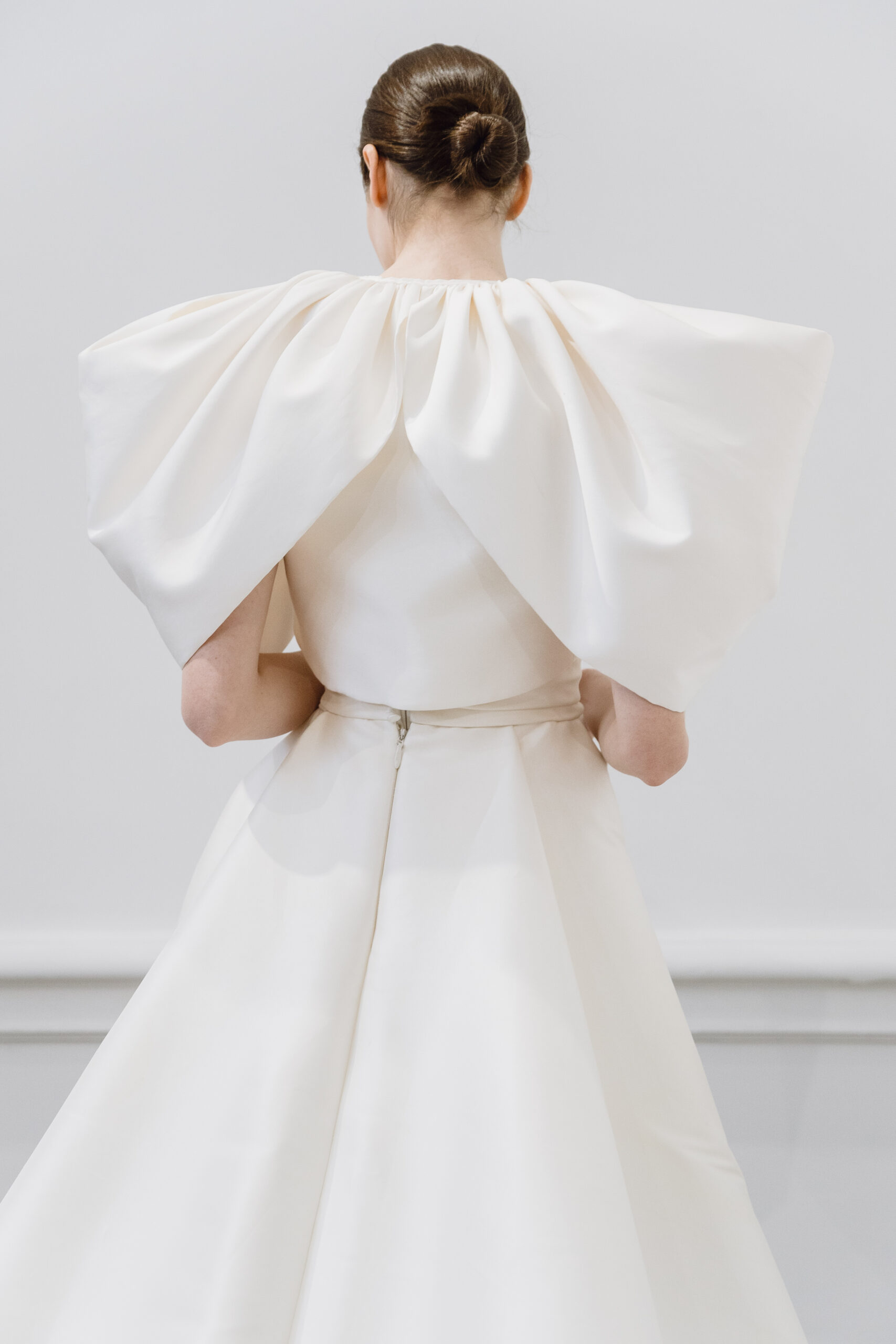 昨年までのビッグパフスリーブのトレンドは落ち着きをみせ、背中の中心にエアリーかつビッグシルエットなリボンが施されたデザインが今期様々なブランドに見られました。
