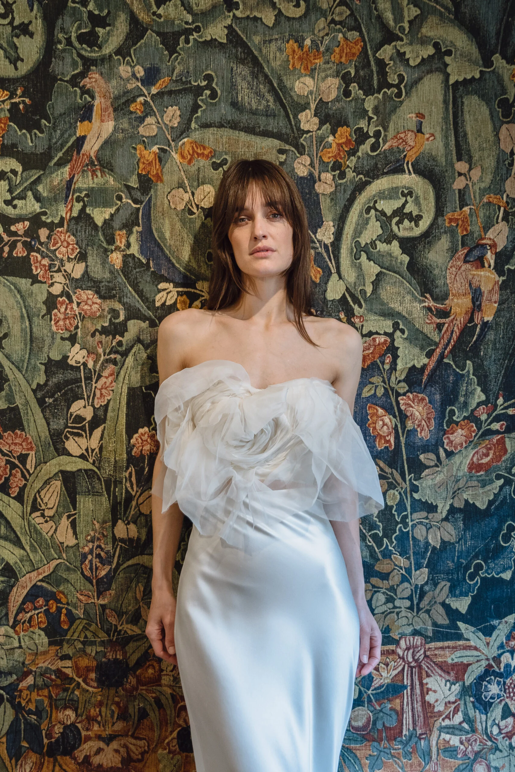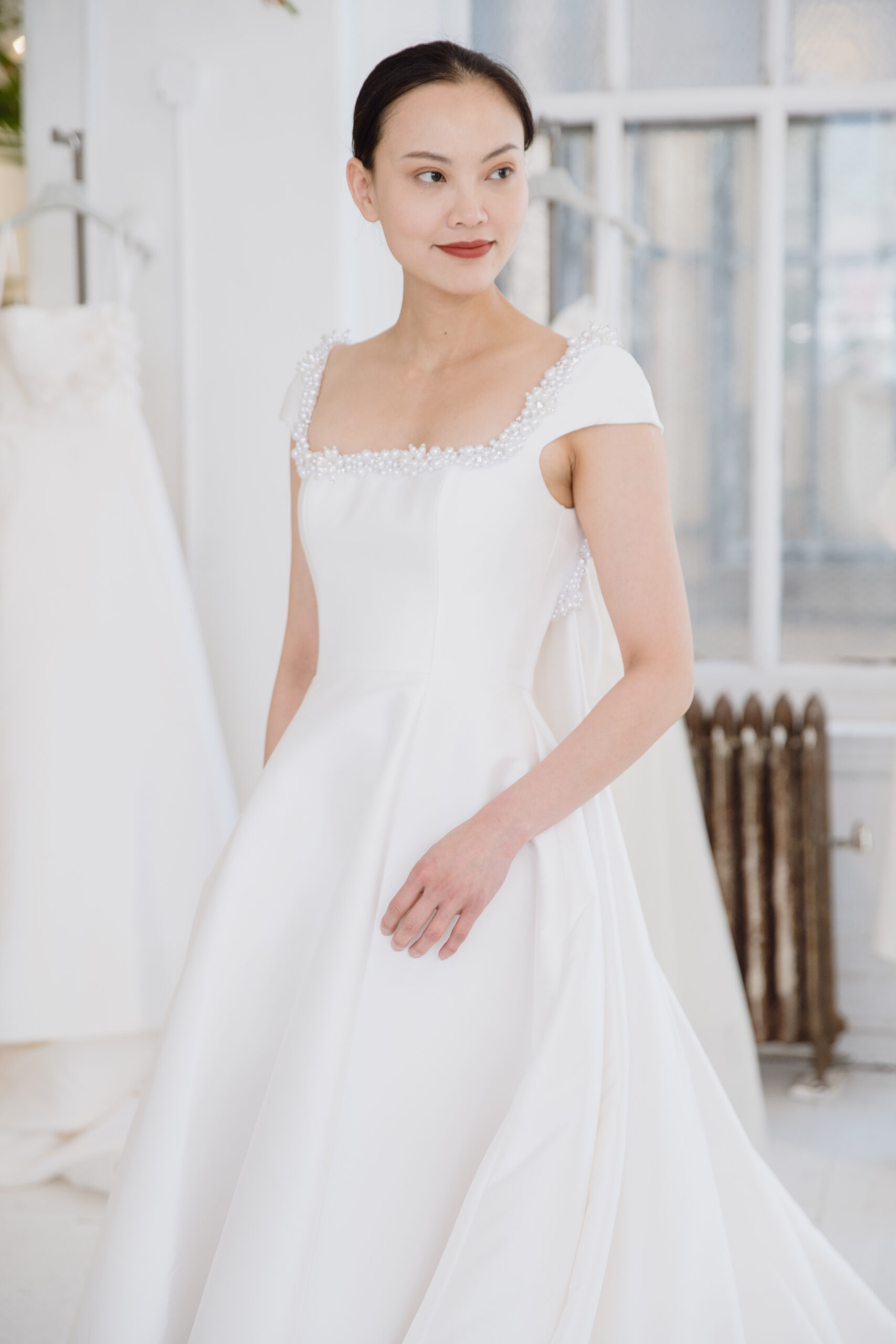 ウェディングドレスのみならず様々なファッションブランドでも発表されている、デコルテが大きく開いた深めのスクエアネックライン。ポイントはバストトップ上まで開いた深めのネックラインに、細いショルダーラインを掛け合わせたデザインです。今勢いのある中東ブランドの中でも圧倒的なスピードで人気を高めるLIZ MARTINES(リズ マルチネス)。イスラエルに全ての拠点を構え自社のアトリエでドレスを製作するリズ マルチネスは、シャープなスクエアネックラインとフェミニンなアップリケの掛け算が新鮮な、Aラインのウェディングドレスを発表しました(写真1枚目)。同じく中東ブランドのMira Zwillinger(ミラ ズウィリンガー)より発表されたウェディングドレス(写真2枚目)。本コレクション「Awakening」の目覚めを感じさせる、開花したレースが宙を舞うかのようなロマンティックなデザインに魅了されました。