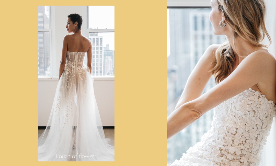 ひとつひとつ丁寧にあしらわれたお花たち。ここ数年のロングトレンドでもあるモチーフですがオスカー・デ・ラ・レンタのフラワーモチーフは高度なクチュールテクニックが生み出すもの。長い歴史を持つビッグメゾンだから創りだすことのできる美しいウェディングドレスの数々これはまさにオートクチュールです。