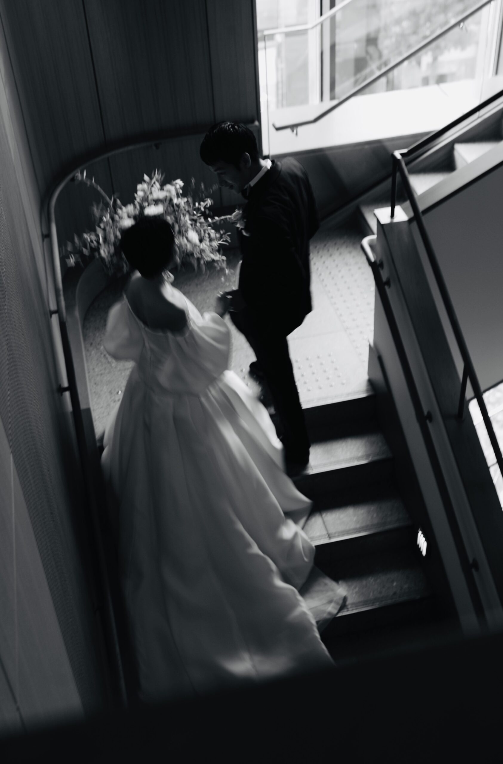 二着目はMonique Lhuillier(モニーク ルイリエ)のパフスリーブのドレス。ボリュームのあるパフスリーブが上半身をより華奢に、且つファッショナブルに魅せてくれます。マルチにご活躍されている都さんだからこその、ヘアメイクやアクセサリーをチェンジしながらシーンに合わせた着こなしを楽しんでいただけるドレスでした。ルーフトップでの挙式では、シルクガザルの柔らかな風合いが秋風をはらみながら、お二人の尊い誓いの瞬間を、温かな空気感で包み込むようでした。