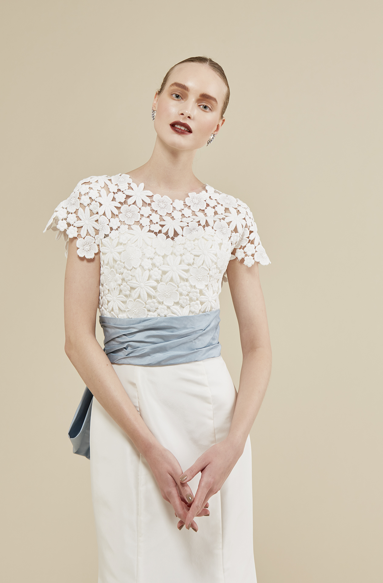 オフホワイトの存在感のあるぷっくりしたギュピールレースに、ボディーラインを美しく見せつつなだらかに広がるファイユ生地のマーメイドドレス。デコルテと背中のレースは透け感を出してすっきりと見せ、ゆとりのある袖のサイジングが肩周りを華奢に見せるところがポイントです。後ろ姿には、甘くなりがちなリボンモチーフをアシメトリーにし、タフタの生地であえてドラマティックに大きく結び、エレガントな印象に仕上げました。リボンは落ち着きのあるブルーと馴染みの良いアイボリーの二色展開で、取り外すこともできるため一着でスタイルチェンジもできます。フロントから見えるリボンのトレーンによって、どの角度から見てもドラマティックに魅せてくれます。ウエストマークをしたタフタリボンがスタイルアップ効果も期待できます。