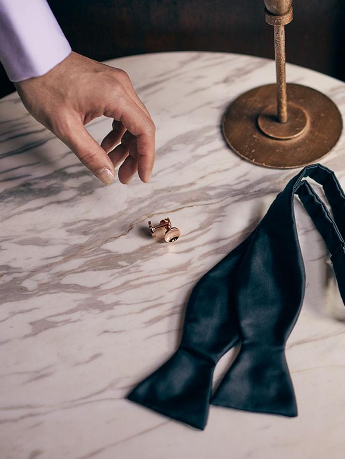 そして、ブラックのボウタイ、シャツには白無地のウィングカラーにダブルカフス、カフリンクスにはブラックオニキス。