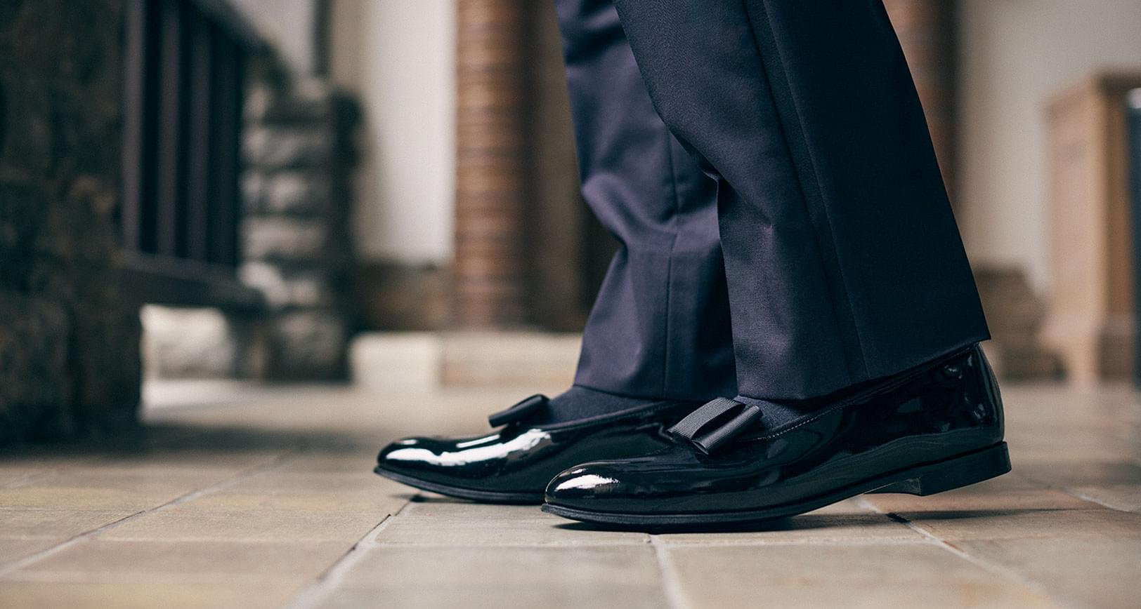 足元はエナメルのオペラパンプスで整える。