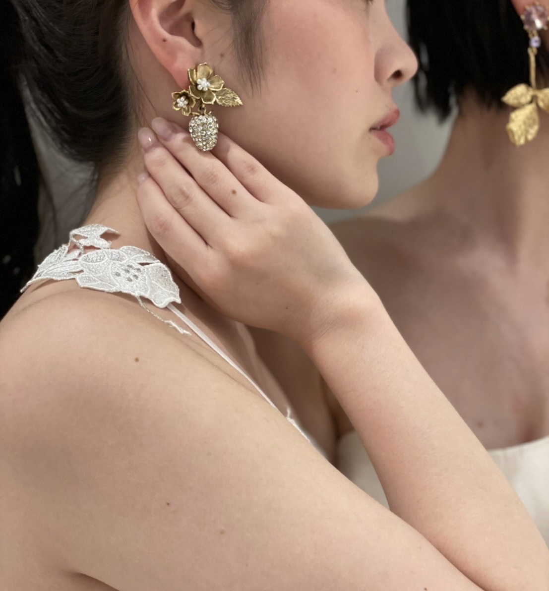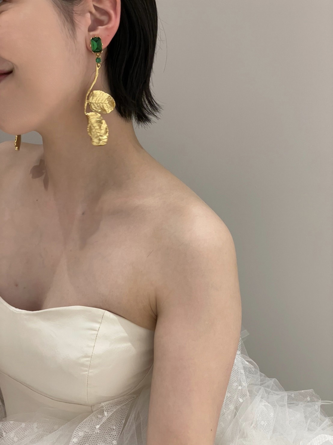 リーフがモチーフとなった丸みのあるシルエットに、大振りのビジューがあしらわれたゴールドのアンティーク調のイヤリング。存在感はありながらも、印象的なデザインが重厚感のあるムードを漂わせます。アシンメトリーなイヤリングは、気品感じるデザインの中に、どこか大人な余裕も感じさせます。柔らかいアイボリーのウエディングドレスに、あえてヘッドパーツは何も付けずこちらのイヤリングを合わすことで都会的で洗練されたコーディネートを叶えます。主役に相応しい高級感あるラグジュアリーな雰囲気が、ゲストの方の視線も虜にします。