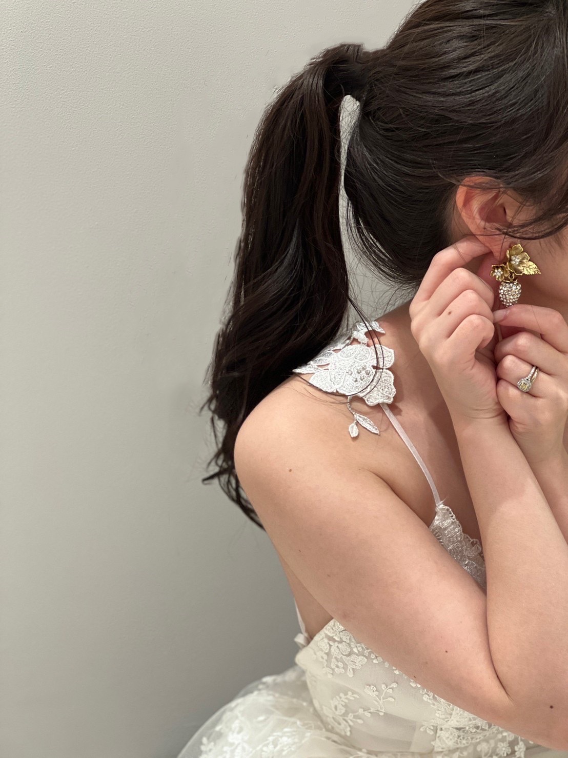 胸元と袖にチュールのプリーツが重なった動きのあるウエディングドレスにこちらのイヤリングを合わせると、ゲストの印象にも残るキャッチーでモダンなブライズスタイルを叶えていただけることでしょう。