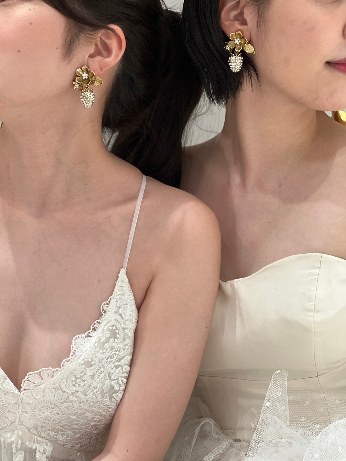 マットなゴールドの小花と繊細な輝きを放つシルバーのストロベリーモチーフのイヤリング。他では出会っていただけない可憐なストロベリーモチーフが女性ごころくすぐるデザインです。小花には深みのあるゴールドの色味を使用しているからこそ、愛らしいデザインでも決して甘くなりすぎずにモダンさをプラスしてくれます。お顔周りに付ける大切なアイテムだからこそフェミニンさの中にも遊び心を忘れないデザインで、新婦様の表情を明るく照らしてくれます。ストロベリーのモチーフが耳元で揺れ、緑が美しいガーデンウエディングや、シックな雰囲気のレストランウエディングにもぴったり。