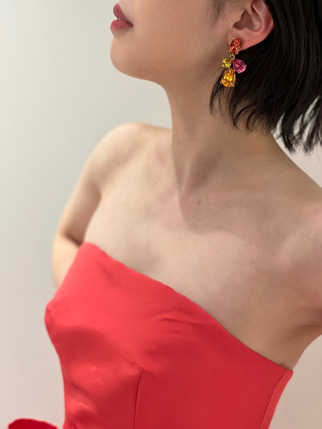 オレンジやピンク、イエローなどの透き通るような色味が印象的なドロップイヤリング。大粒のクリスタルが上品に煌めき、柔らかな光を放ちます。ハリのあるシンプルなカラードレスに合わせるからこそ、特別な存在感を放ち洗練された芯のある美しさを表現してくれます。大切なゲストの皆様と心躍る時間を過ごしていただく披露宴。ゲストの皆様と近い距離でお食事や会話を楽しんでいただくからこそ、透明感ある鮮やかな色味がエレガントな印象を与え、特別な1日を華やかに彩ります。窓から差し込む自然光に触れたとき、その上品なクリスタルの輝きに魅了されることでしょう。
