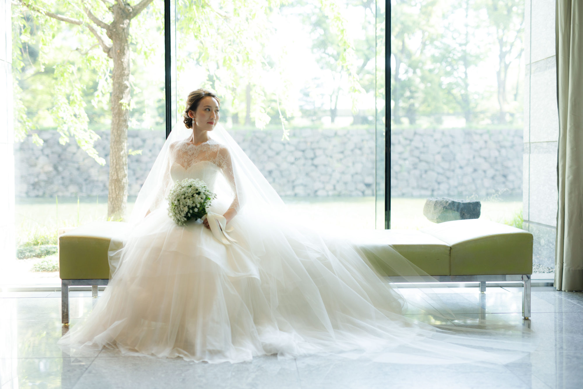 柔らかな光がさすパレスホテルでチュールのウェディングドレスにロングベールを合わせて