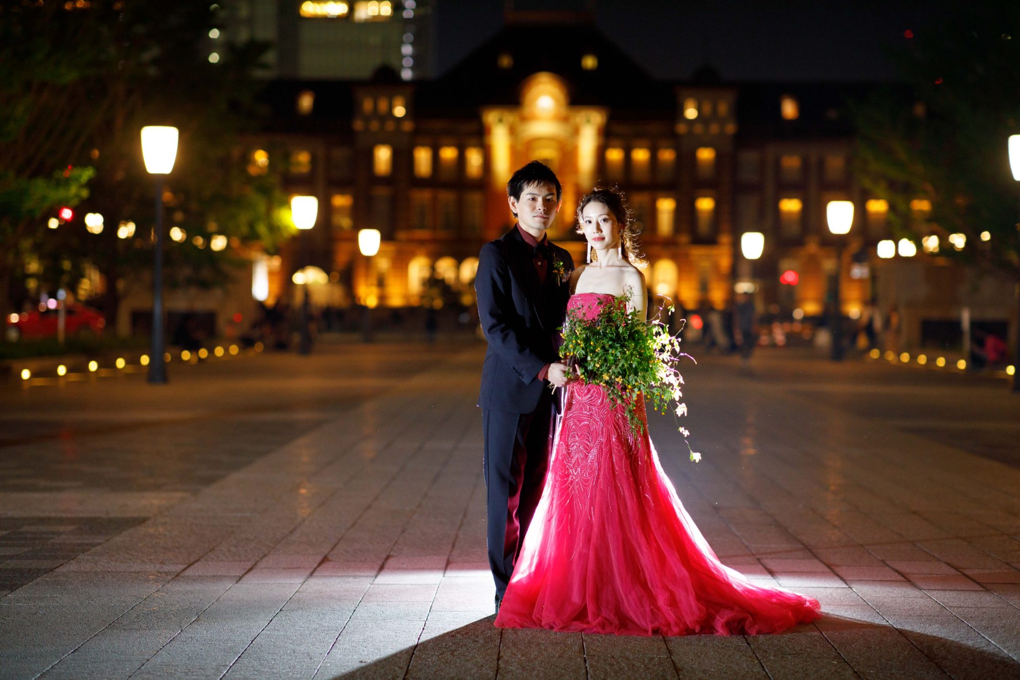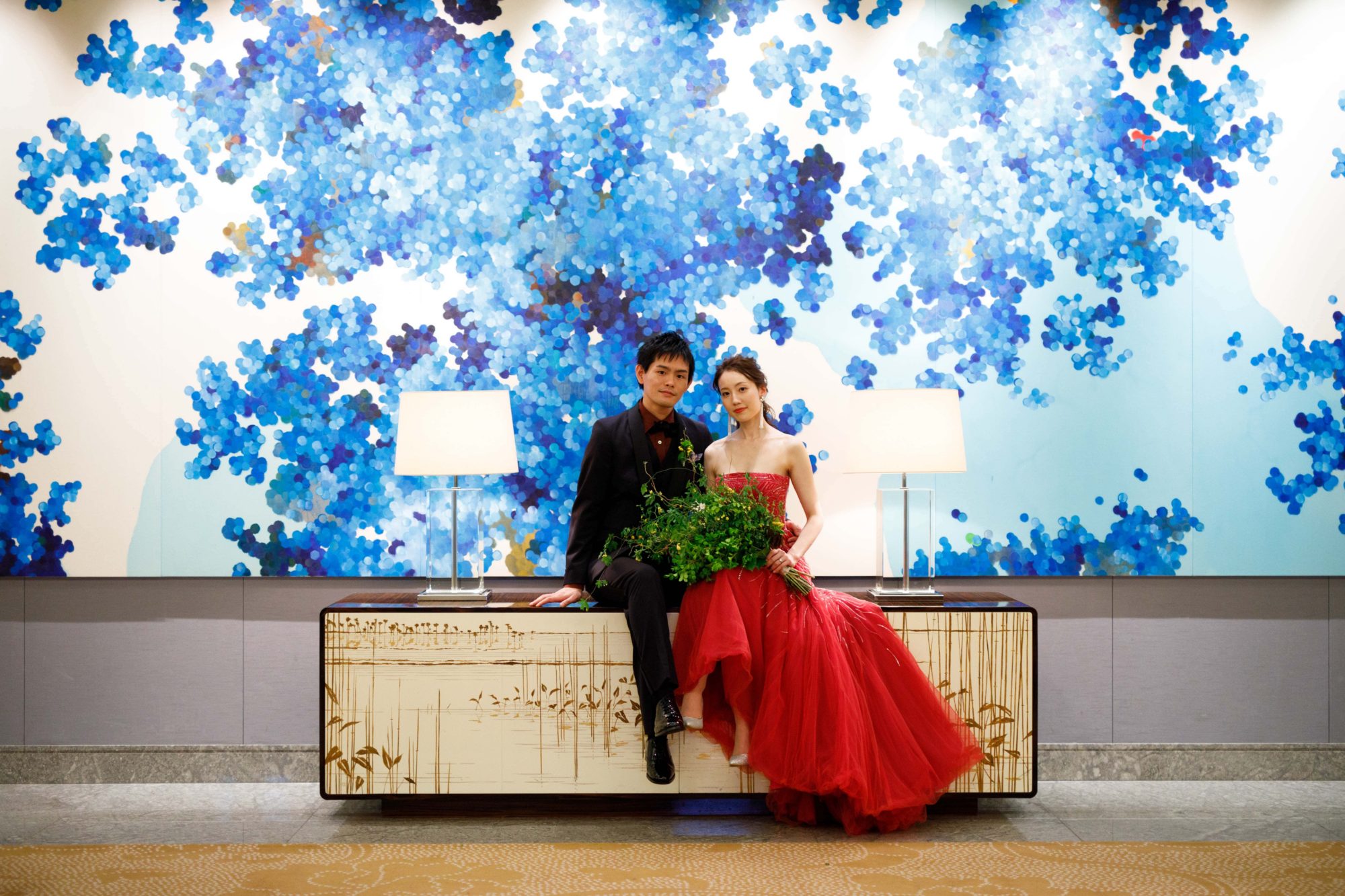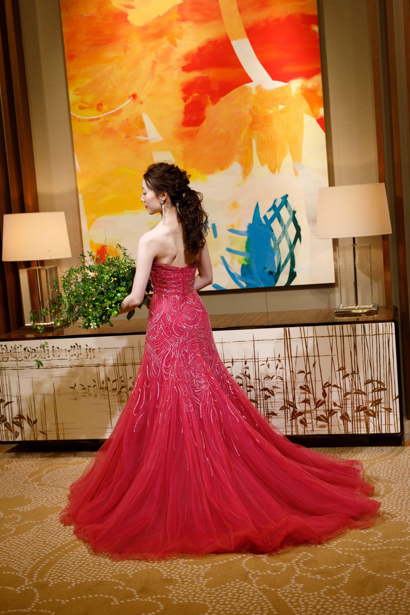 パレスホテルでモニークルイリエの赤のカラードレスとタキシードのおふたり