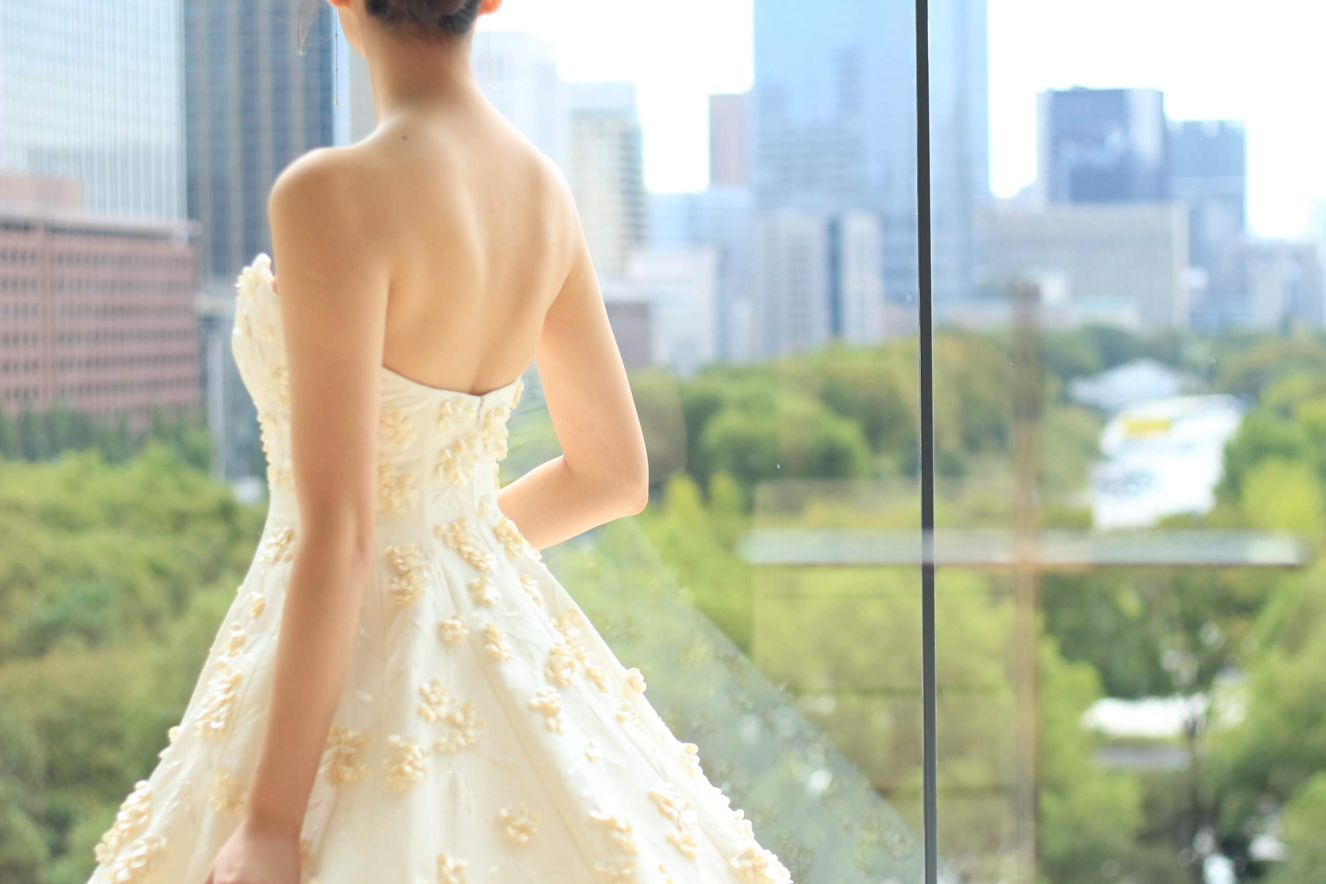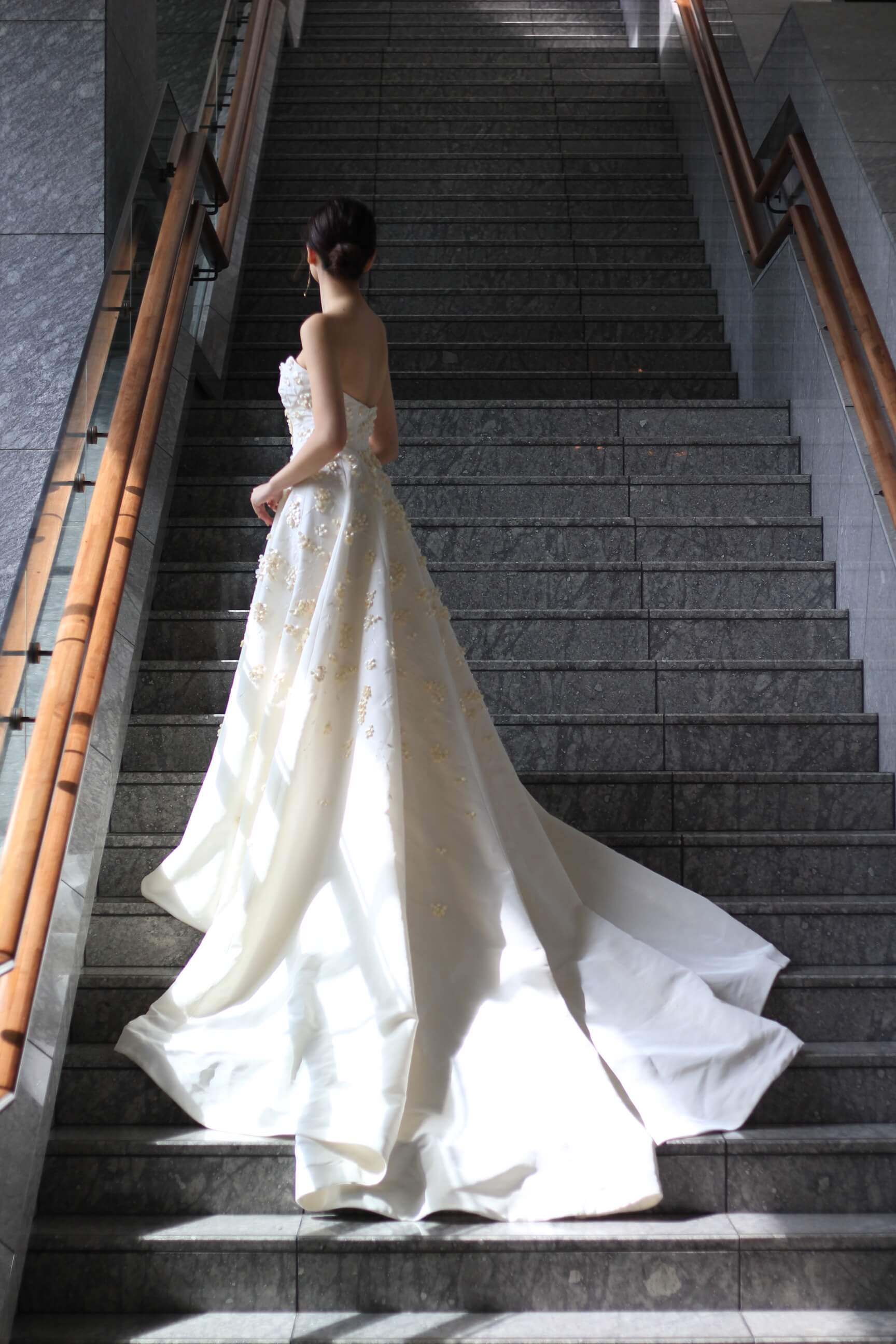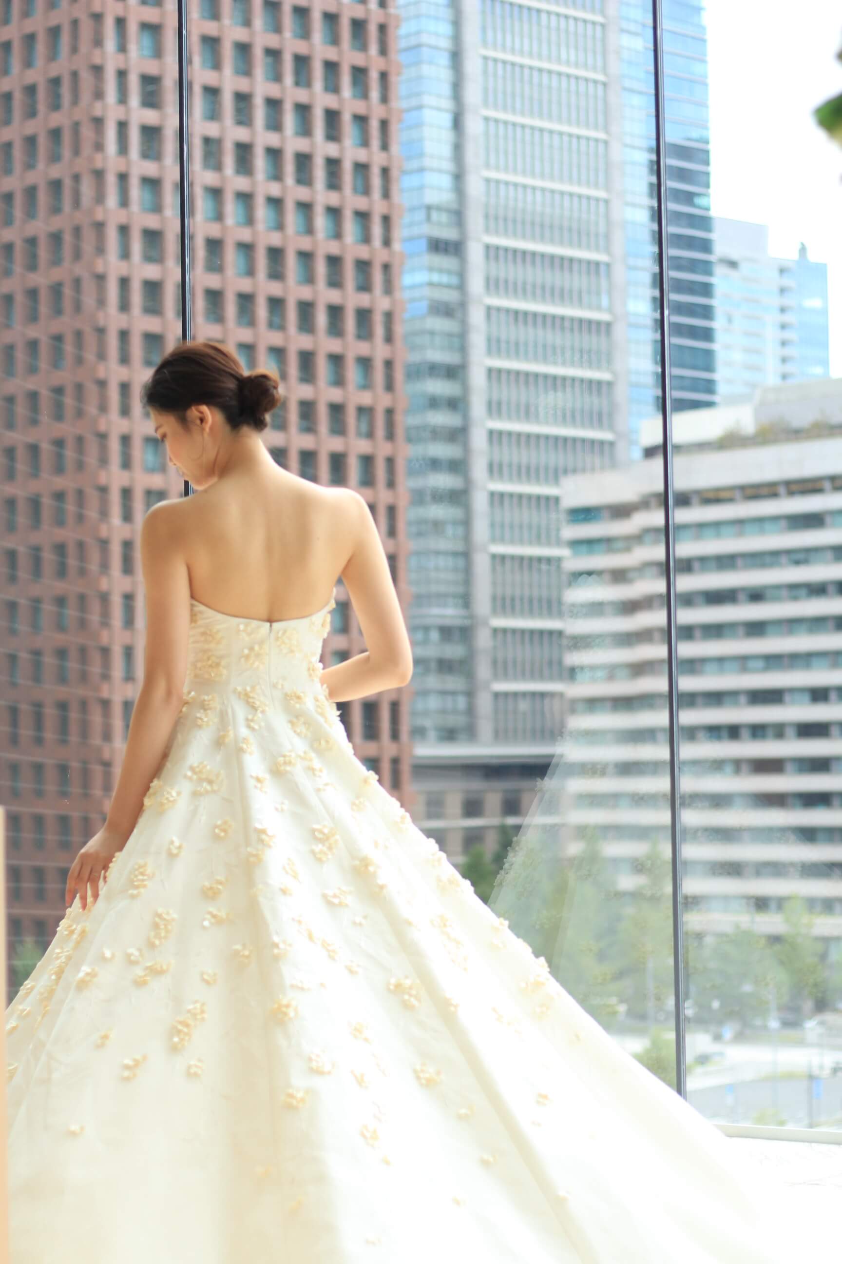 天井高なチャペルの構造と、高層ビルが立ち並ぶ風景にバランス良く映えるドレスです。