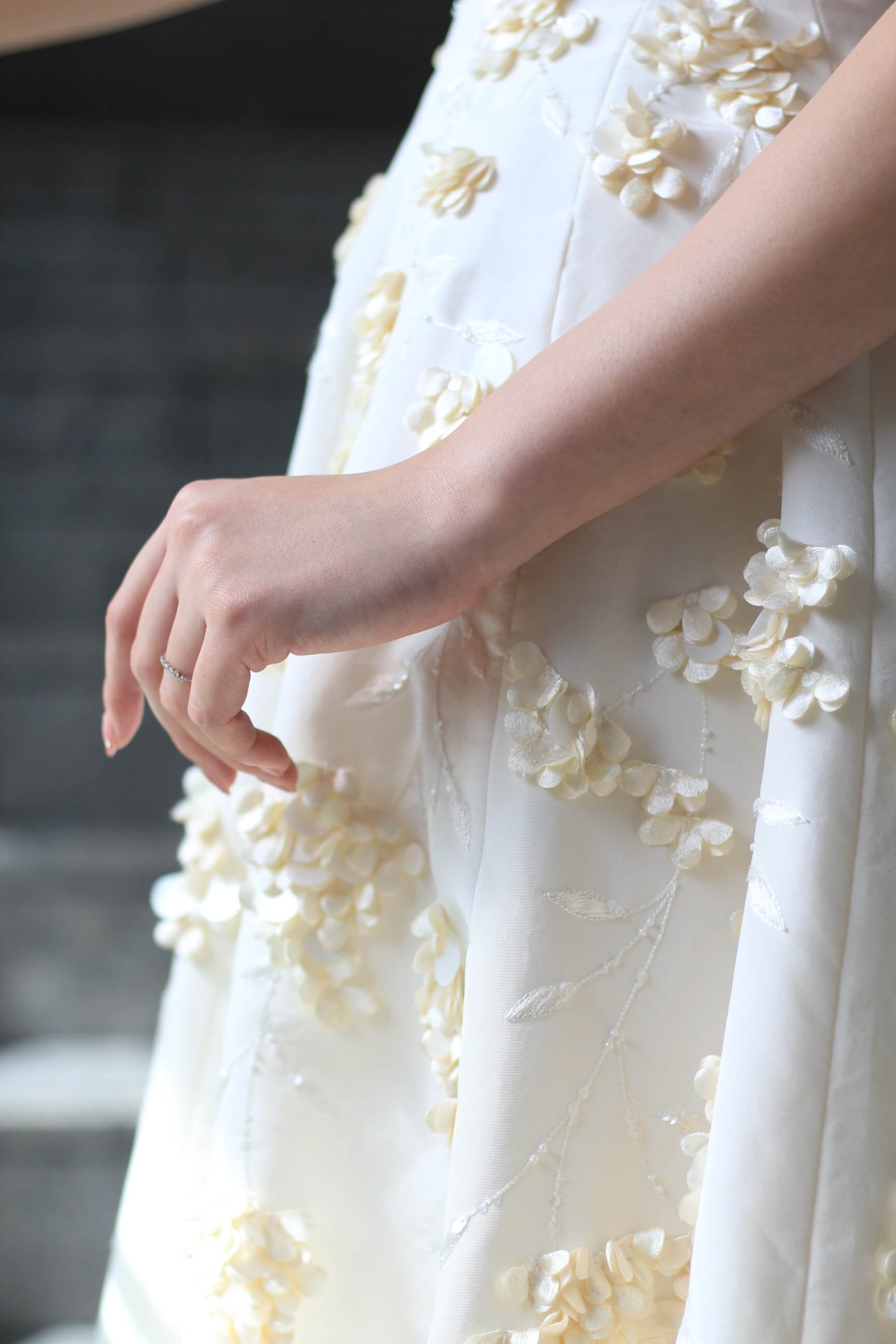 ハンドメイドで施されたモチーフが見事に咲き誇る胸元の装飾は、紫陽花をモチーフにしたもの。