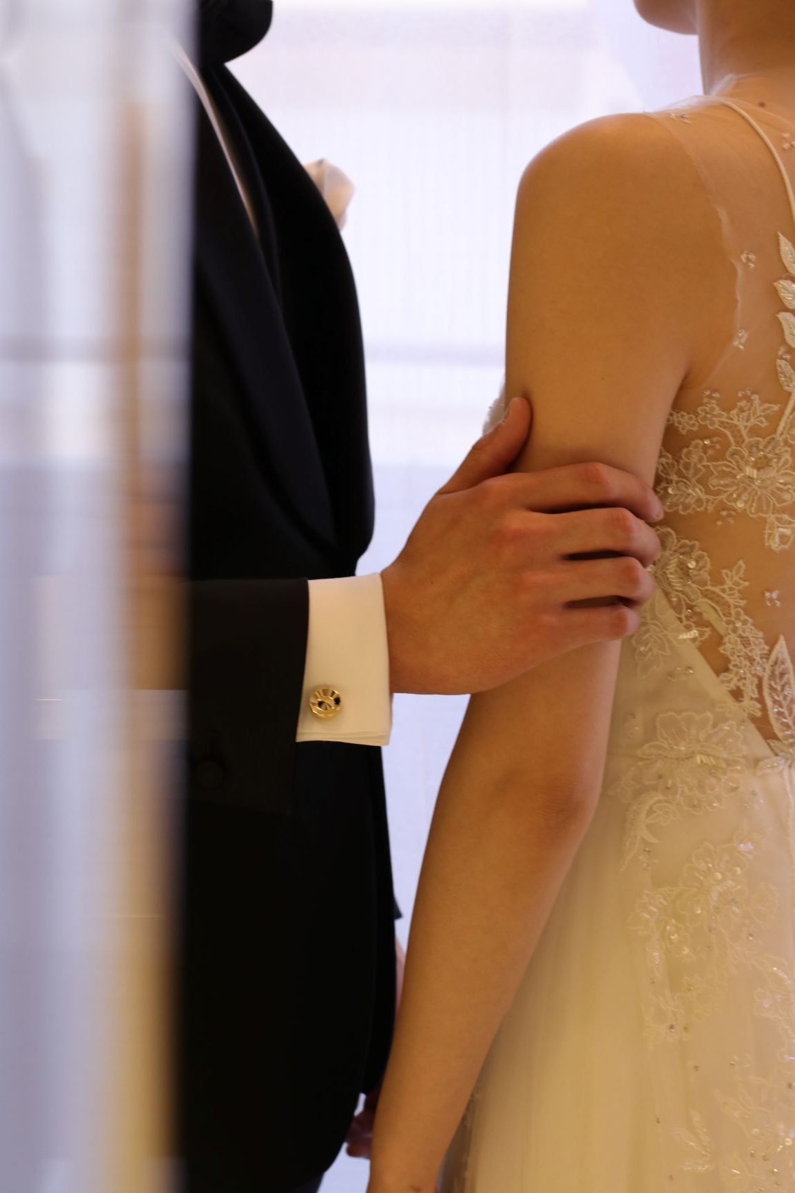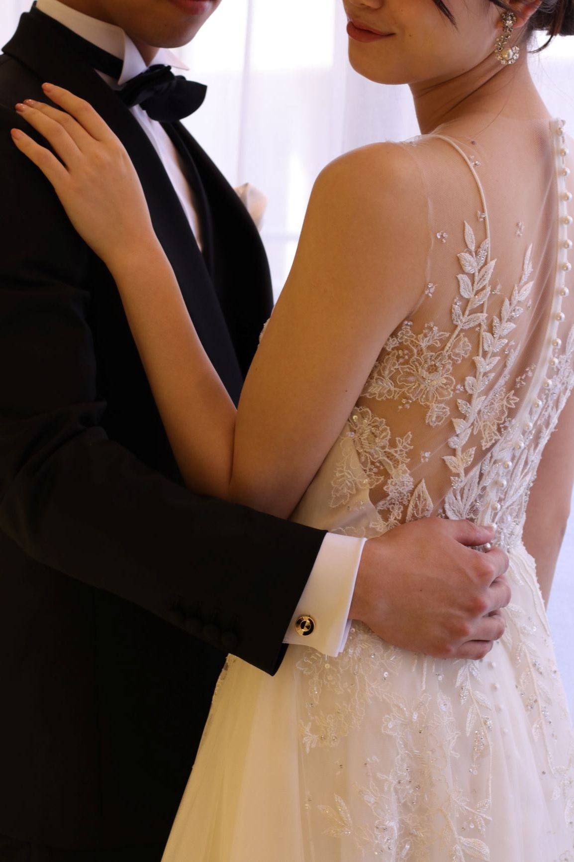 東京表参道のドレスショップ、ザ・トリート・ドレッシング アディション店では新婦様のウェディングドレスや結婚式場、お二人のテーマに合わせた新郎様のタキシードのレンタル、購入、オーダーが可能ですザ・トリート・ドレッシングおすすめの、柔らかい印象のチュール素材のウェディングドレスと、紳士的で格好良いフォーマルなタキシードを合わせた新郎新婦様のコーディネート