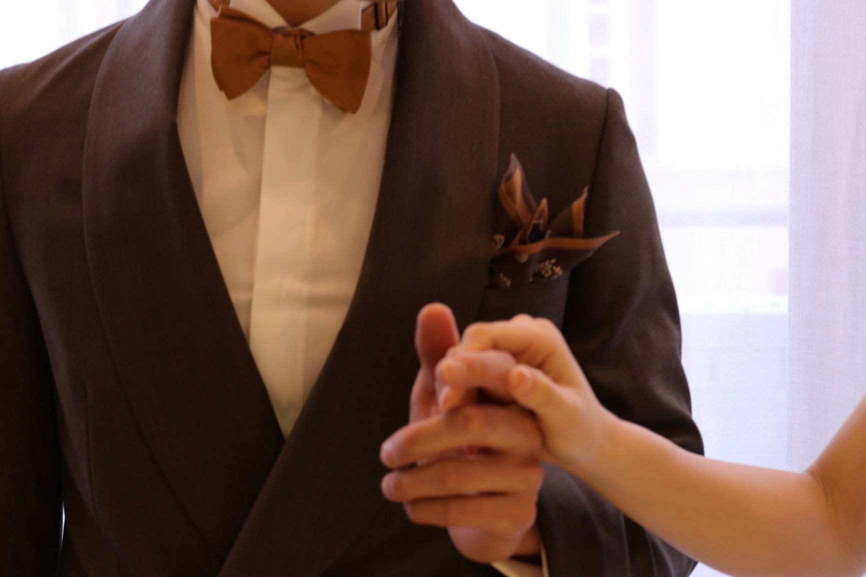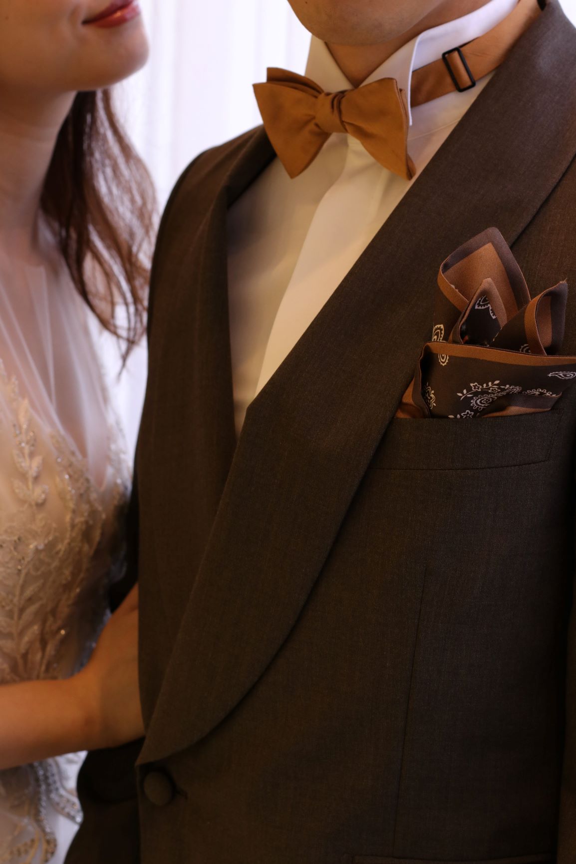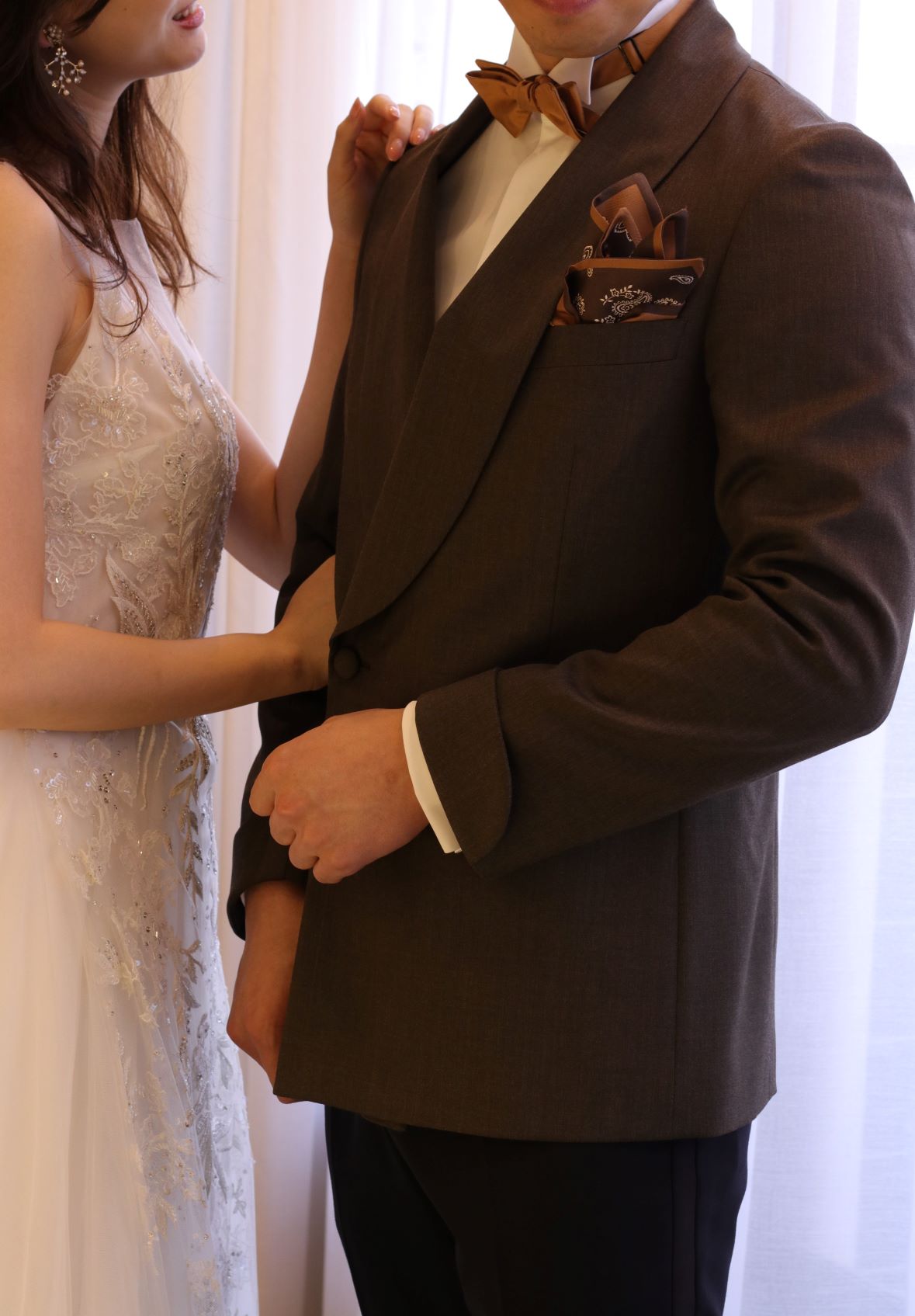 お色直しのタキシードは優しい印象のブラウンやベージュのお色味を合わせると、ナチュラルでアットホームな雰囲気とこなれたお洒落感が溢れ、THETREATDRESSING提携の赤坂プリンスクラシックハウスでもおススメしたいコーディネートです
