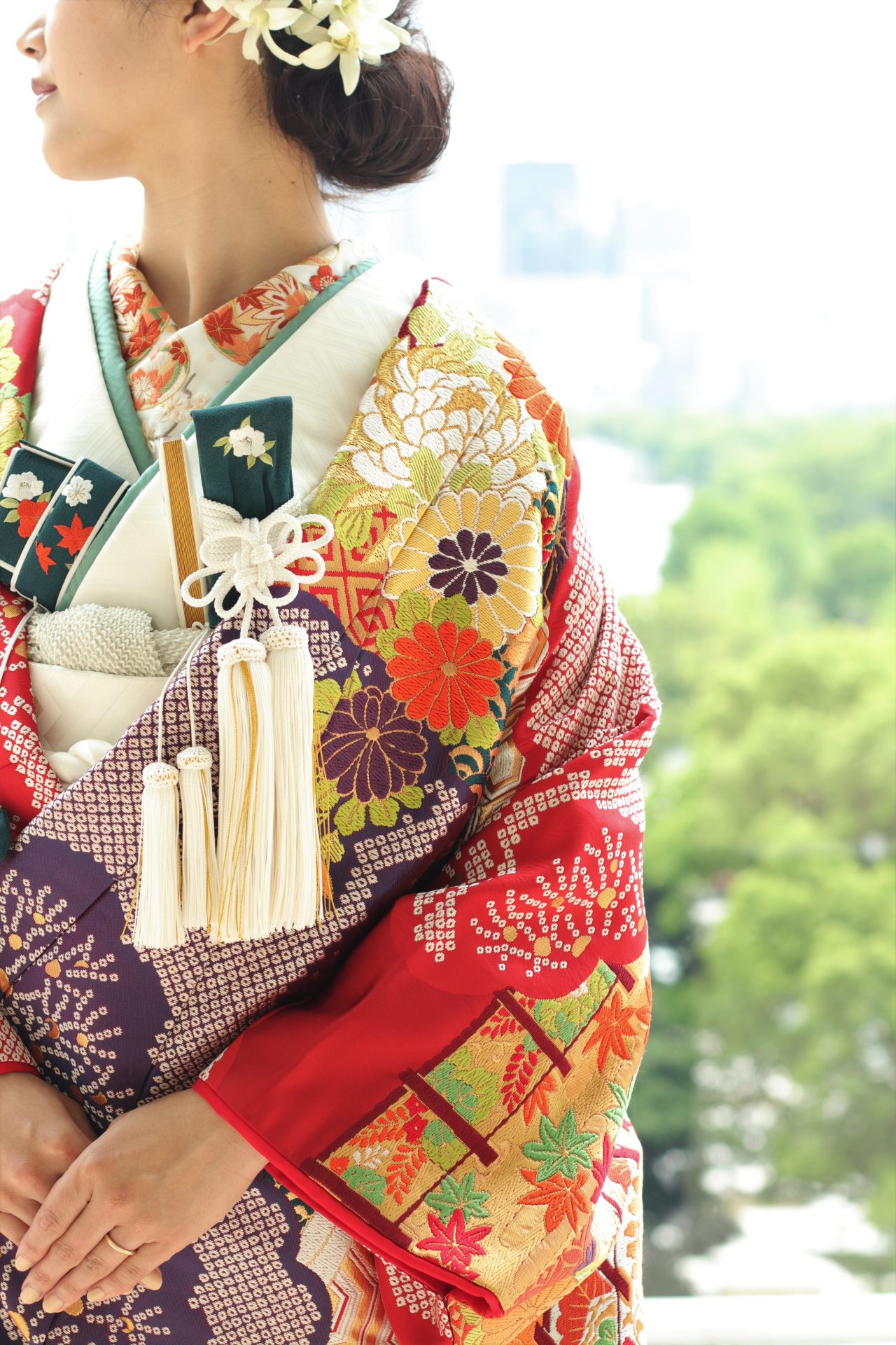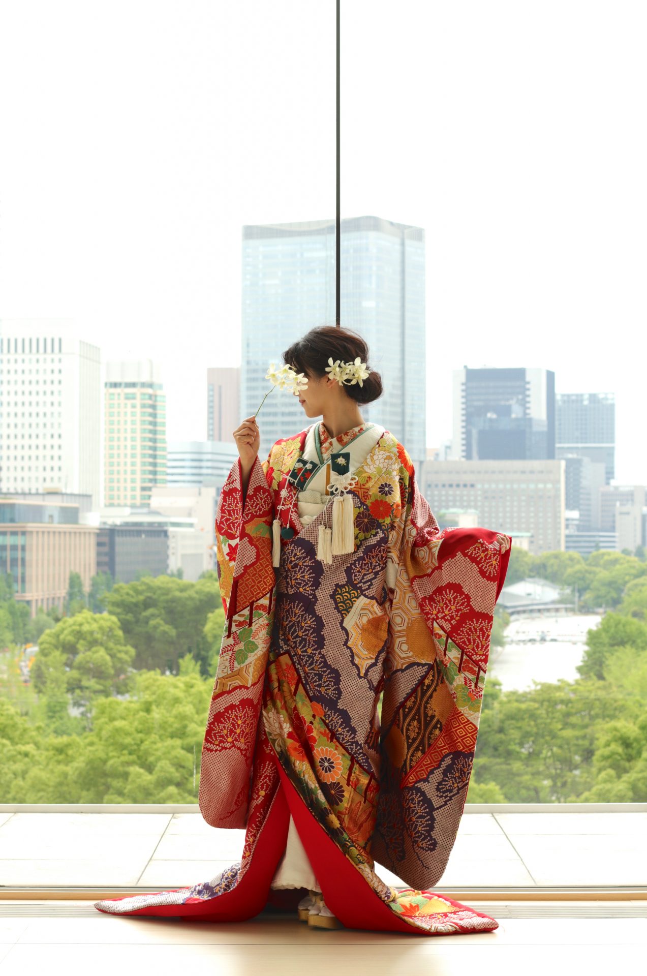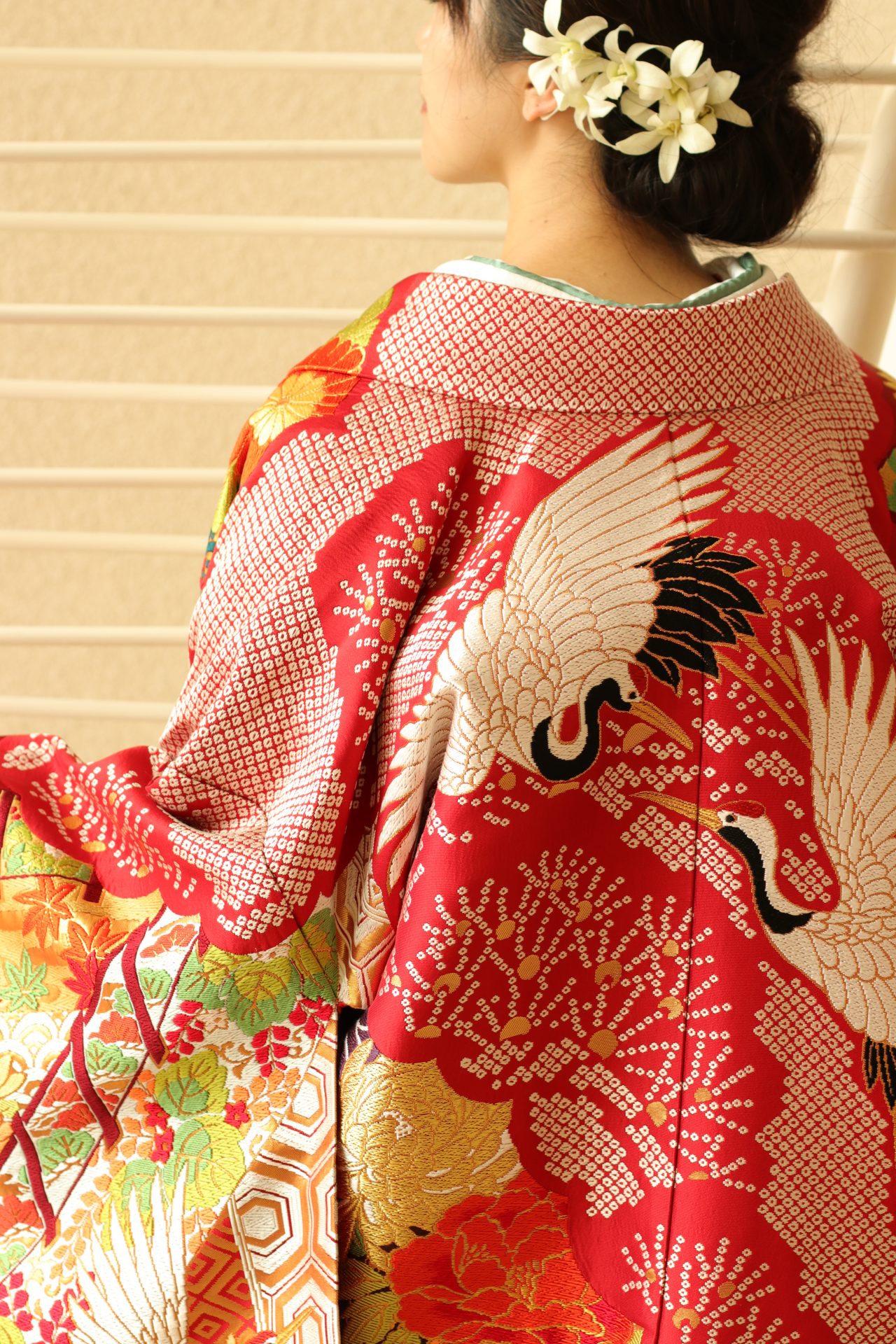 赤と藍色が目を引く、高貴な印象の色打掛。