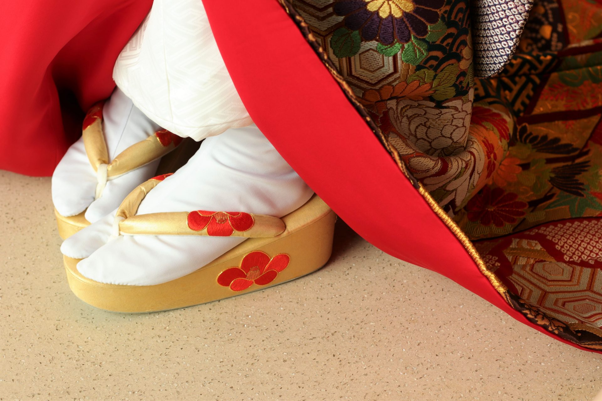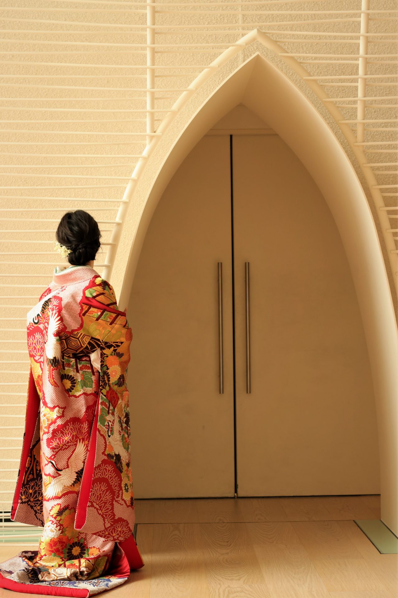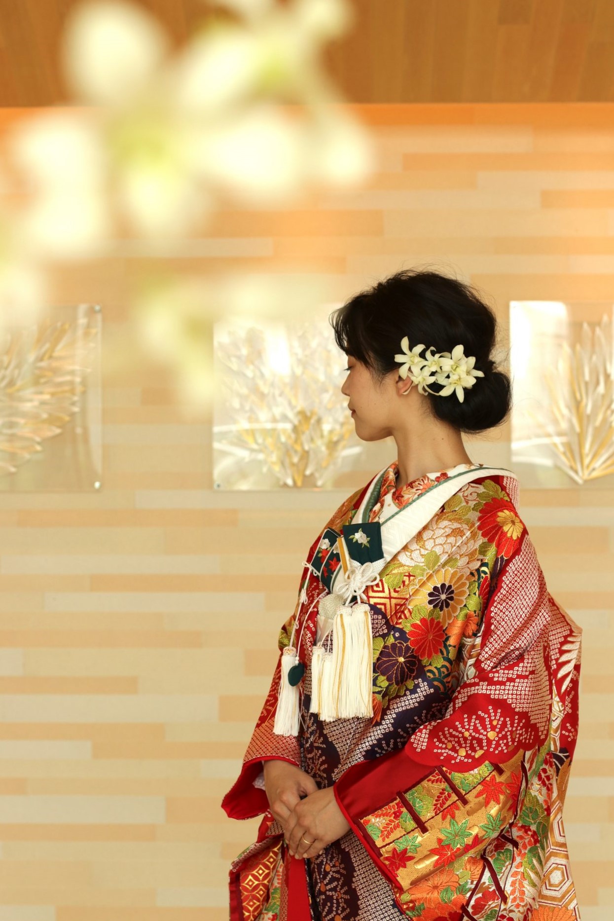赤と藍色が目を引く、高貴な印象の色打掛。