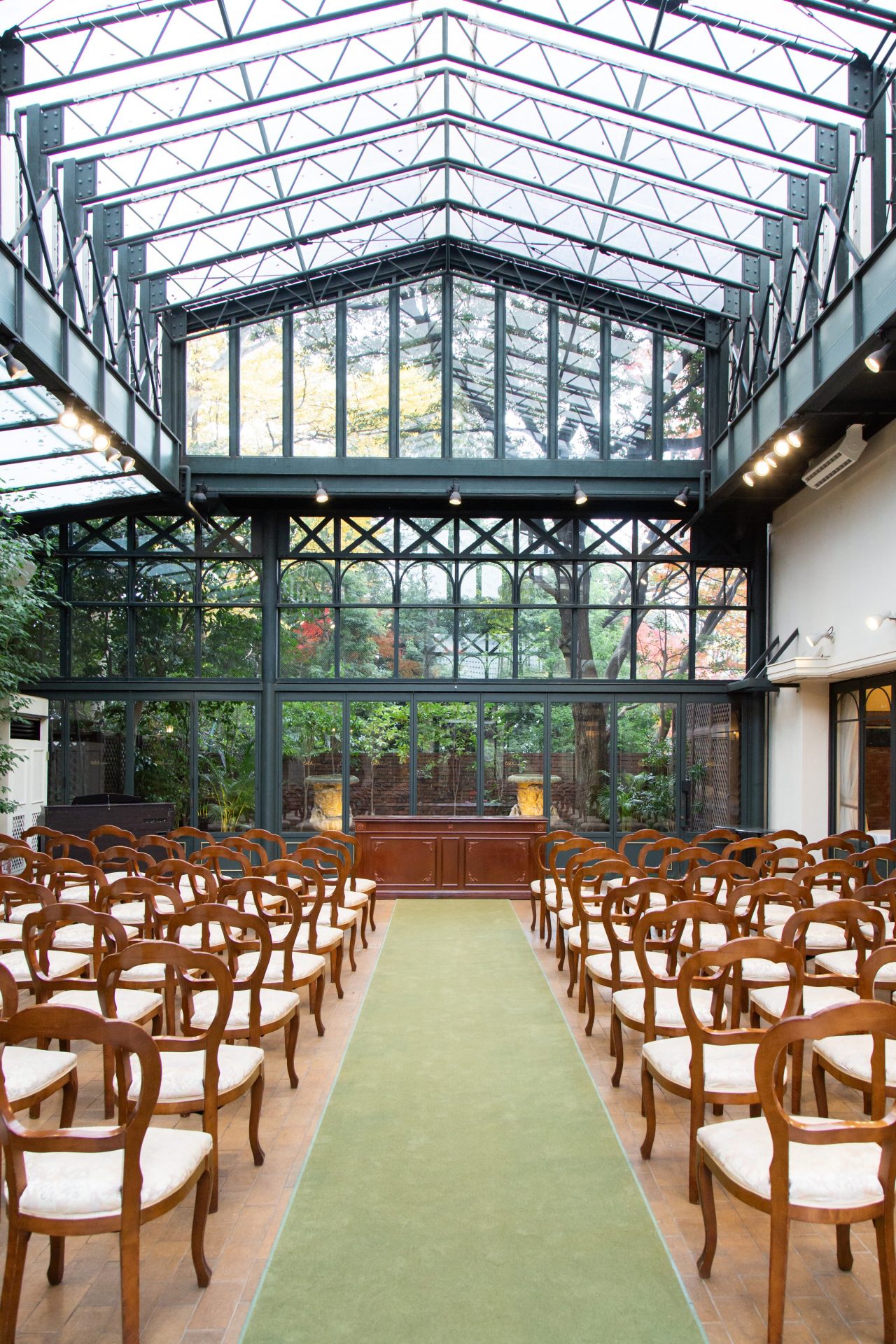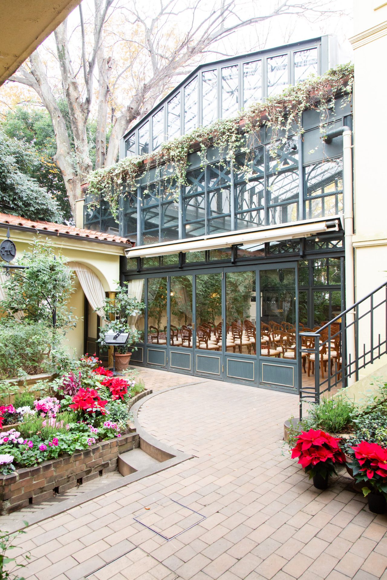 東京・代官山にあるリストランテASOの魅力は、常用樹林や季節の花が咲くガーデンの中にある天候に左右されないガーデンチャペルです。