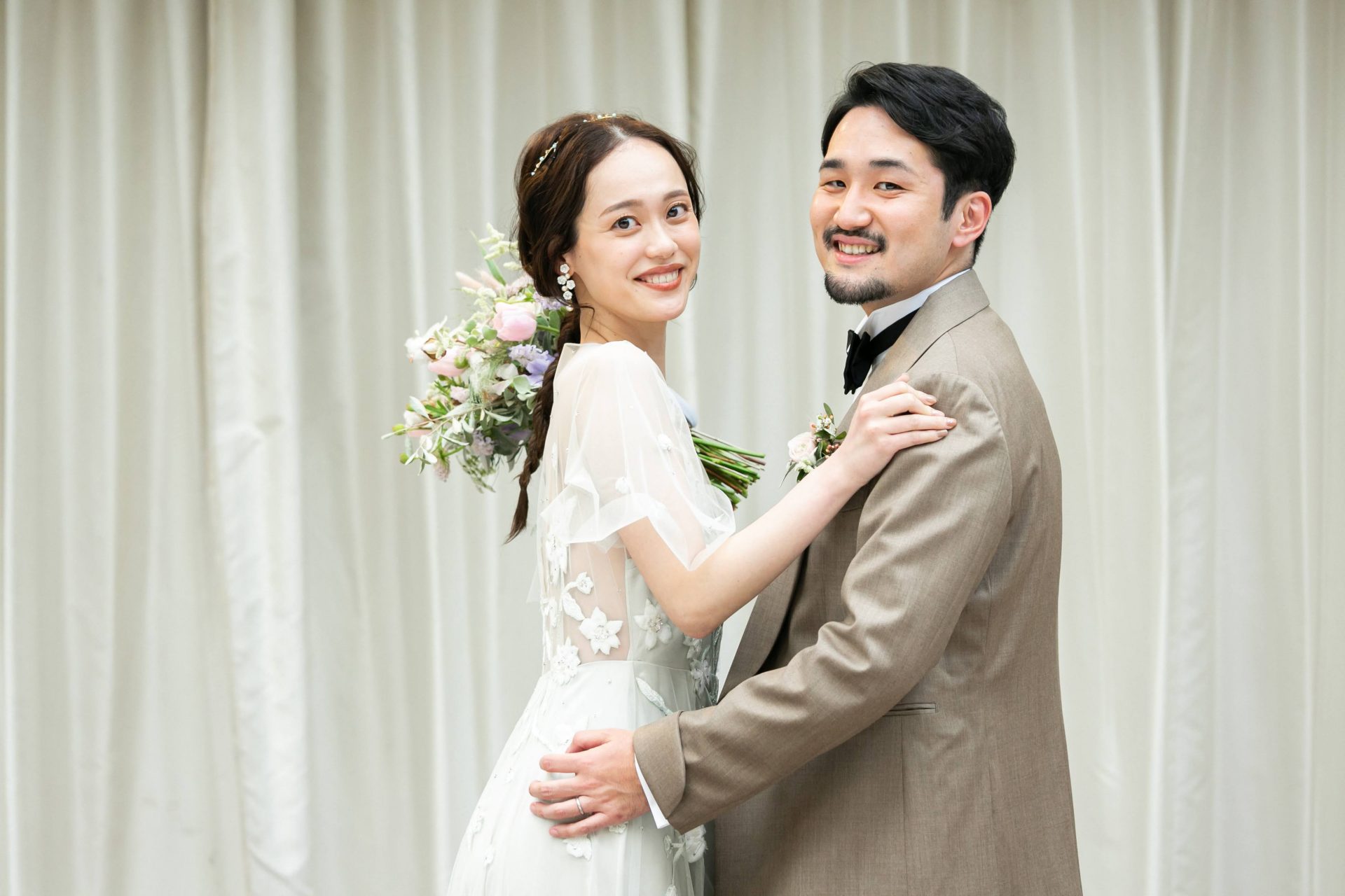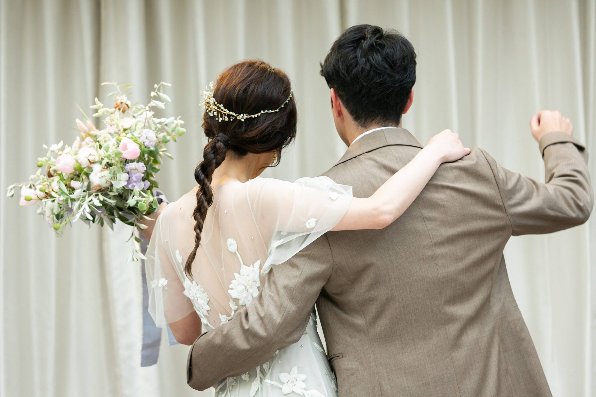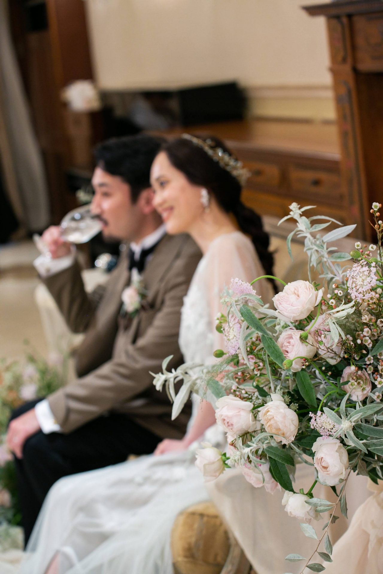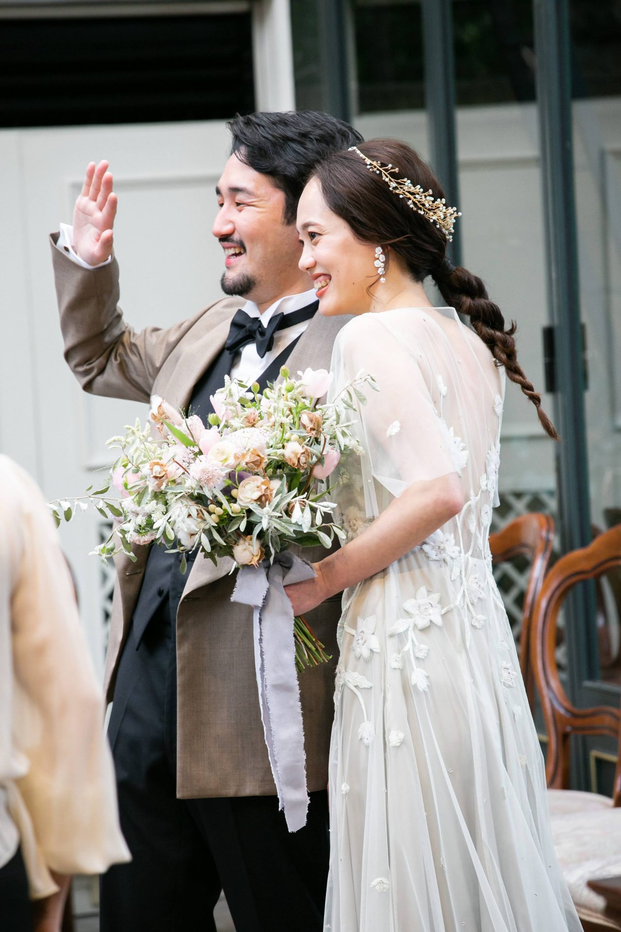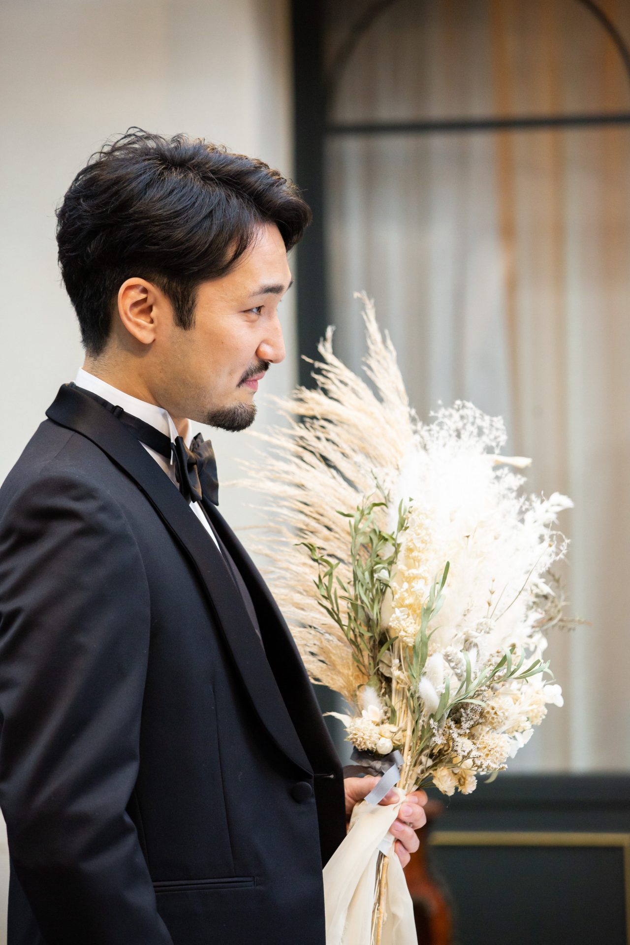 ご新郎様も、ご新婦様のお色直しに合わせてスタイルチェンジをしました。お色直しはご新婦様のためだけのものではありません。パステルグリーンのカラードレスに合わせて選ばれたのはベージュのジャケット。お二人らしい色味のコントラストはきっとゲストの方々の印象にも更に残るはずです。