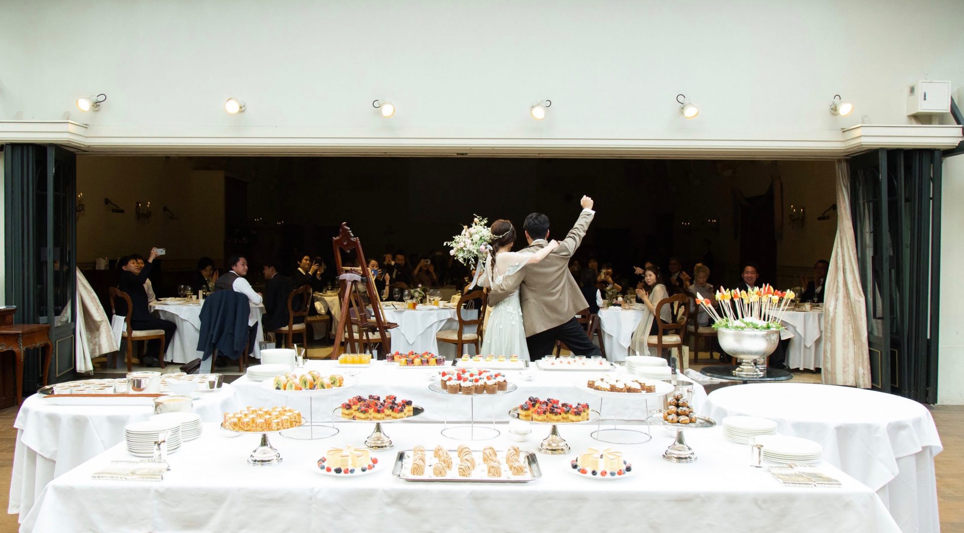 披露宴会場から続く空間は、つい先ほどまで過ごしていたガーデンチャペル。お二人の入場に期待が膨らむゲストの視線の先には、デザートビュッフェが。お二人からのクリスマスプレゼントに歓声が上がる様子に、思わずお二人からも笑顔が溢れます。スイーツを囲みながら、久しぶりに集う友人や家族との大切なひと時。スリットのきいたトレーンの控えめなカラードレスだからこそ叶えることのできた、自らゲストの近くへ歩み、楽しむご披露宴。たくさんの友人と盛り上がる光景は、初回のフィッティングでお話しされた、夢にまで見た結婚式の姿だったのではないでしょうか。