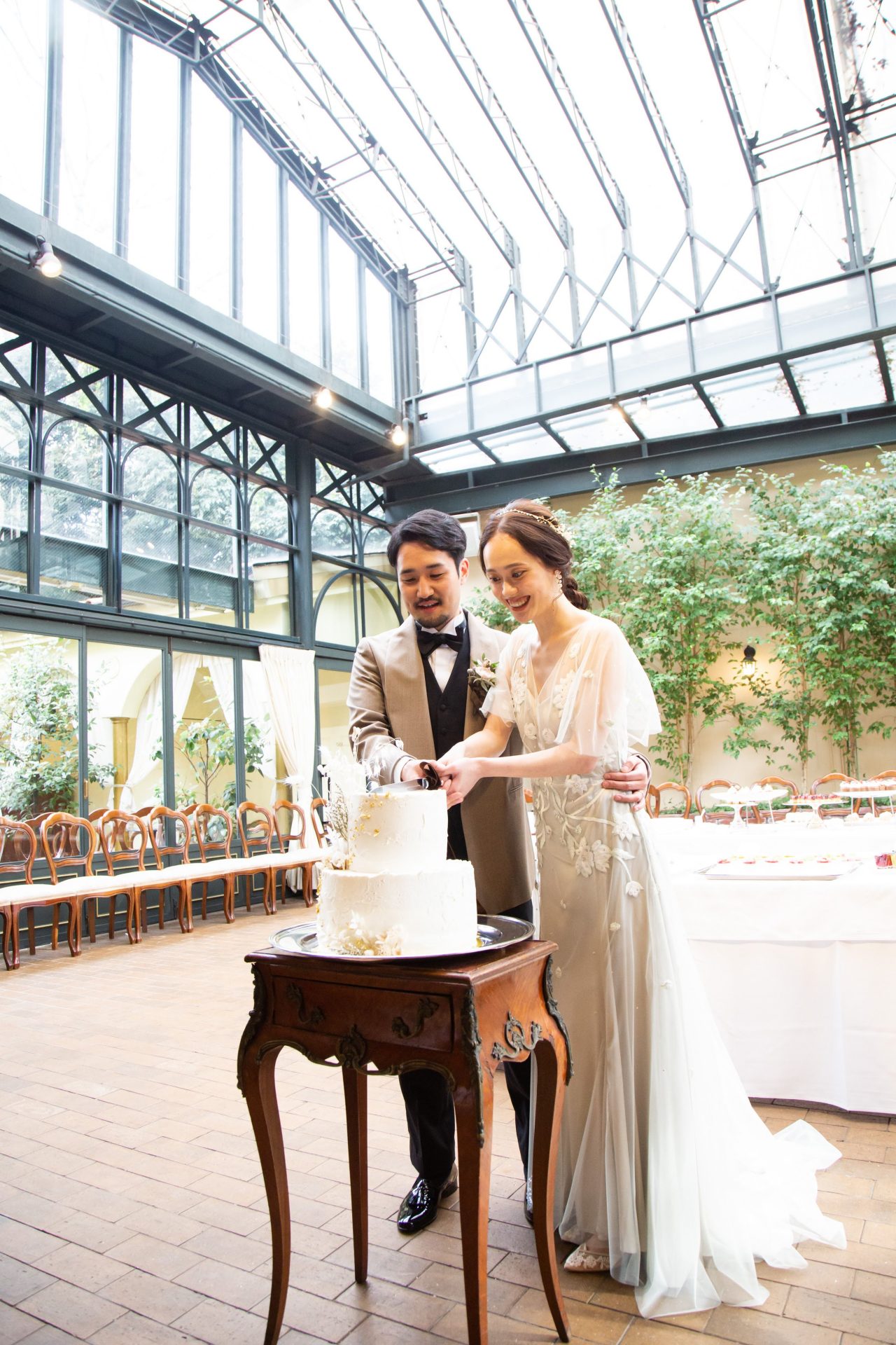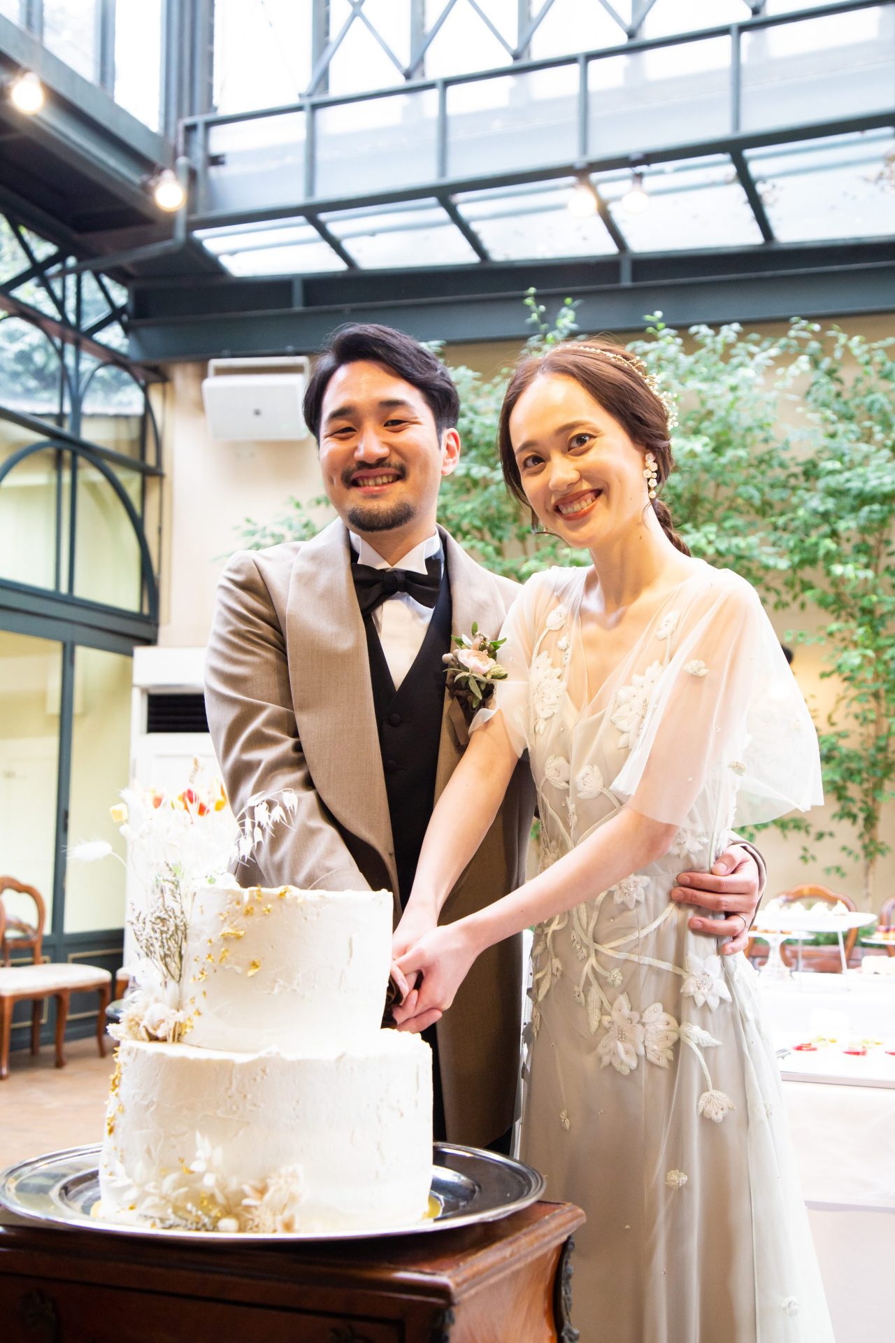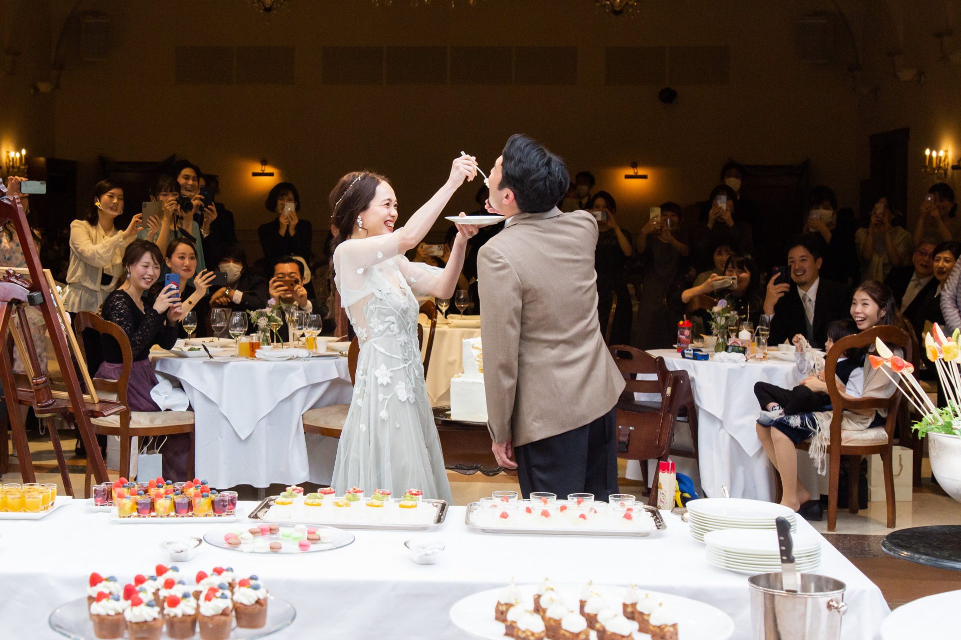 披露宴会場から続くガーデンチャペルで行ったケーキ入刀とファーストバイトはゲストと新郎新婦のソーシャルディスタンスを保ちながら楽しむことができます。