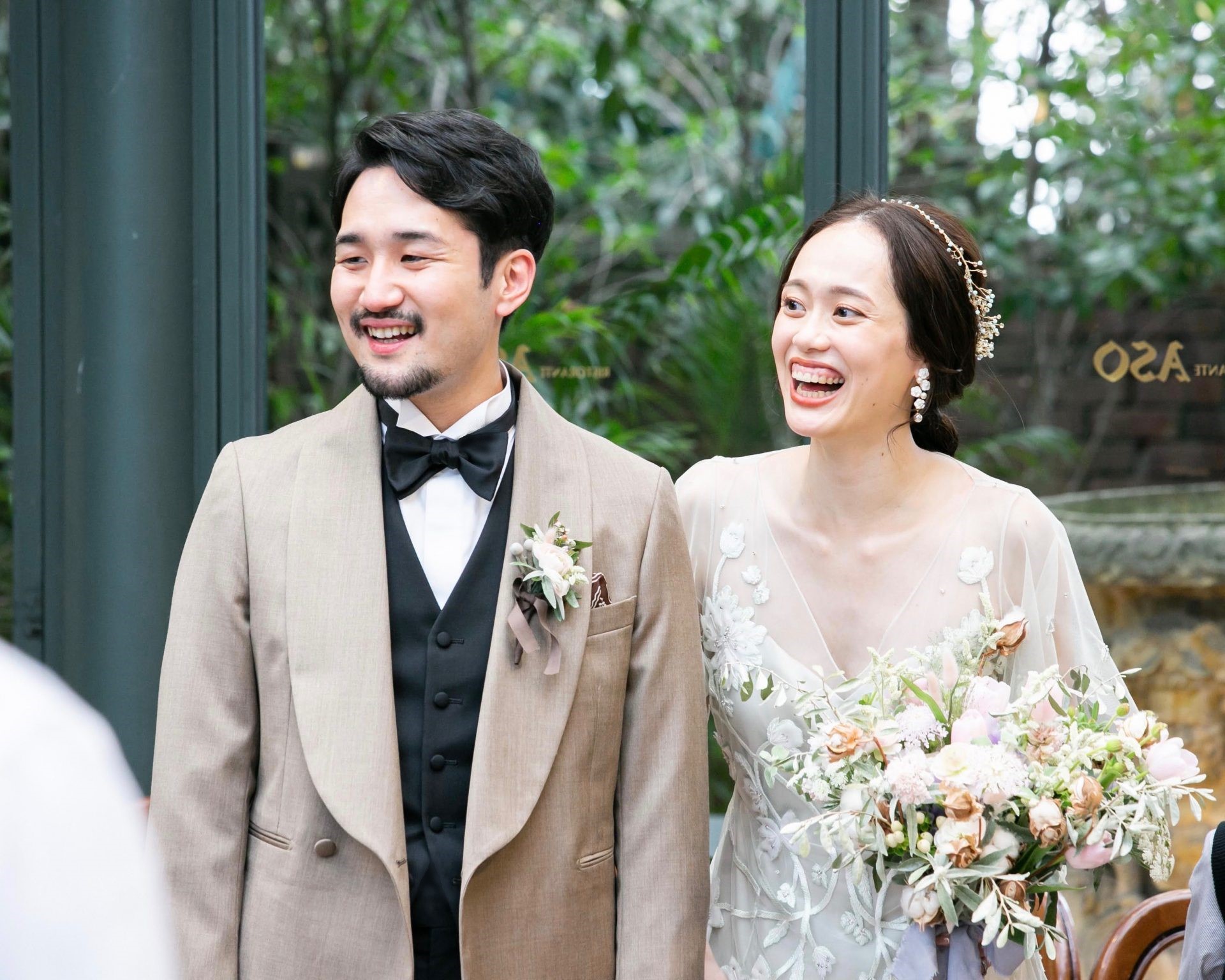 バックコンシャスなパステルグリーンのカラードレスに合わせてベージュのタキシードを選ばれたリストランテASOで結婚式を挙げたご新郎様ご新婦様。
