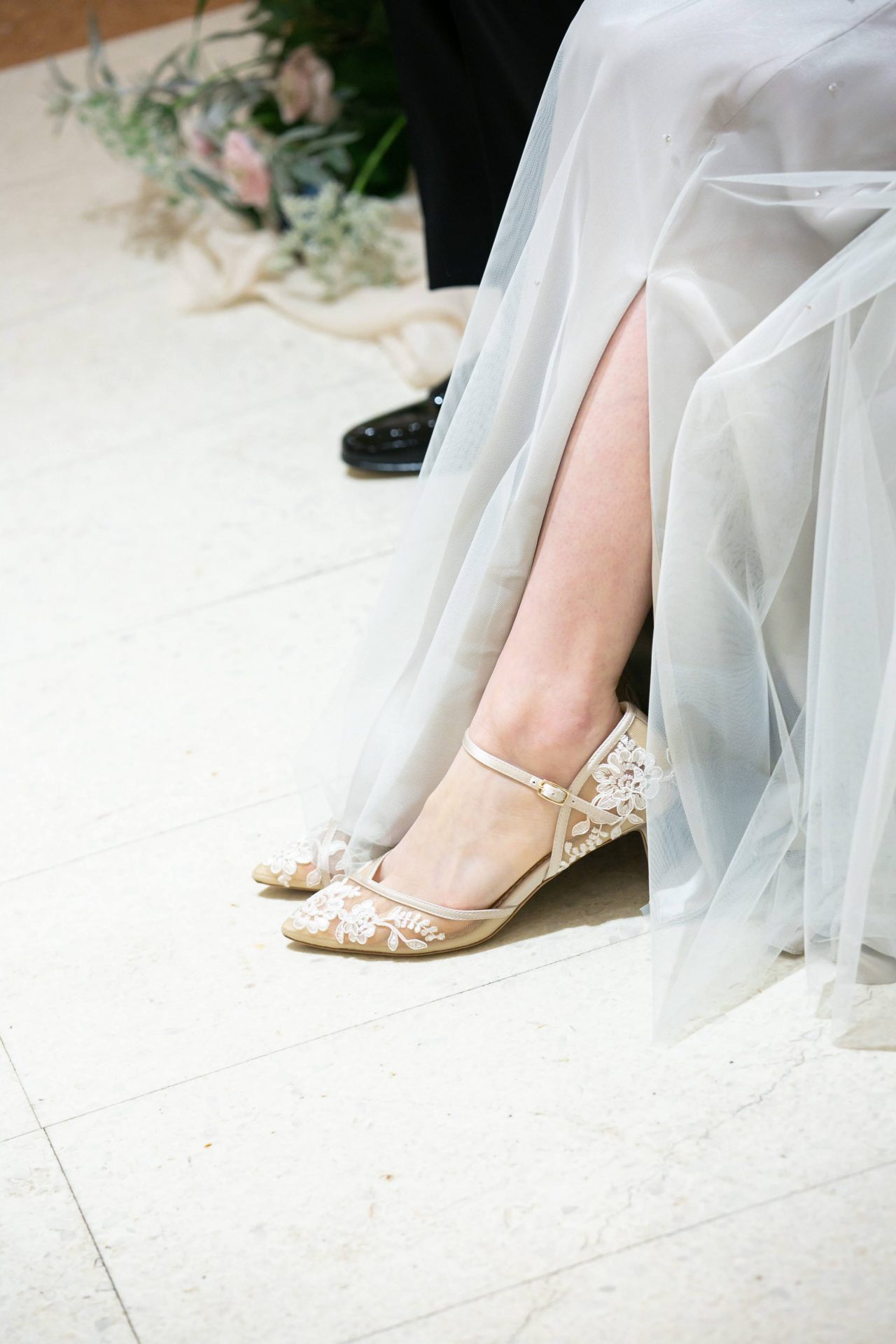 インポートらしいスリットの入ったニュアンスカラーのドレスに、レースのシューズを合わせたお洒落なコーディネートです。