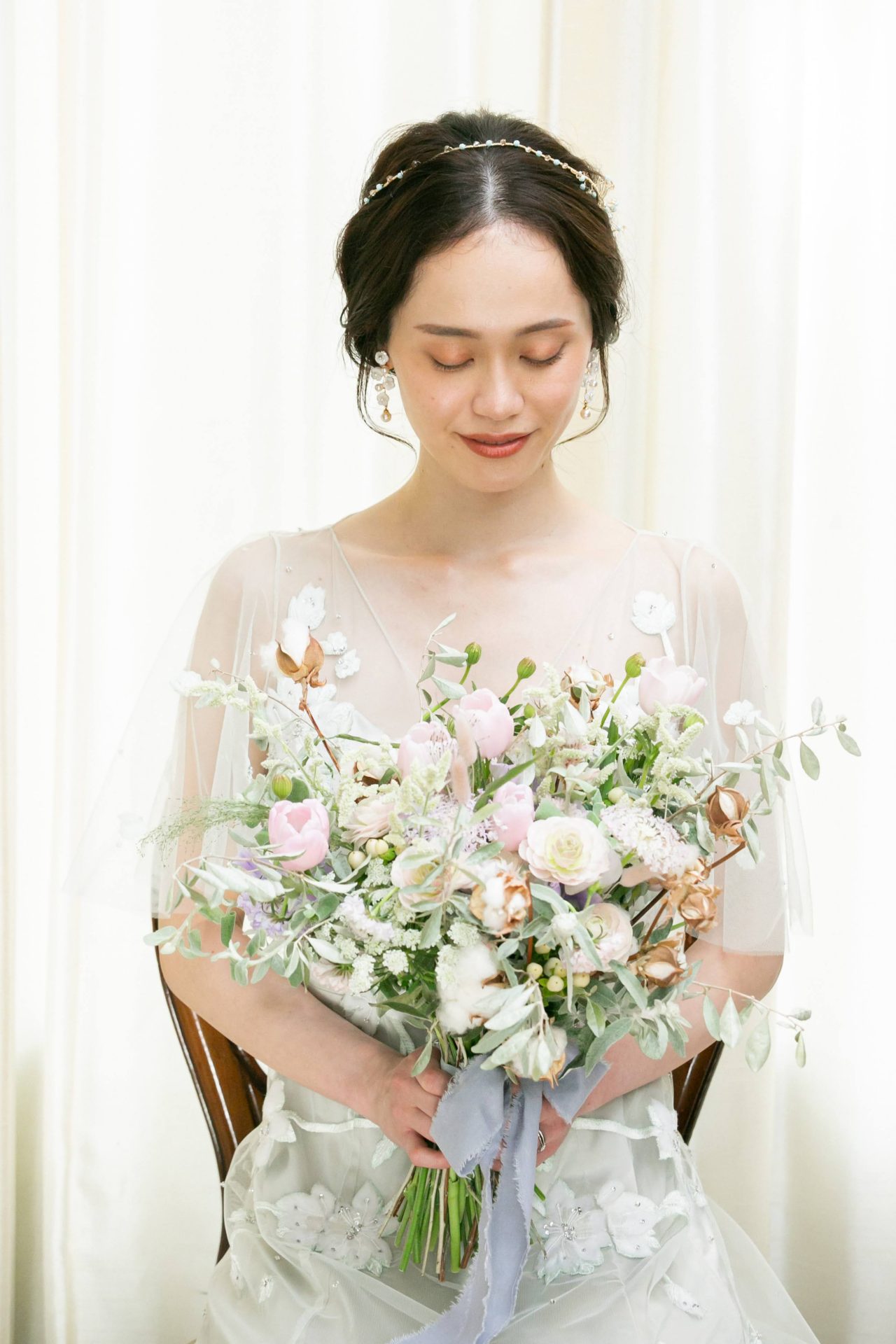 彼女の表現する絶妙な色彩。ご新婦様の柔らかい空気を投影したかのようなこの色味は他に表現できるでしょうか。実はこのパステルグリーンの色味は、ニューヨークの買付けの際に、THE TREAT DRESSING(ザ・トリート・ドレッシング)のためにオリジナルで作成された、リミテッドカラーなのです。バイヤーとブランドの深い信頼関係が創り上げた、特別なカラードレス。元々アイボリーで作られたウェディングドレスに、THE TREAT DRESSING(ザ・トリート・ドレッシング)のエッセンスを加えることで叶った、グレイッシュカラーの上に重なる淡く柔らかなパステルグリーンのソフトチュール、ホワイトのエンブロイダリーレースを囲う、グリーンの刺繍糸。スリットの効いたリラクシングモードなデザインは、可愛らしさだけではなく、モダンさをプラスしてくれます。