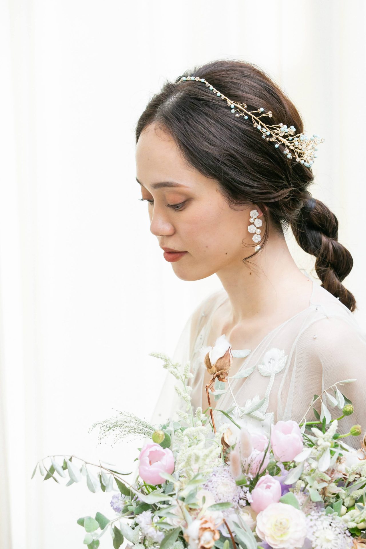 カラードレスに合わせるアクセサリーにもこだわりを。ゴールドを基調として選んだアクセサリー。サムシングブルーの実を実らせた、ヤドリギの葉を編んだようなデザインのカチューシャに、耳元には乳白色のフラワーモチーフのイヤリングを合わせました。生花を合わせようか迷いましたが、アクセサリーを合わせることで、ナチュラルすぎずウェデイングらしい華やかさを大切にしました。ヘアースタイルにはご新婦様の髪質を活かしたニュアンスに、モダンなツイストアレンジを。スリットから覗くシューズにもレースを添えて、カラードレスを纏う花嫁を主役に、リストランテASOのアンティークさを取り入れたコーディネートが完成しました。