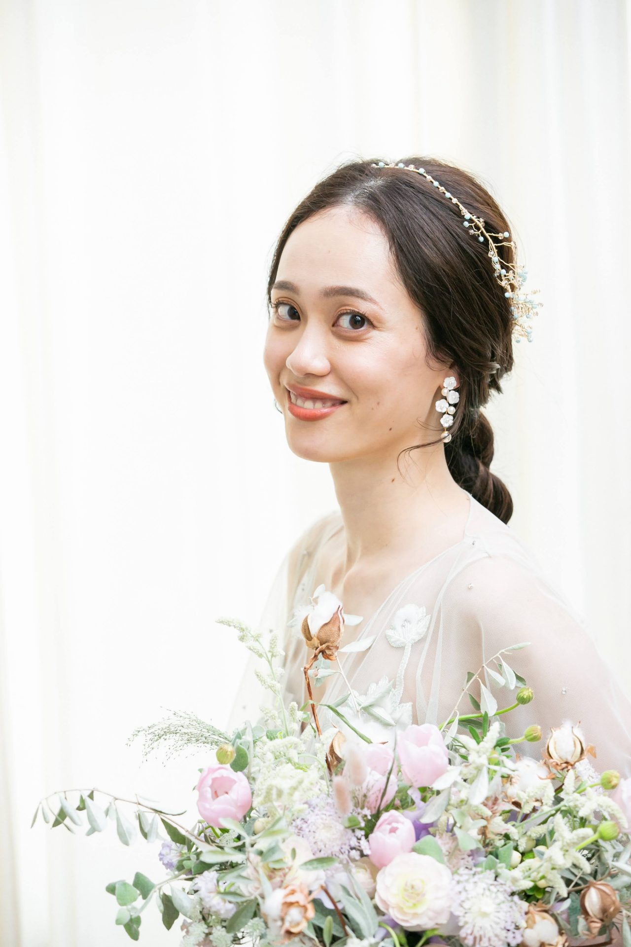 冬のレストランウェディングでお色直しに選ばれたのは、レースとパステルグリーンの色味が美しいカラードレスに、柔らかい色のお花をざっくりと束ねたナチュラルな雰囲気のブーケを合わせたコーディネートですColor Dress: 101-09090