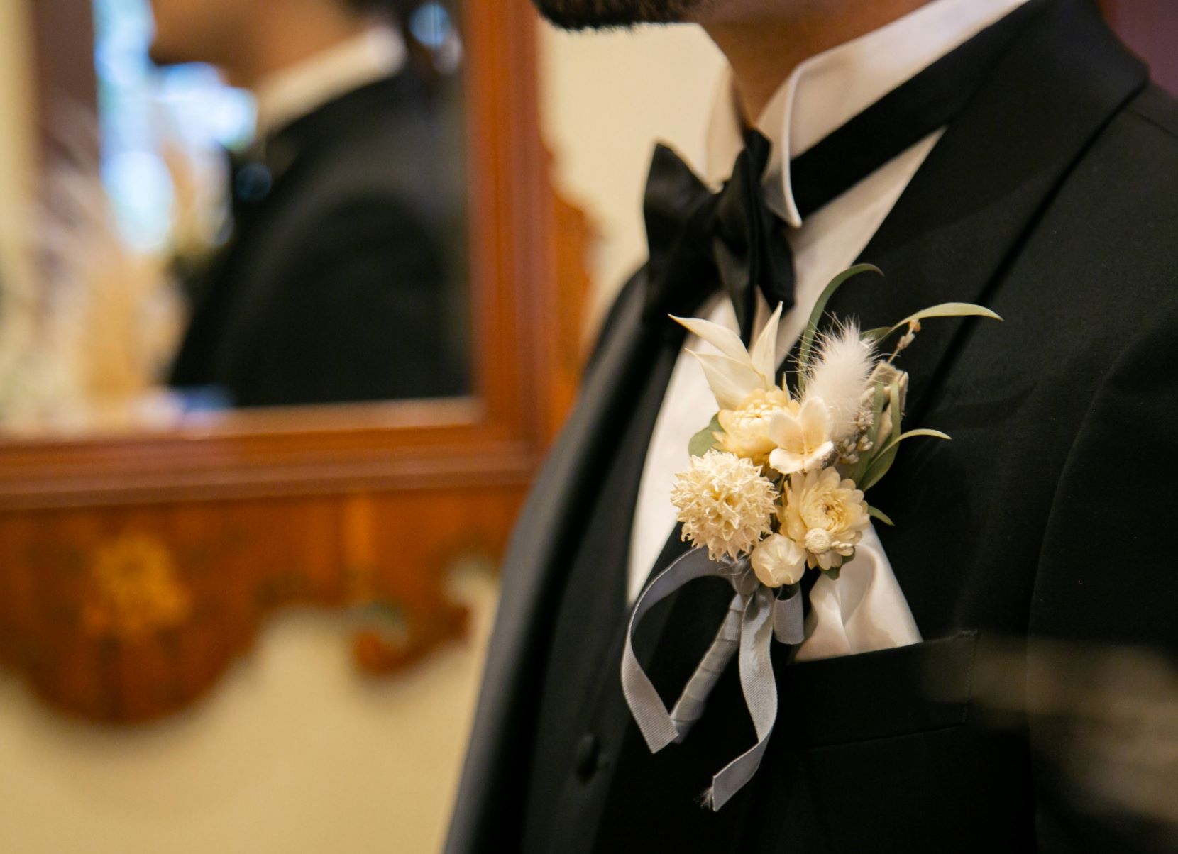 トラディショナルでクラシカルなザトリートドレッシングのフォーマルタキシードに合わせたのは、冬の季節に合わせたアンティークな雰囲気のブートニアです