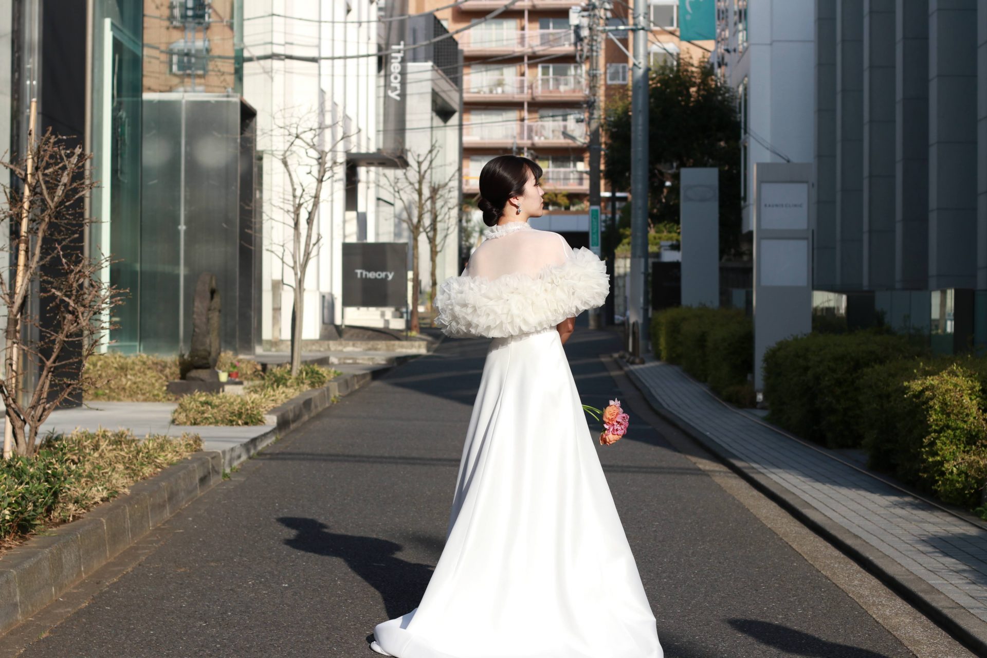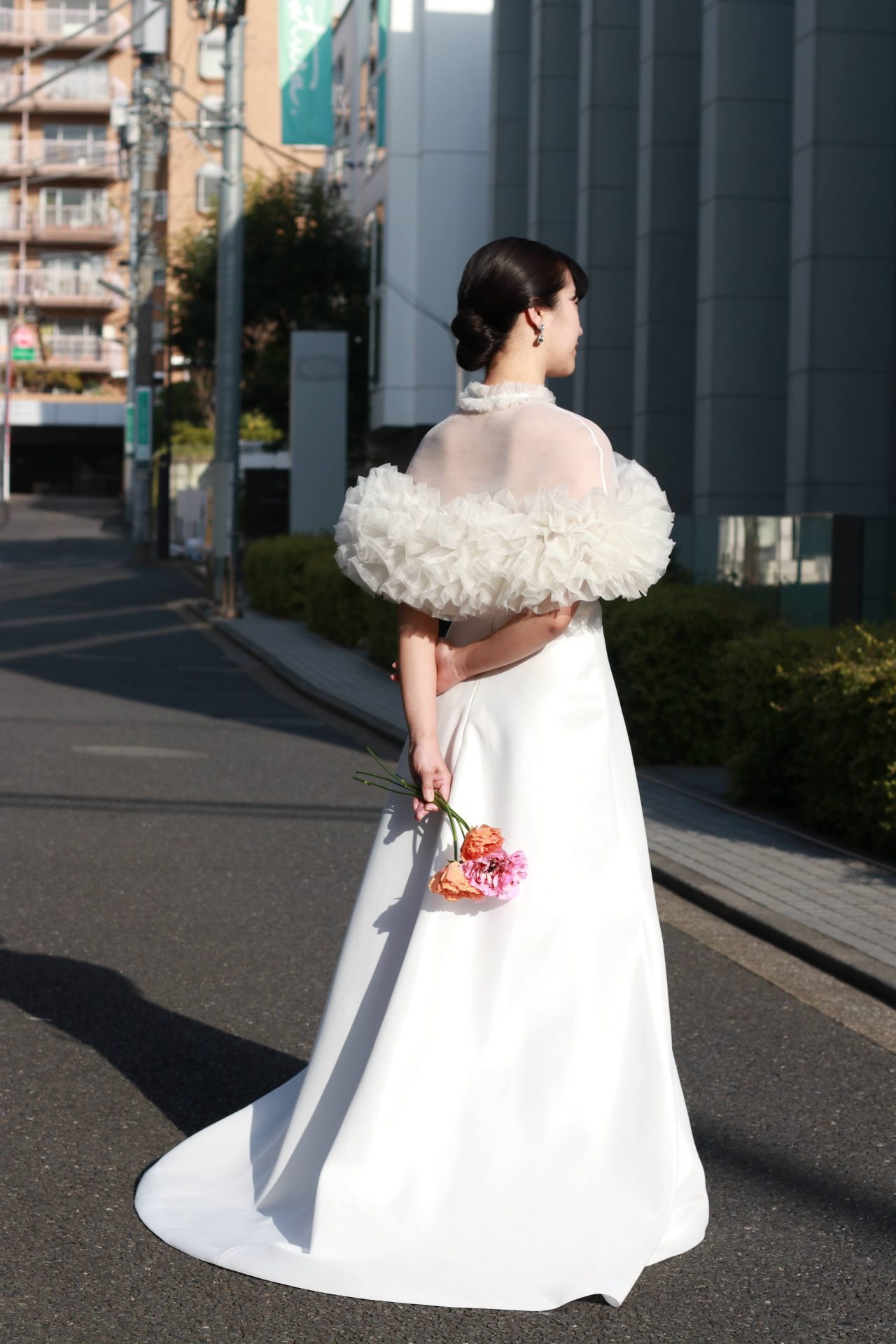 TREAT MAISON for TOMO KOIZUMI (トリート・メゾン・フォー・トモ・コイズミ)のコレクションは世界各国のファッション誌に取り上げられるほど話題となり、花嫁のウェディングシーンに留まらず、世界各国でエンパワーメントな女性達を彩っています。コレクションではドレスだけではなくファッショナブルなコーディネートアイテムも発表され、その中でも一際目を引いたのは、TOMO KOIZUMI(トモ・コイズミ)のシグネチャーでもあるラッフルチュールをふんだんに使用したボレロ。柔らかいアイボリーの立体的なチュールは胸元を優しくもゴージャスにしてくれます。ご家族・ご友人の方々と過ごす披露宴の時に纏えば、厳かな挙式後の雰囲気から一瞬にしてパーティームードにしてくれるアイテムです。