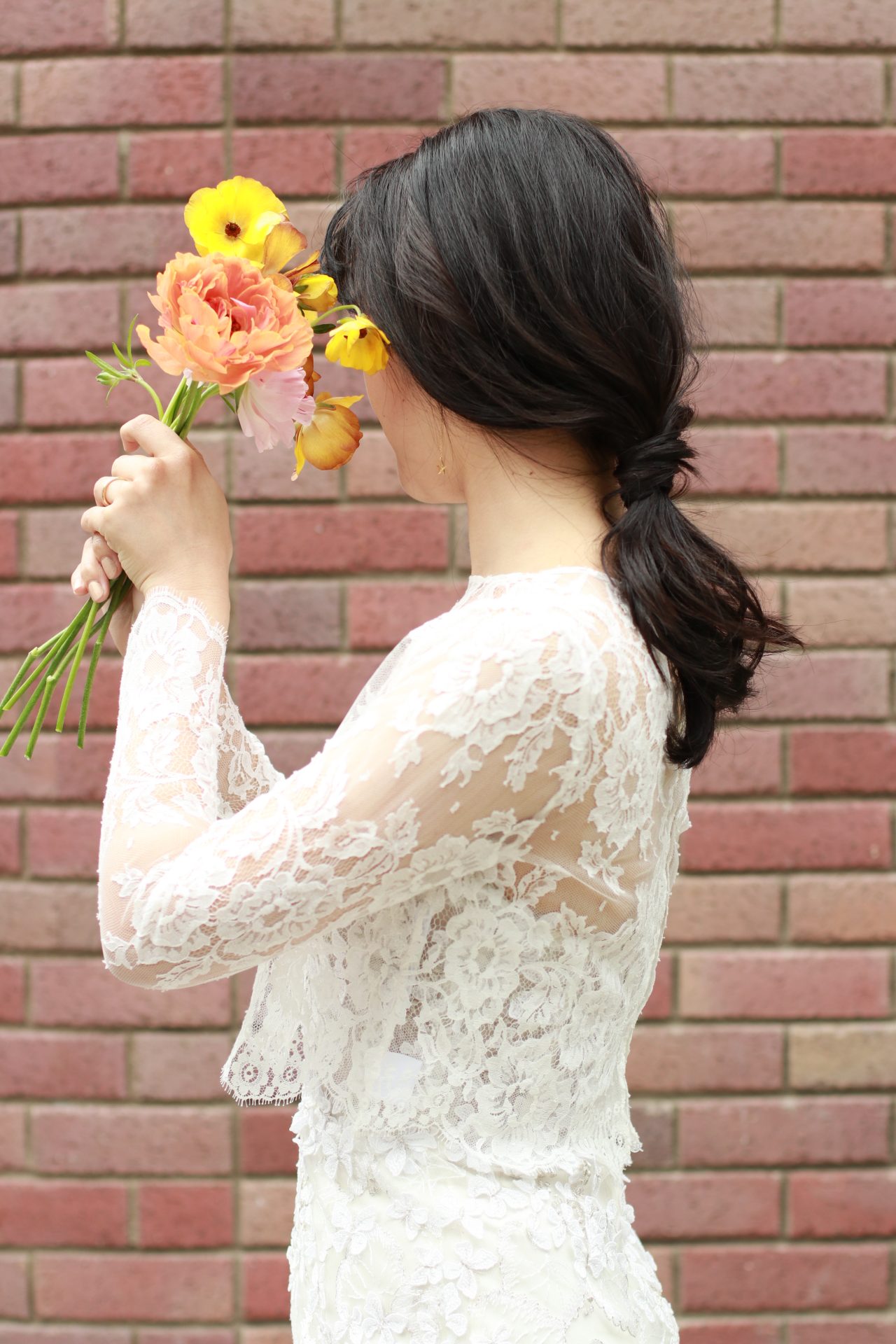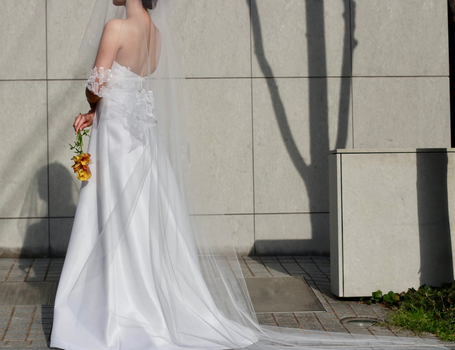 今回発表された2nd collectionの新作ベールは、レースの配置にこだわりが詰まっています。花嫁の顔に重なるフェイスの正面は敢えて装飾を無くし、左右の腕に重なる部分にそっとシルクレースが乗るデザイン。”愛の告白”や”誠実な愛”という花言葉を持つチューリップが丁寧に刺繍されています。チューリップの周りに舞うコスモスも、ひとつずつ位置にこだわりながら縫い付けています。透明度の高いソフトチュールと、繊細なレースのコントラストはきっとバージンロードを歩む花嫁をより一層、神秘的に輝かせてくれるでしょう。