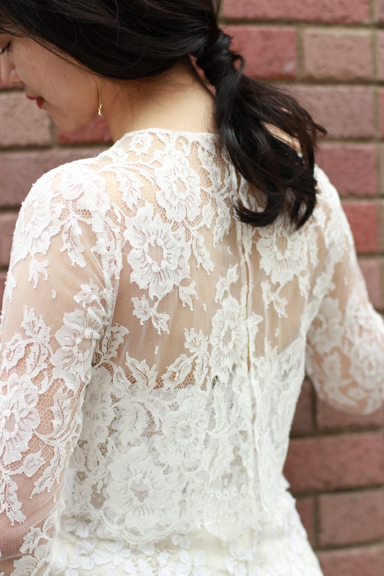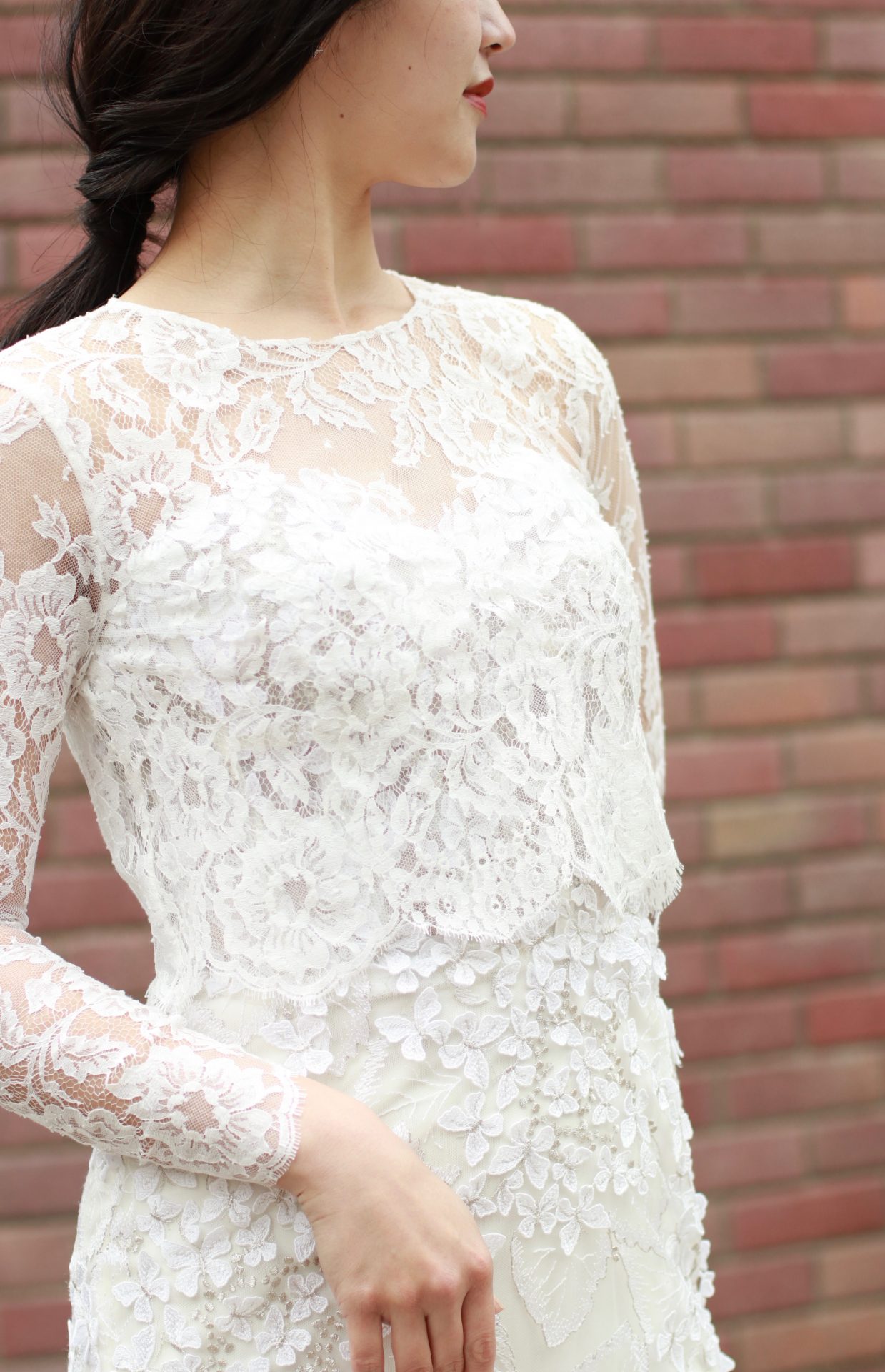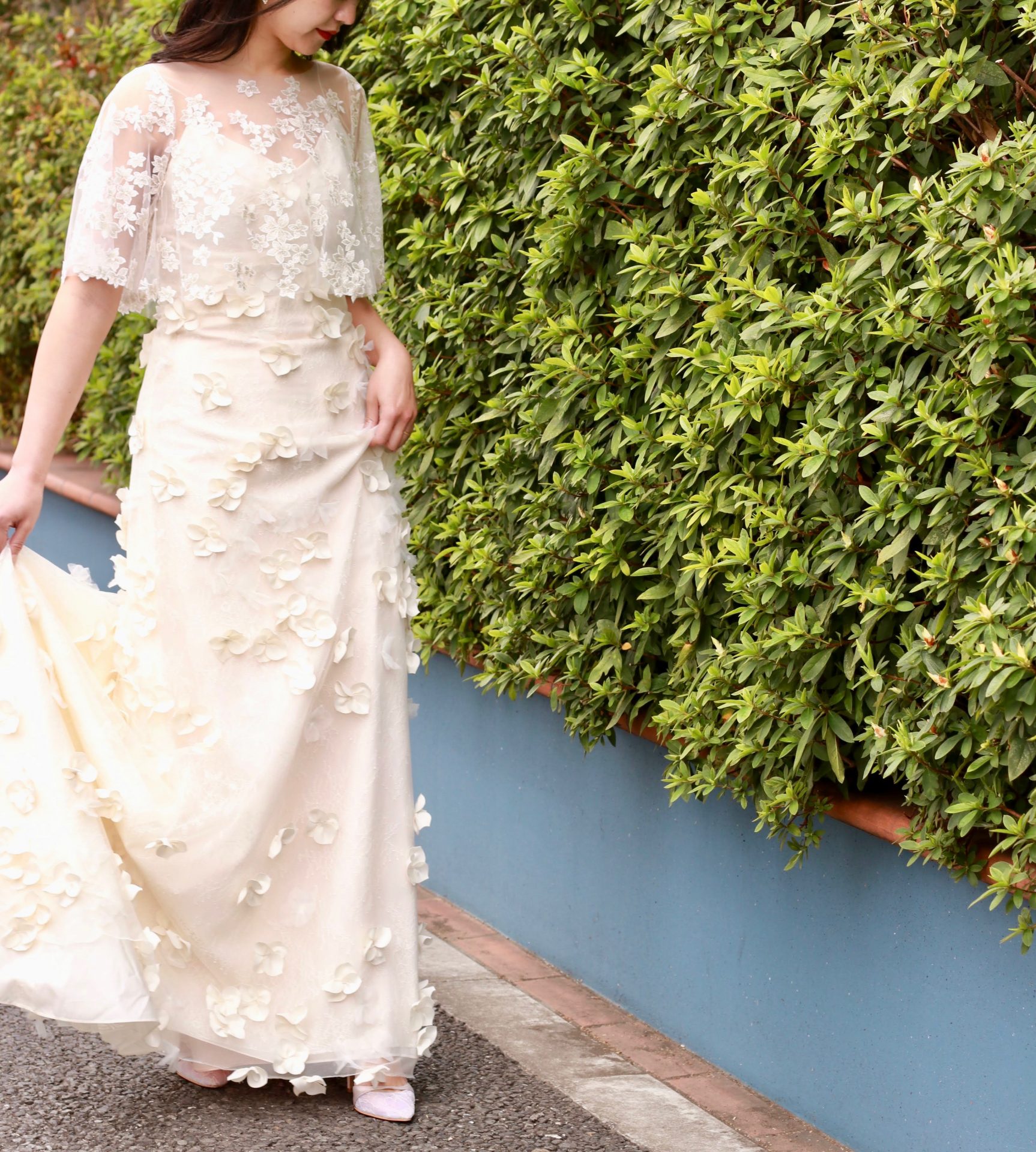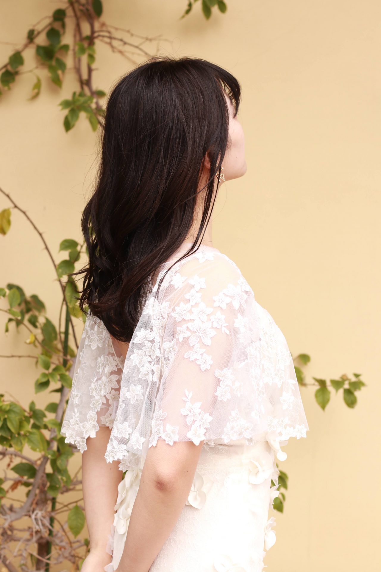 今回の2nd collectionでは新作のボレロも発表されました。ウェディングドレスのデザインで不動の人気を誇るロングスリーブや、デコルテ周りを覆うデザインは、ボレロを合わせる選択肢を持つことで叶えることができます。ケープのようなスリーブデザインが特徴のボレロは、今までにありそうでなかった、ファッショナブルなデザイン。特に、披露宴やお色直しなど、ゲストの方々と近い距離で過ごす歓談のシーンではスリーブに特徴のあるボレロがおすすめです。扇型に作られたデザインは、ご新婦様の動きに合わせてゆらゆらと動くため小花柄のレースが重なり色々な表情を見せてくれます。乾杯にグラスを挙げる腕や、遠くのゲストへ手を振る際に揺れるレース。シルバーの糸で織り成されたレースはカジュアルな印象にならず、花嫁の動き一つひとつを上品かつ可憐な印象に仕上げます。動きが最大限に活きるように、バックスタイルは首元だけで留めるデザインになっております。トレンドの背中が大きく空いたウェディングドレスを合わせて上品に肌を見せたり、華奢なストラップのウェディングドレスを合わせれば、よりセンスフルなコーディネートに。