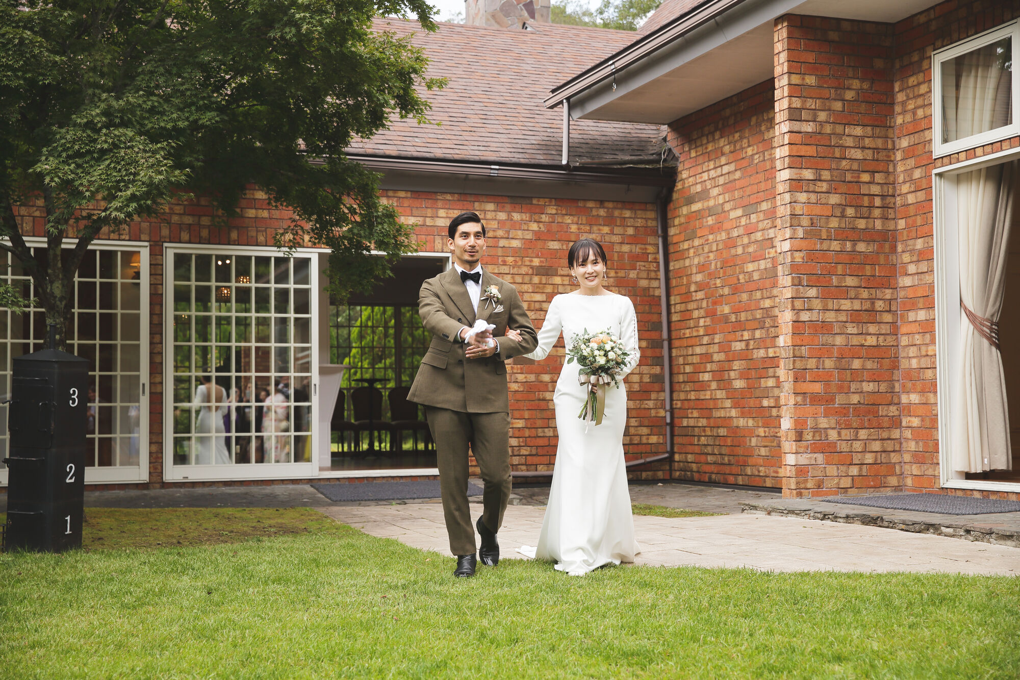 軽井沢にぴったりのレラローズのスレンダーラインのウェディングドレスとおしゃれなタキシードを着たご新郎ご新婦様。