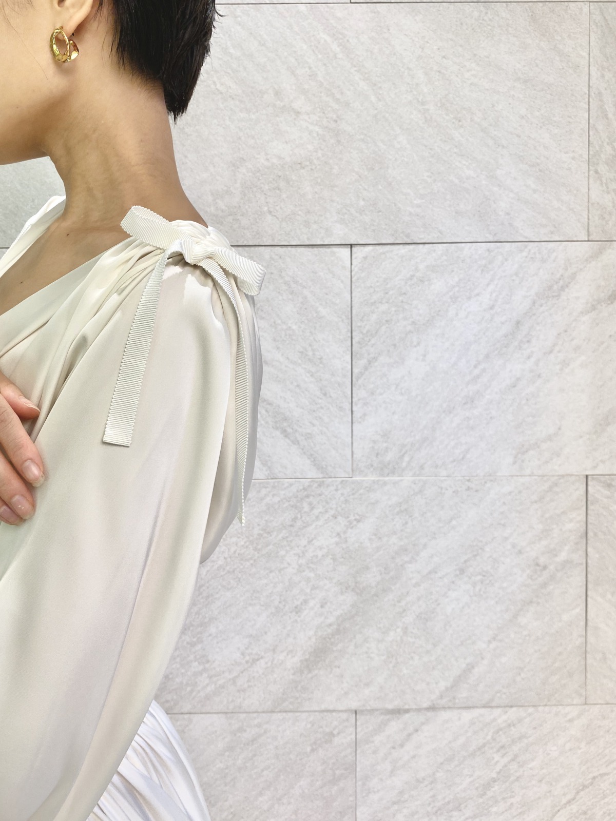 真っ先に目を奪われたのは、大袈裟にデザインされたビックパフスリーブ。触れるのも躊躇うほどの繊細なシルクシフォンが手元を優しく包み込むよう。