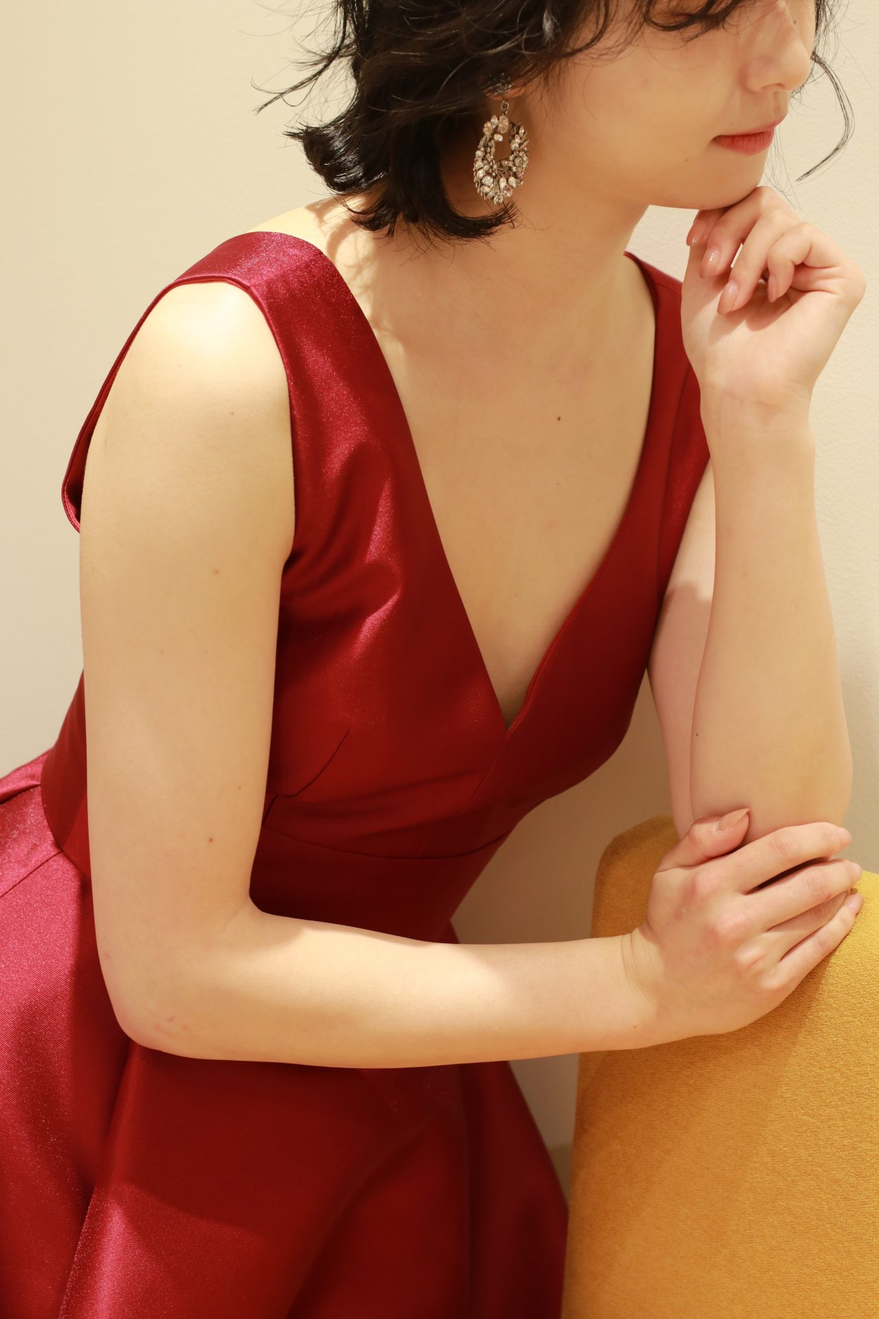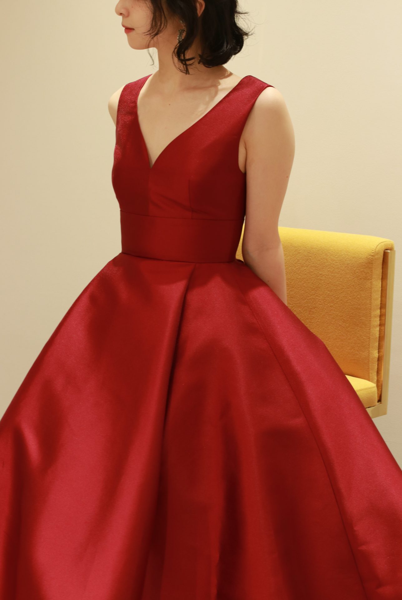 トリート メゾンの2021 Pre collectionより届いた新作カラードレスの数々。その中でもシックなカラーリングが目を惹くサテン地のドレスは、深みのあるグリーンとボルドーの2色展開です。日本の花嫁に懸念されがちなVカットのデザイン。それを胸元の丸みに合わせてカーブさせることで、安心感をもたらしました。凛とした上品さの中に、誰もが自信を持ってお召しいただけるデザインに仕上げられるのは、日本人女性の体を熟知したトリート メゾンならでは。裾もとにかけてふわっと広がる王道な印象のAラインを、胸元と背中のシャープなカッティングで締めることでモダンに昇華させます。パールのようなマットな光沢が美しいファブリックは、自然光や会場のライティングのもとで主役の輝きを与えてくれることでしょう。