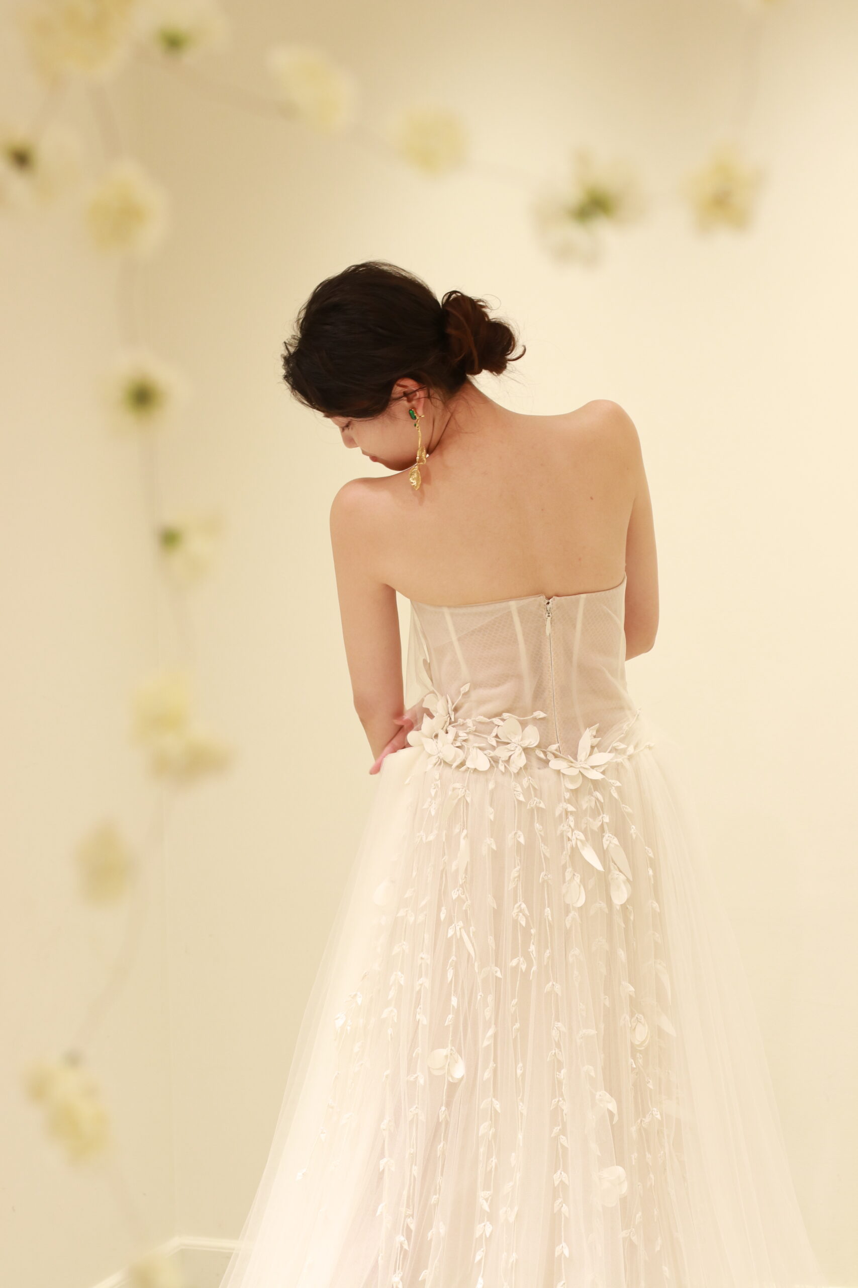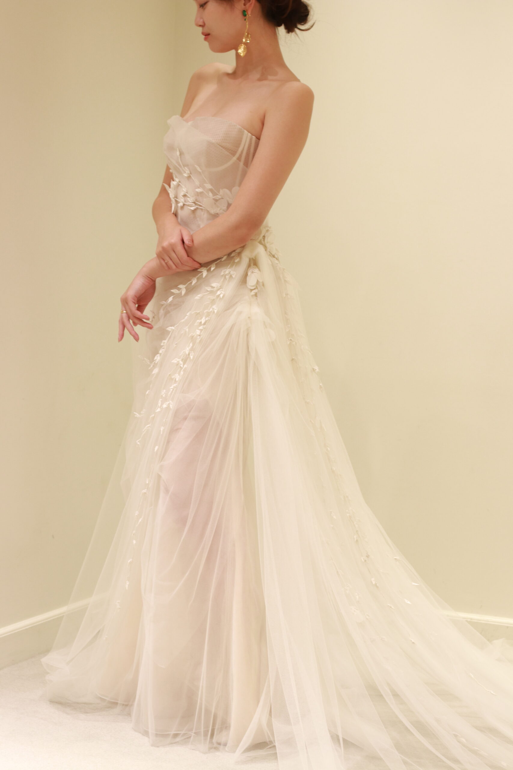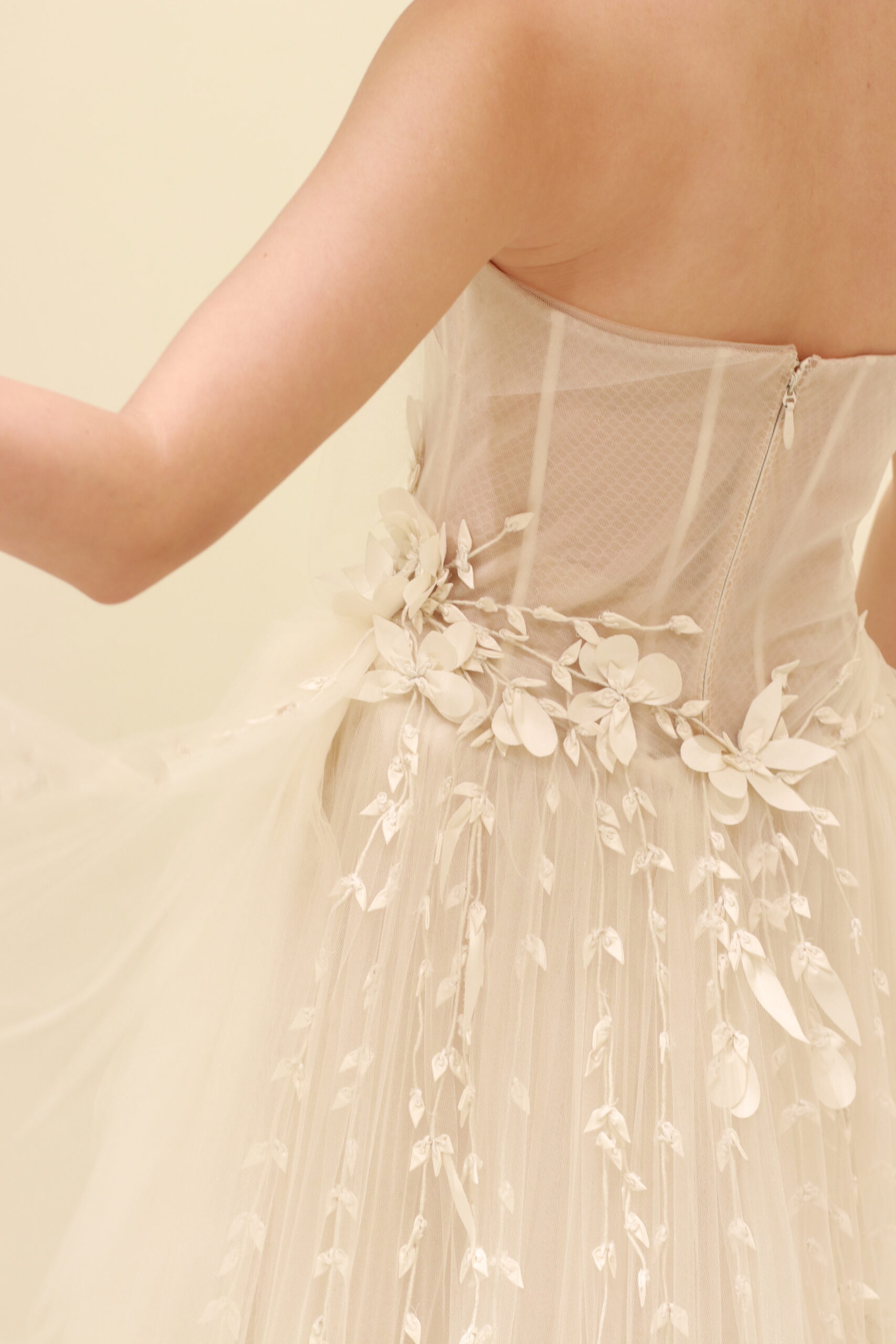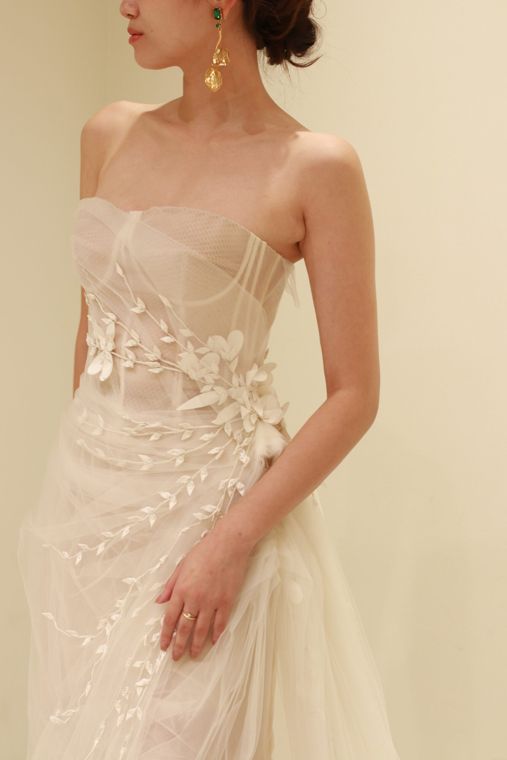 FALL 2020 collectionの中でも、ひときわ繊細なファブリックとモチーフで仕立てられたウェディングドレス。透き通るようなブラッシュカラーのチュールは、純潔さと洗練された花嫁の美しさを表現します。絶妙なクチュールテクニックで、全身に施されたドレープによって生み出される陰影がなんともドラマティックで息を吞む美しさ。ウエストで絞ることで、Aラインでありながらもメリハリのあるシルエットが叶います。腰元には花や葉のオーガニックモチーフがまるで風に舞うかのような繊細さで、一枚一枚体を包みこむように縫い留められています。また、胸元のボーンを透かせ、インナースカートをショート丈にするオスカー デ ラ レンタならではのモダンなエッセンスを感じるディティールの数々…
