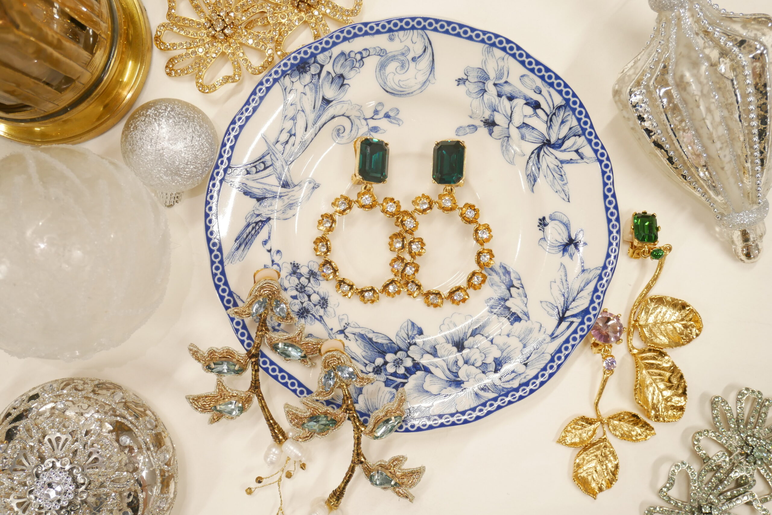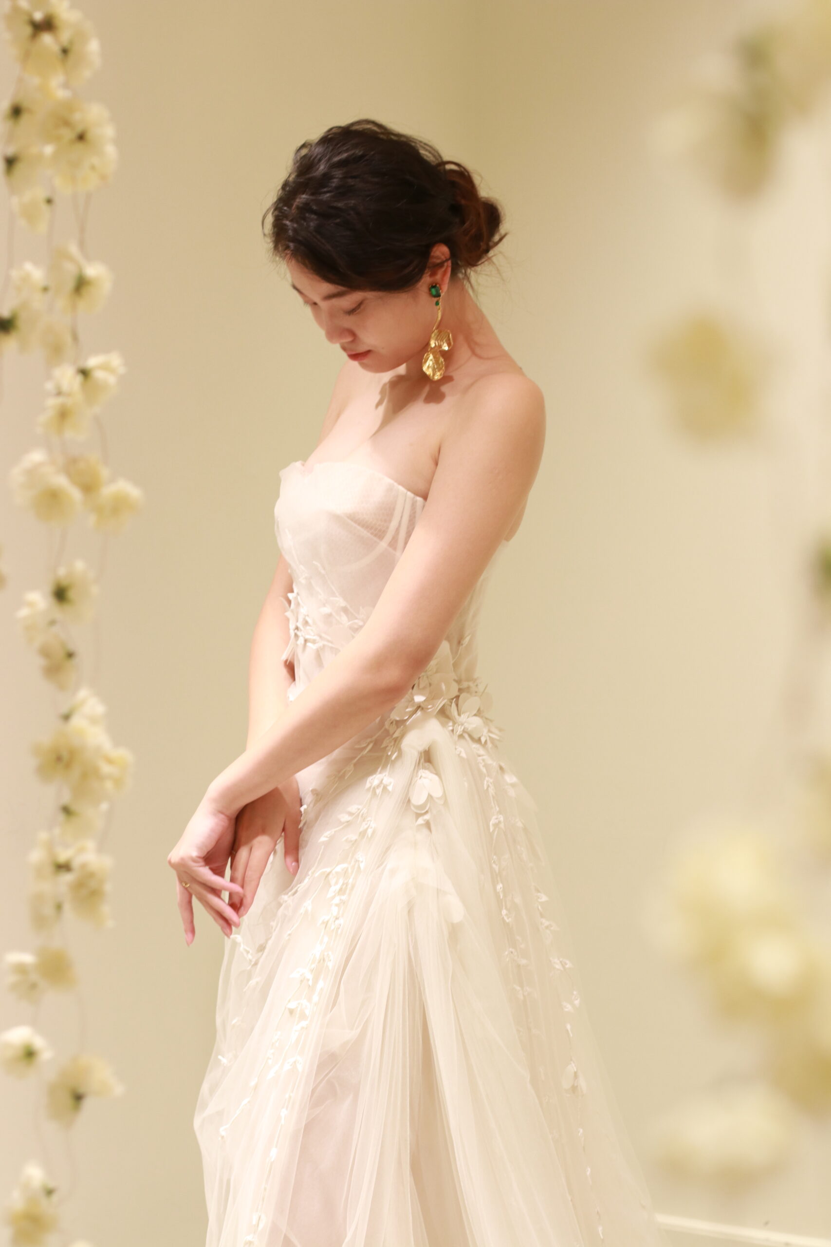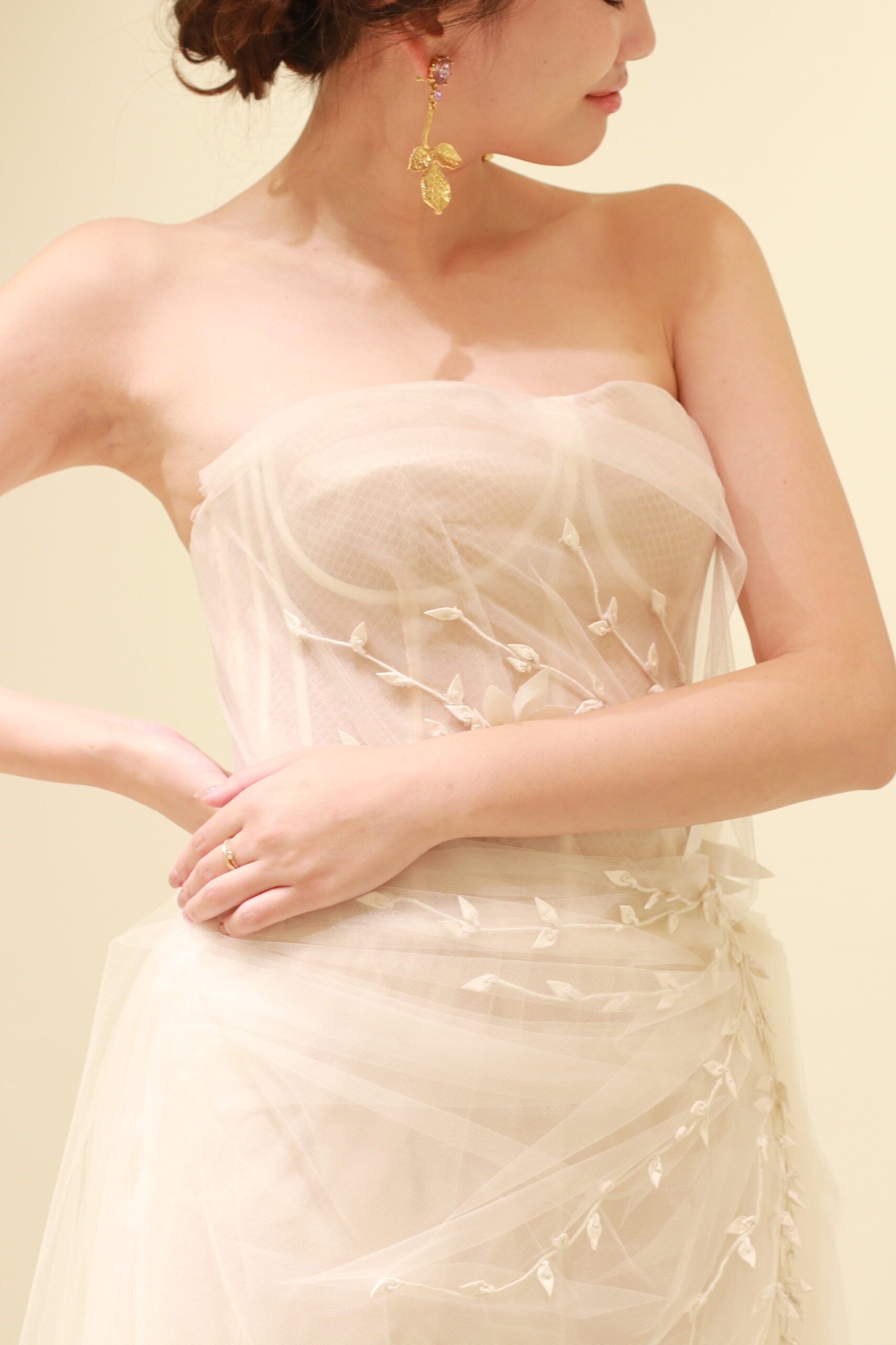 今回コーディネートに使用したのはオスカー デ ラ レンタの新作イヤリング。モスグリーンとローズピンクの石が耳元で光り、長さの違うゴールドの葉が揺れ動くアシンメトリーなデザインです。ブラッシュカラーのドレスだからこそ、遊び心を効かせた大胆な色使いで、ゲストの視線を集めるアイコニックなスタイルに仕上げるのはいかがでしょうか。
