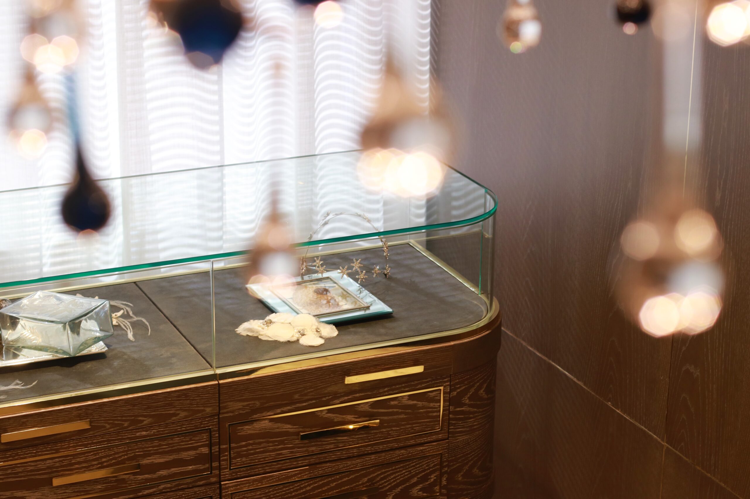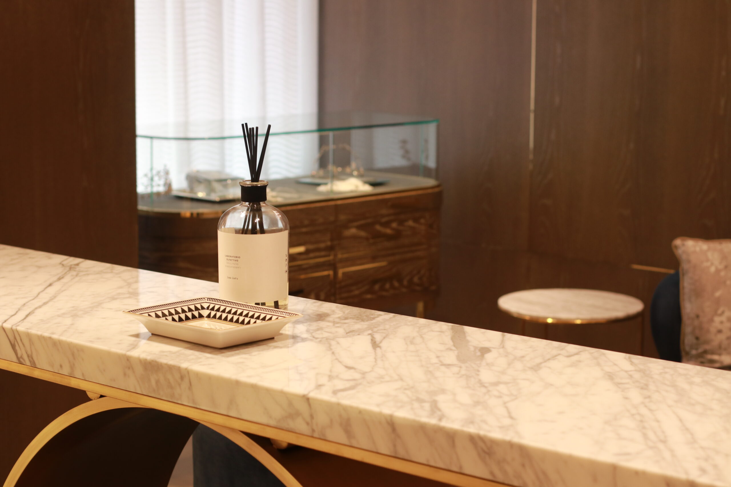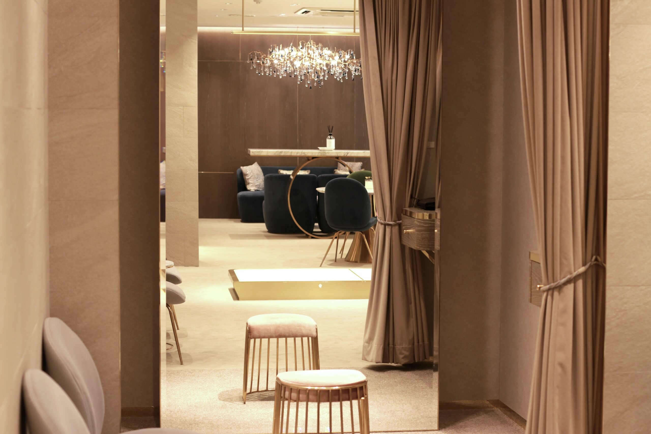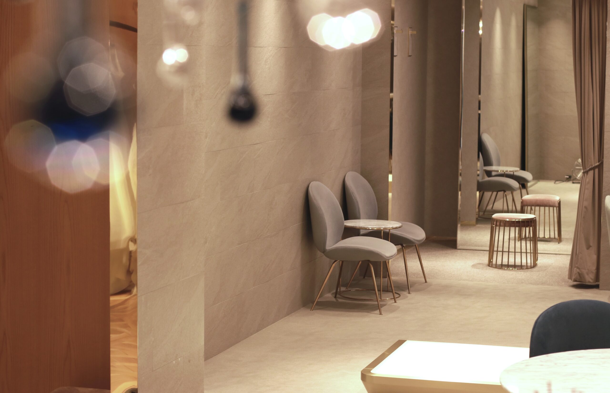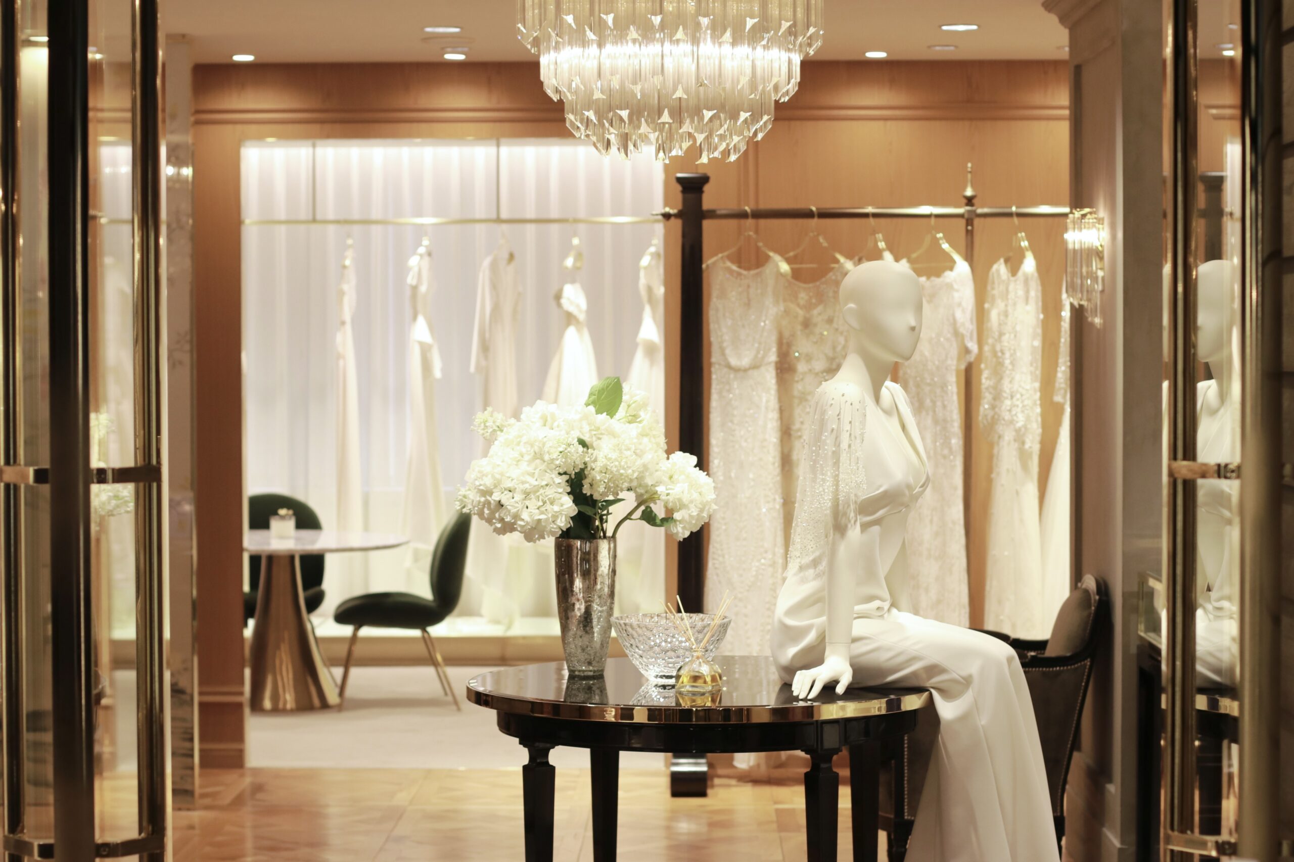一歩足を踏み入れるとそこはまるで別世界。スパイシーウッドの香りに包まれ、上質でゆったりとした時間が流れます。ドレスショップならではの特別感を高める広いフィッティングルーム、ゴージャスなシャンデリア、こだわりの詰まったオーダーメイドのインテリアの数々…すべて、「ドレス選びの時間が、大切な思い出の一つとなるように」と心を込めて一つ一つデザイン、セレクトいたしました。ゴールドで統一された什器には、ラグジュアリーでありながらも洗練されたモダンテイストを感じるドレスブランドが並びます。