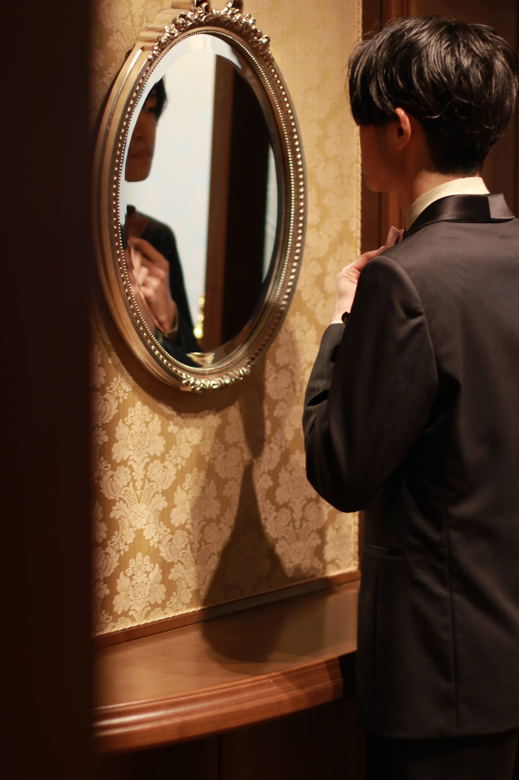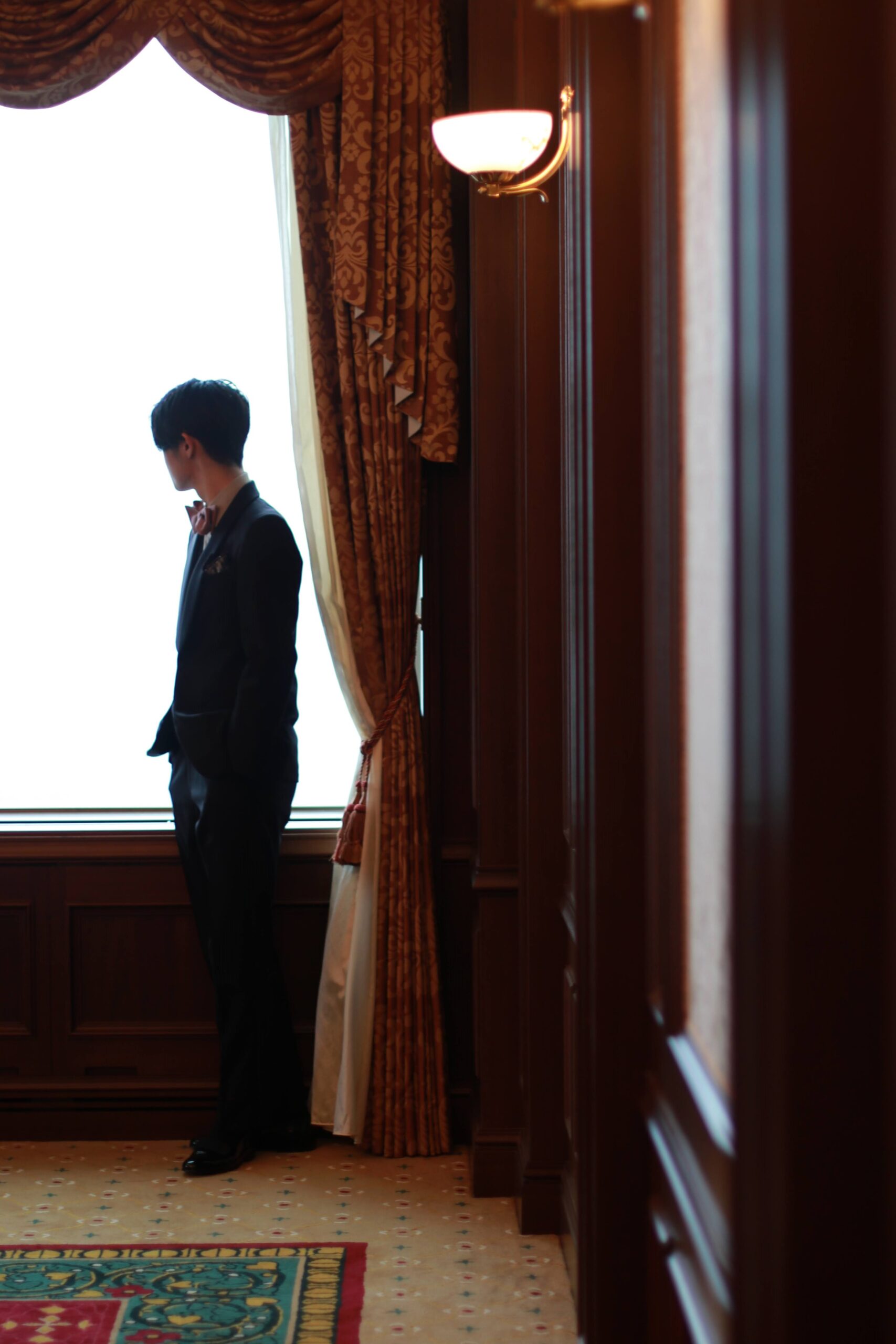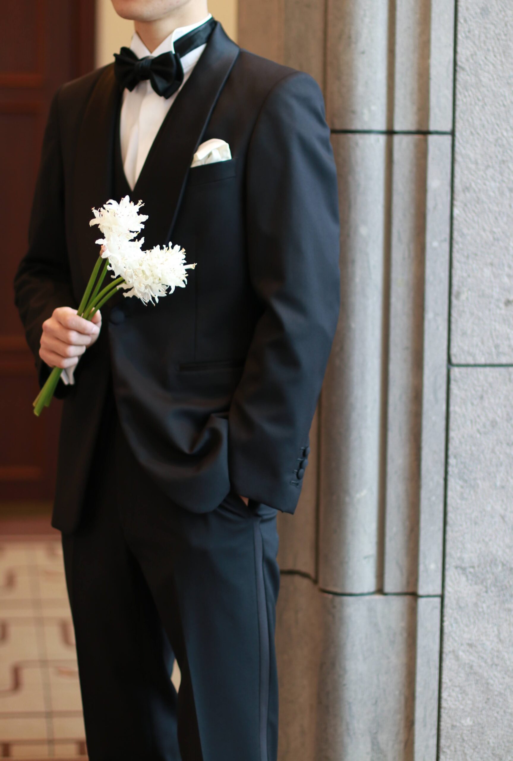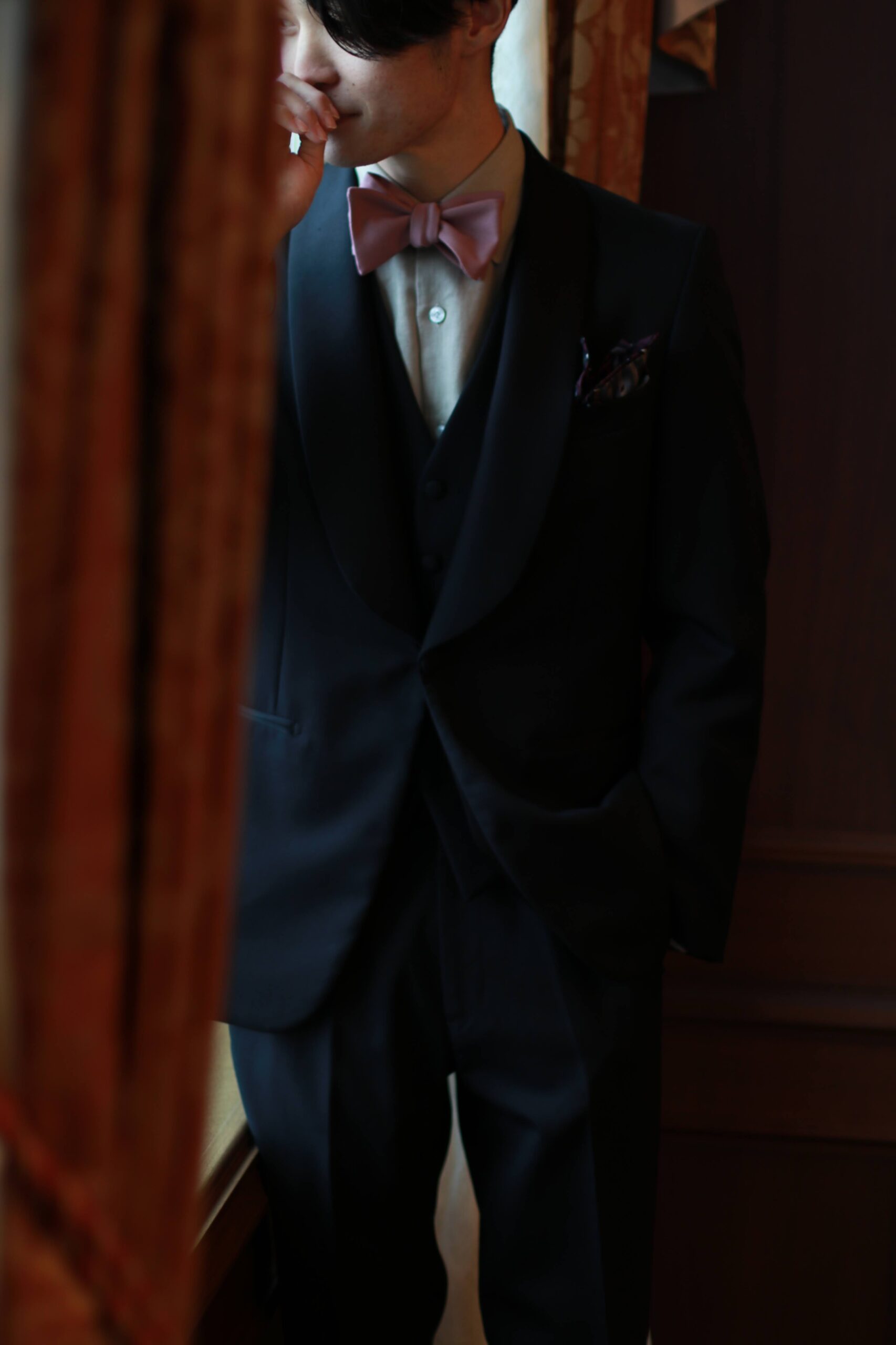 ご新婦様のブーケからインスピレーションを得た、ご新郎様の色合わせ。淡いピンクのタイとベージュのシャツによって、トラディショナルなタキシードが一気に肩肘張らないカジュアルさへと表情を変えます。扉が閉まるその一瞬まで、思う存分ご自身らしさを楽しんで。