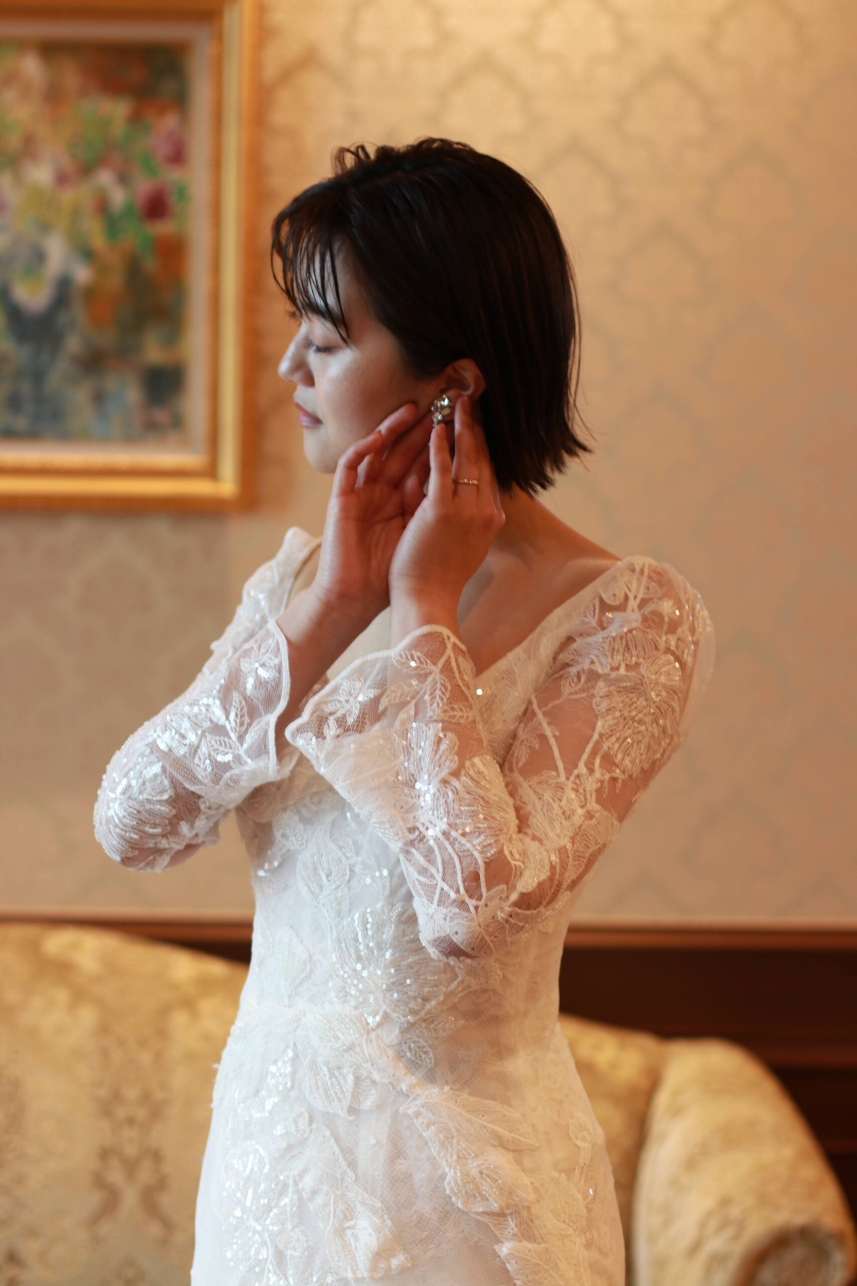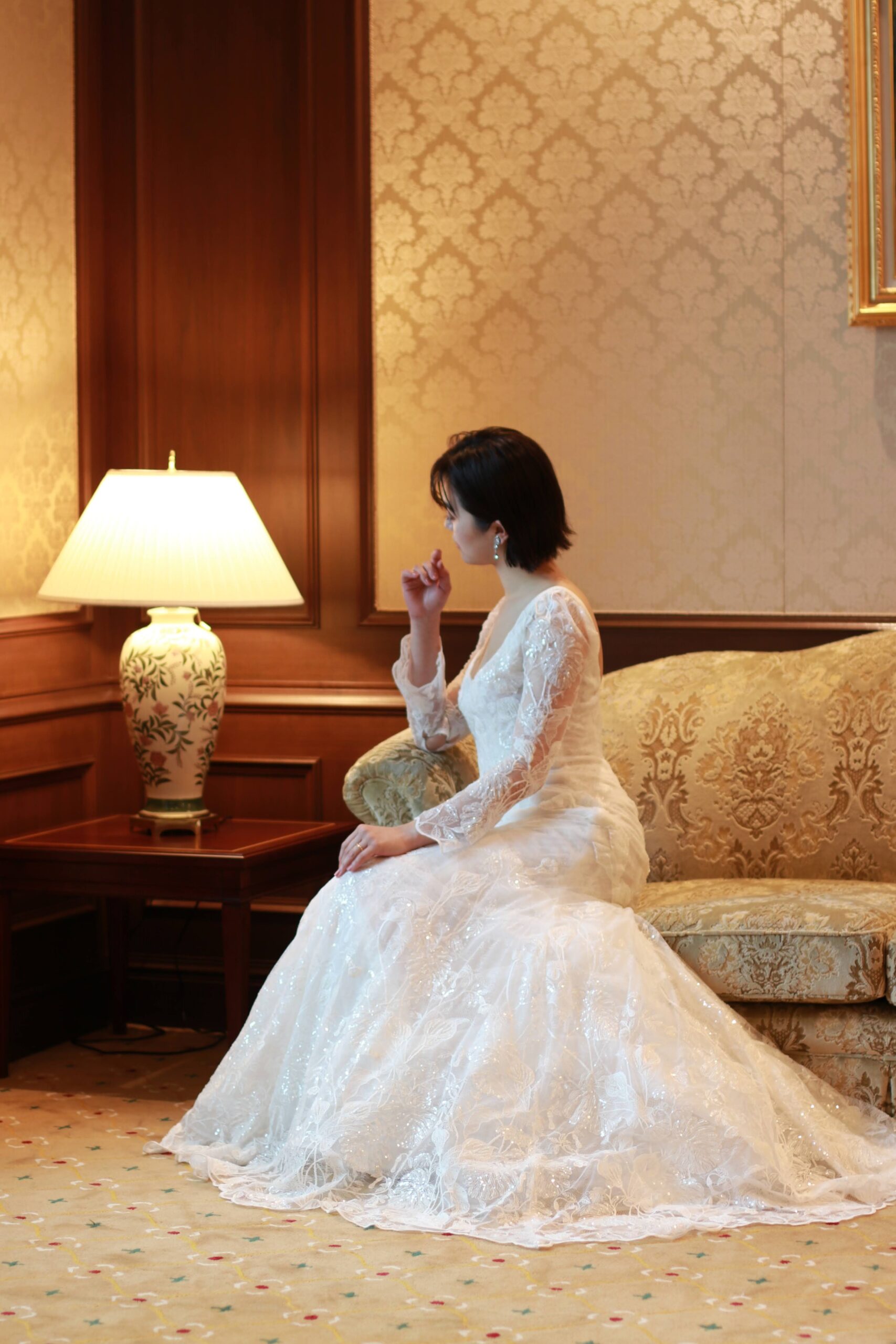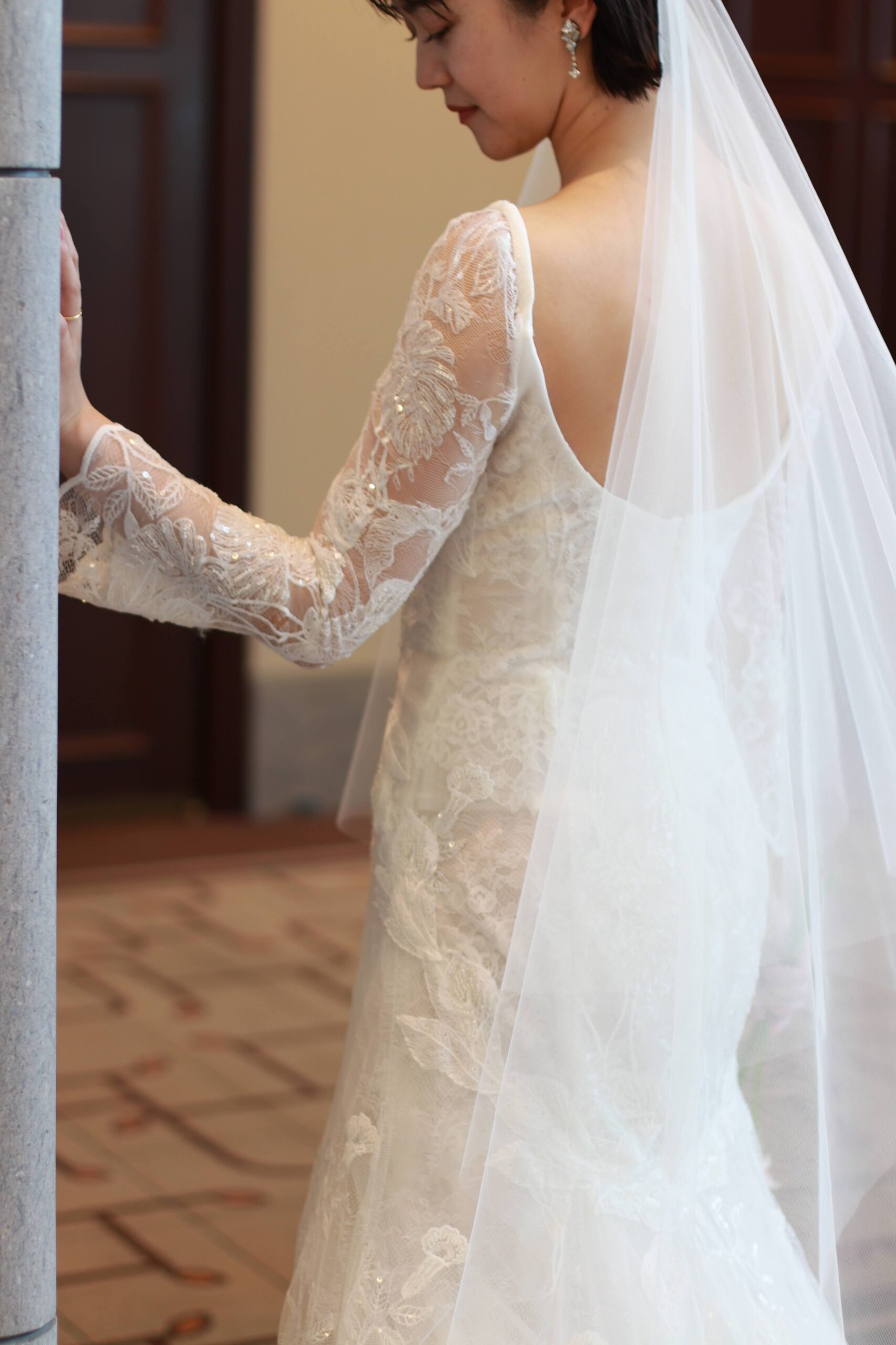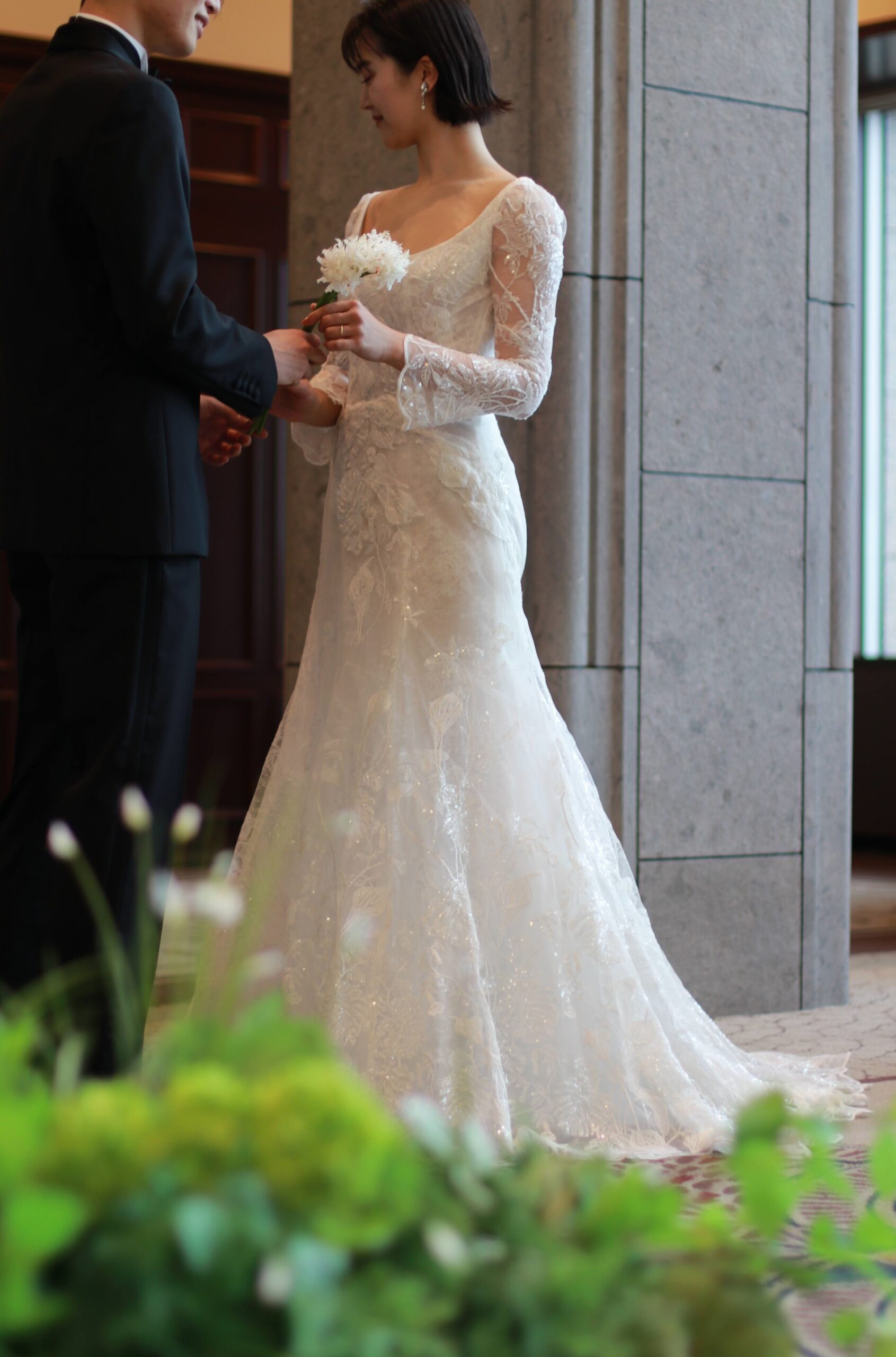 クラシカルなウェディングスタイルとしてザ トリート ドレッシング アディション店からおすすめするのは、2022ssコレクションから買い付けたReem Acra(リーム アクラ)の新作ウェディングドレス。ソフトマーメイドラインとロングスリーブが掛け合わされた、一見オーソドックスなデザインですが、ベルスリーブや、大胆な胸元のカッティングなど、随所にリーム アクラらしいモダンなテイストが光ります。ヴィンテージなエッセンスが香る、ロマンティックな刺繍と光沢はまるで芸術品を見ているかのような美しさ。デイタイムの式ならばたっぷりと自然光を纏って、高貴な雰囲気に。流行を反映させながらも、オーセンティックなディティールが美しい一着は神聖な時間を惹きたてます。