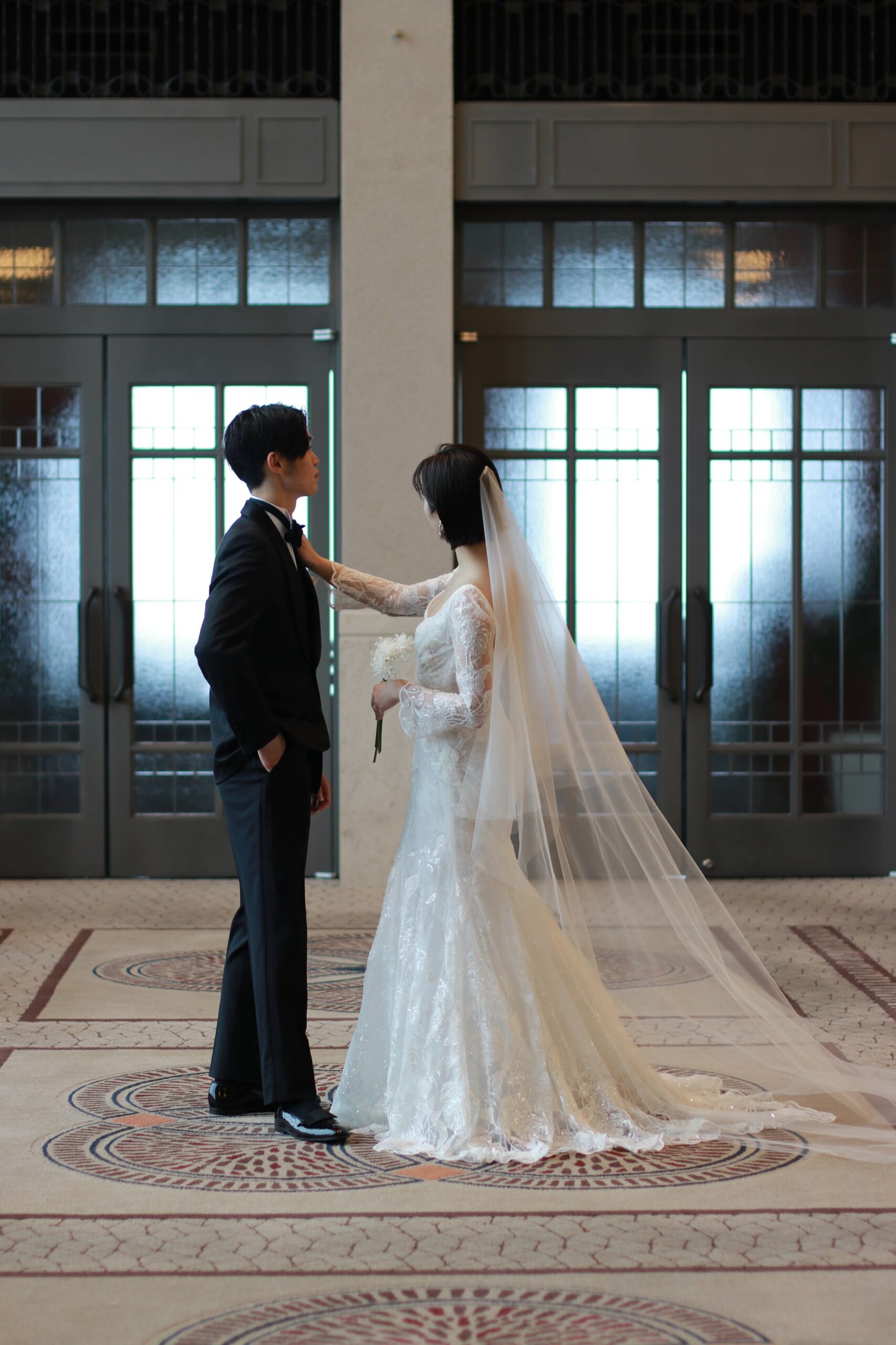 緊張と高揚が渦巻く中で支度を終え、チャペルで最愛のパートナーを前にしたとき、きっとこのうえない感動に包まれることでしょう。大切な人と過ごすこの挙式のひとときは、人との出会いや繋がりに感謝できる大切な時間です。ブラックタキシードに身を包んだご新郎様とそっと手を重ねて。お二人のコントラストが奏でるクラシカルで華やかな装いは、これから始まる新たな人生の門出に華を添えてくれます。