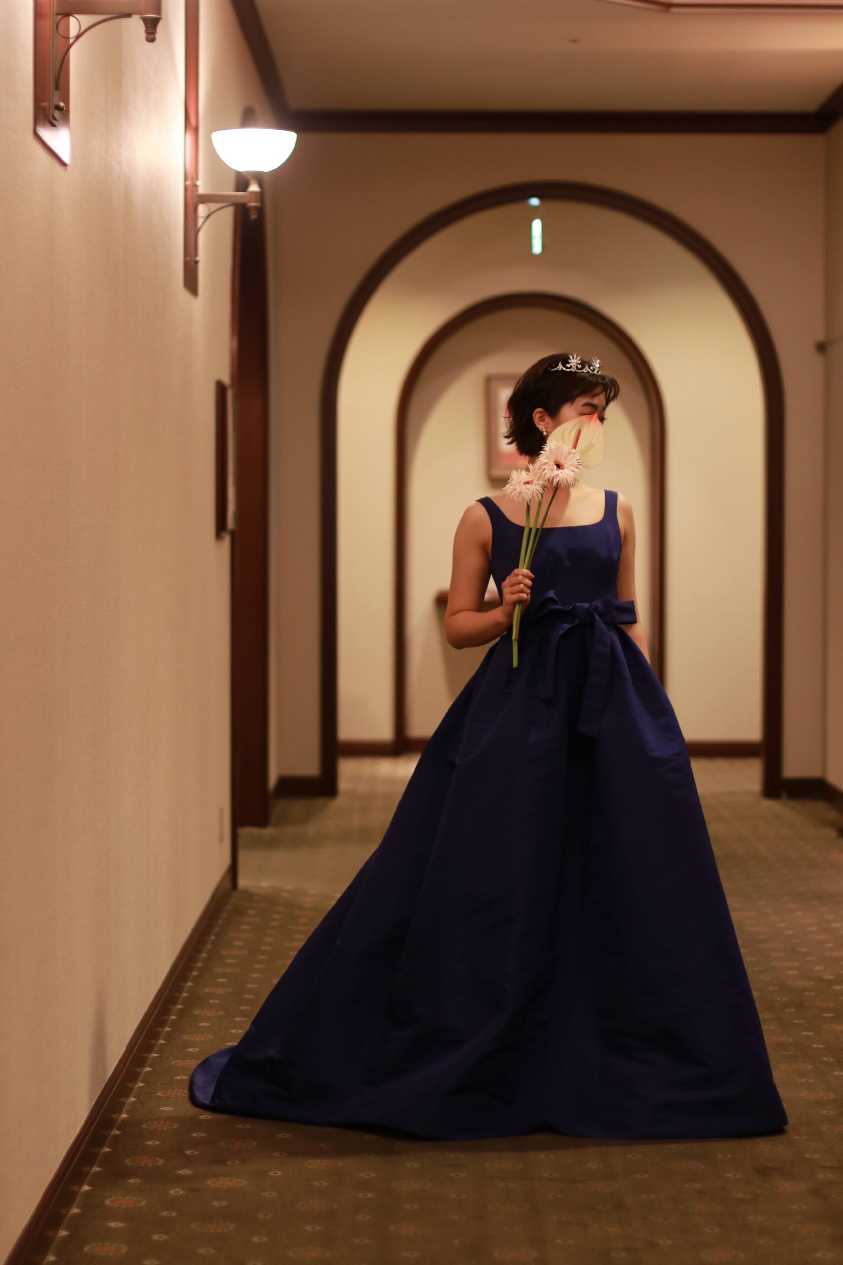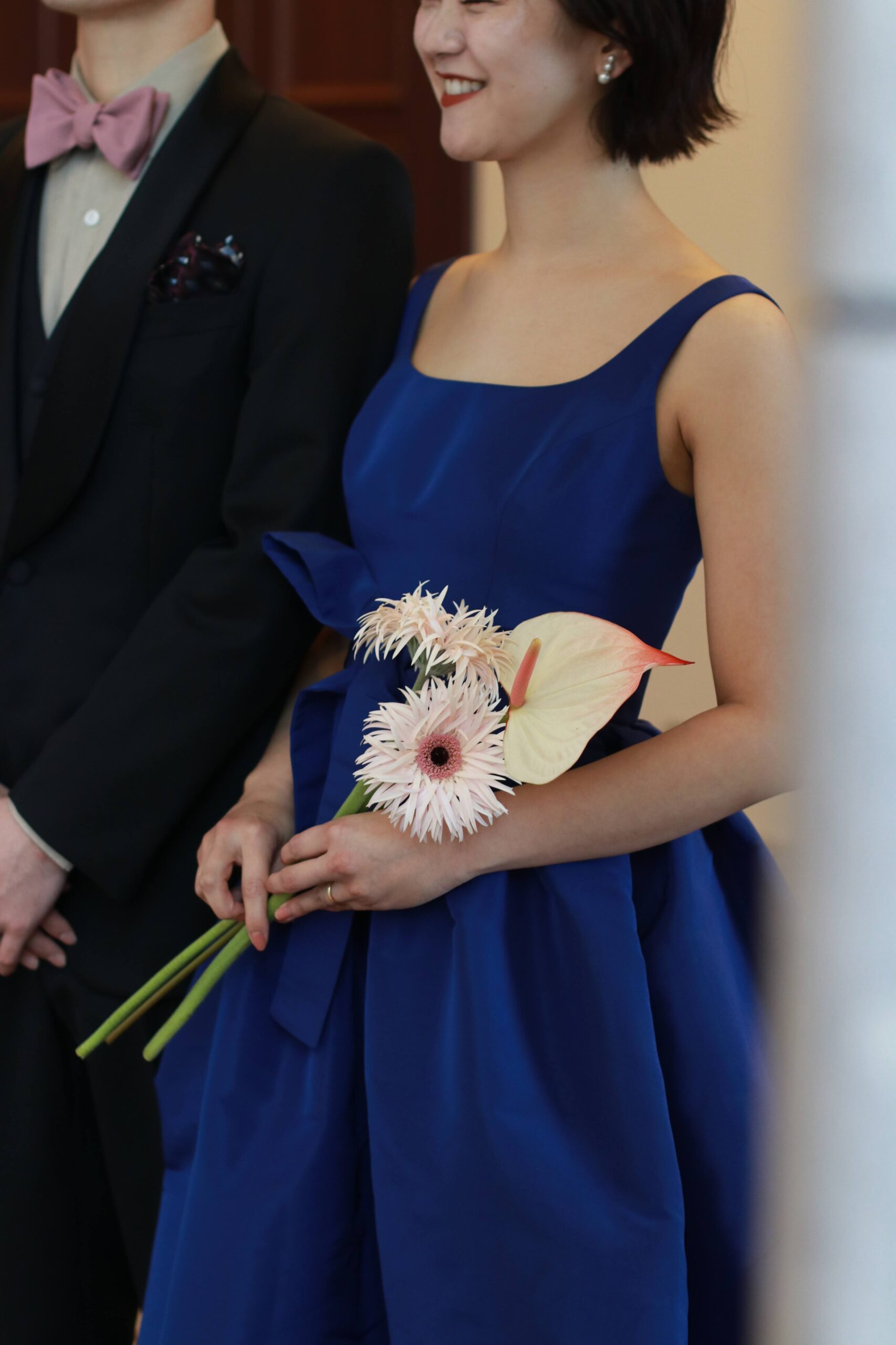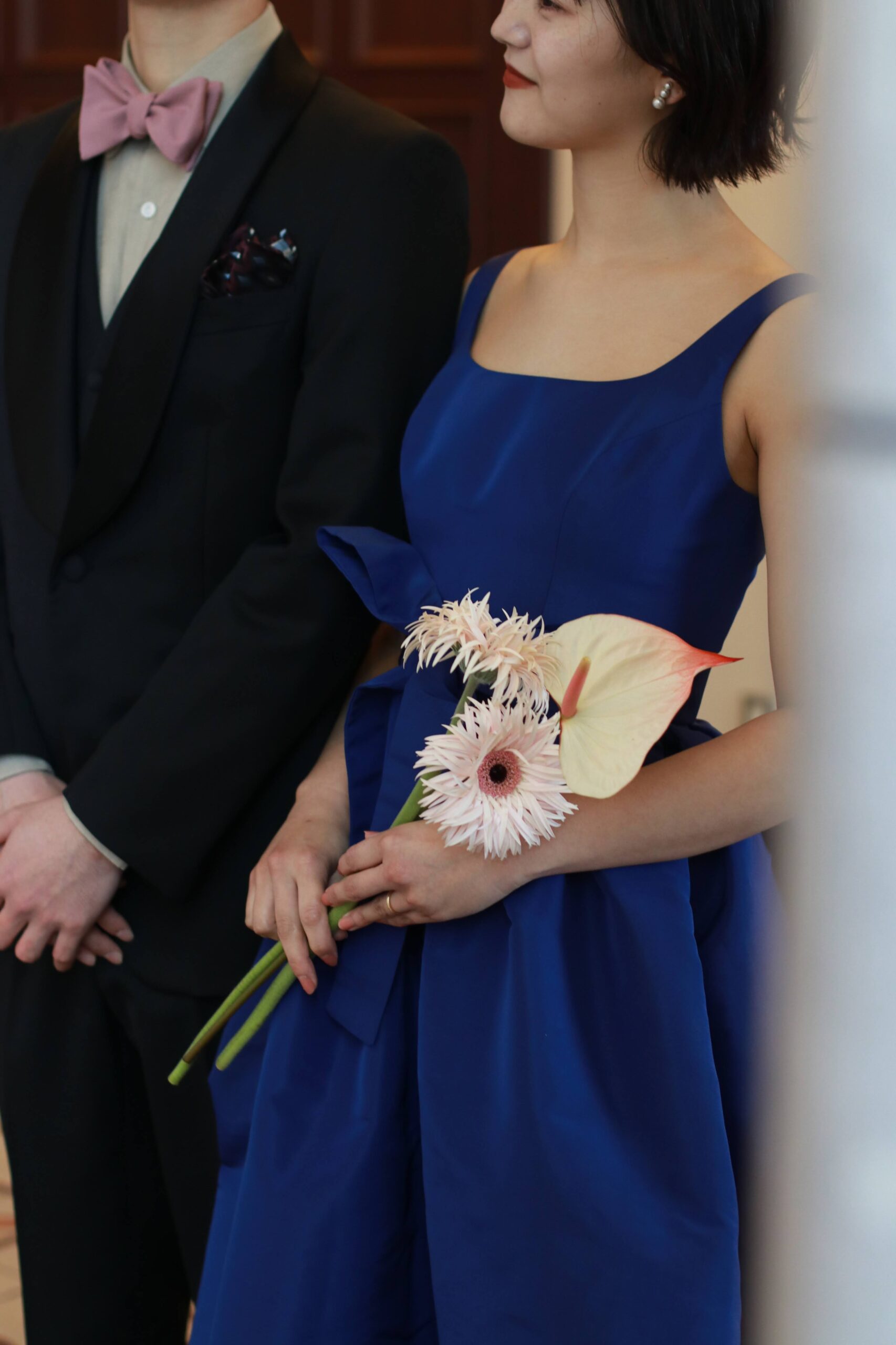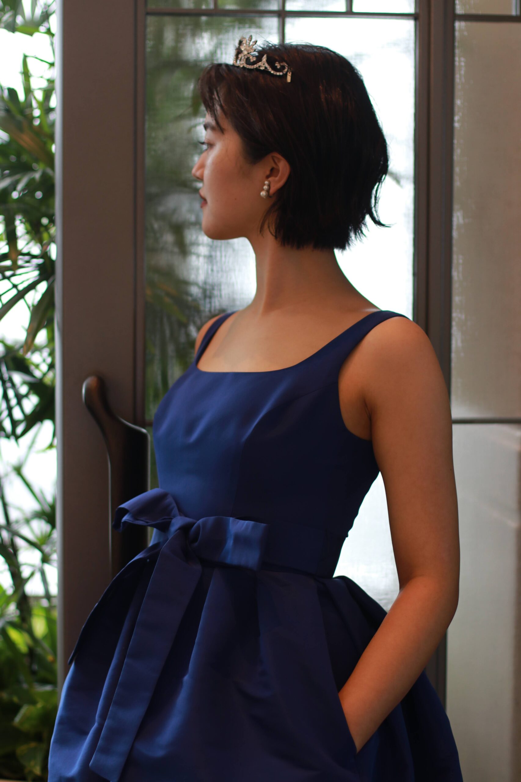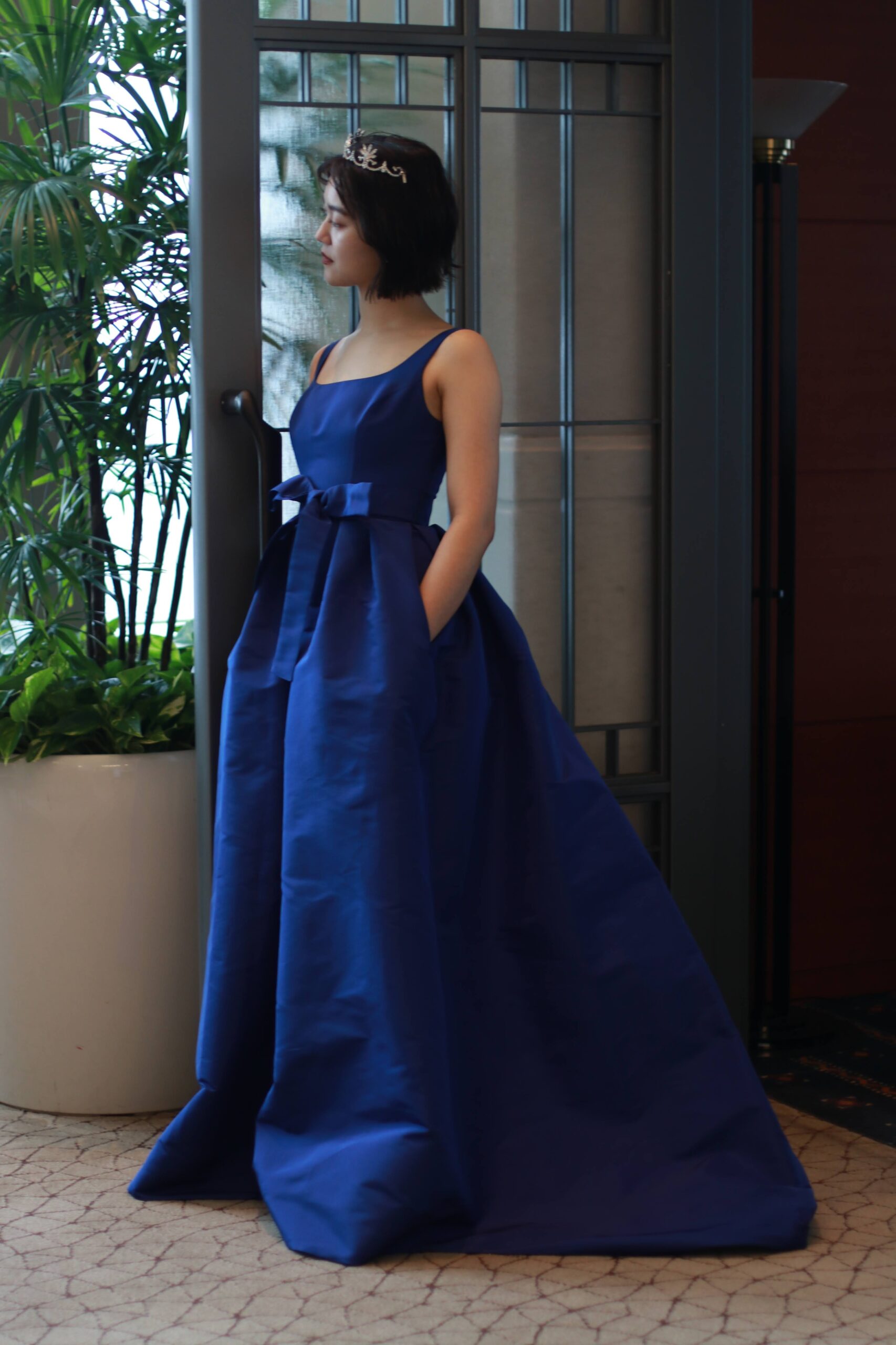 アディション店からおすすめするのは、Monique Lhuillier(モニーク ルイリエ)の新作カラードレス。凛と澄んだロイヤルブルーの色味が目をひくロマンティックな一着です。モダンなスクエアネックと、ウエストで結ぶアイキャッチなリボンの組み合わせはモニーク ルイリエだからこそ叶う巧みなバランス。高貴な霞山会館の雰囲気に合わせて、アクセサリーには大ぶりなティアラをセレクトしました。飾らないエフォートレスなスタイリングと煌めくアクセサリーのフュージョンが、非日常感をアップさせることでしょう。挙式のクラシカルスタイルから一変、遊び心を効かせたセンスフルなパーティースタイルは、ゲストの驚きと感動を誘います。