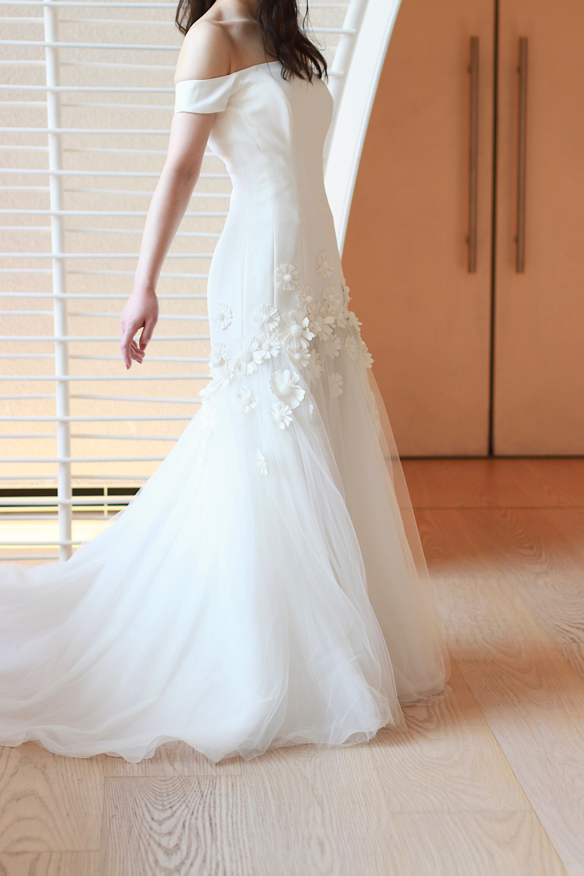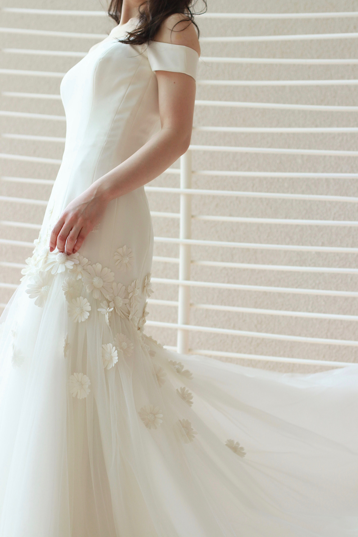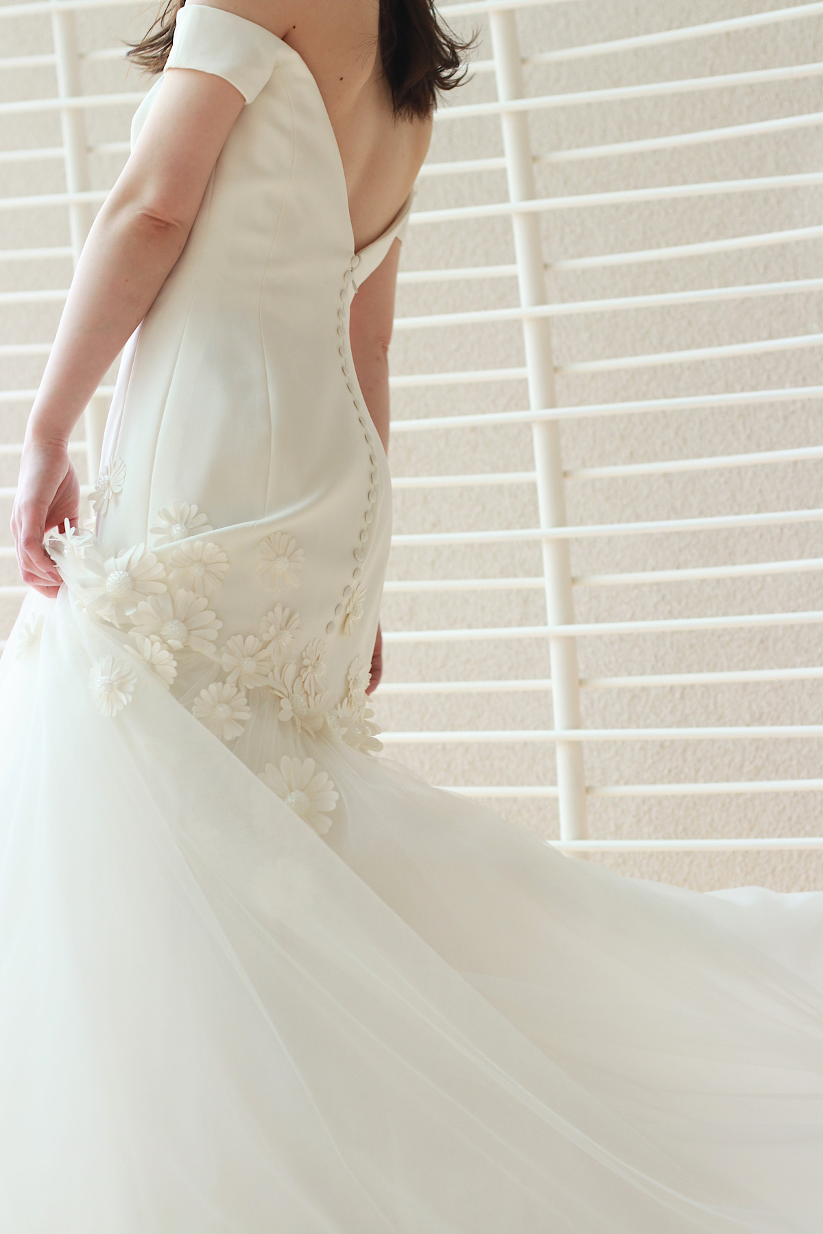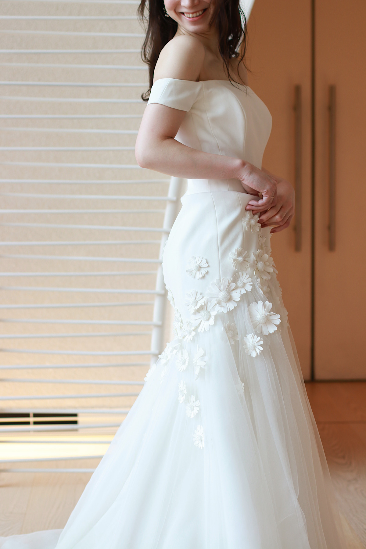 モダンでシャープな雰囲気がありながらも、温もりを感じるパレスホテル東京のチャペル。そんなチャペルでの前撮りにおすすめしたいのはVIKTOR&ROLF MARIAGE(ヴィクター アンド ロルフ マリアージュ)のソフトマーメイドラインのウェディングドレスです。ヒップラインまでは厚みのあるクレープ素材が優しく身体に添い、花嫁のボディラインを立体的に浮かび上がらせます。チュール素材のスカートは、チャペル内の優しい光とご新婦様の動きにより命を吹き込まれたかのようにエアリーな表情を見せるのです。オフショルダーラインのシャープさとスカートの軽やかな柔らかさが融合したデザインは、女性として内に秘める芯の強さと凛としたしなやかさを演出。スカートには愛らしいデイジーモチーフがまるでお二人を祝福するかのように咲き誇り、花々の中心に施されたクリスタルはチャペルの光を浴びて、優しく繊細に煌めきます。どこかモダンで都会的な高いデザイン性により、思いがけないエレガンスを創造するヴィクター アンド ロルフ マリアージュのウェディングドレス。身に纏えば、ヴィクター アンド ロルフ マリアージュらしい遊び心あるスパイスによって上質だけれど飾らない、あなたらしさを存分に引き出す前撮り写真を残せるはず。今だからこそ残していただける、もっと自由で等身大の花嫁姿を残してみてはいかがでしょう。