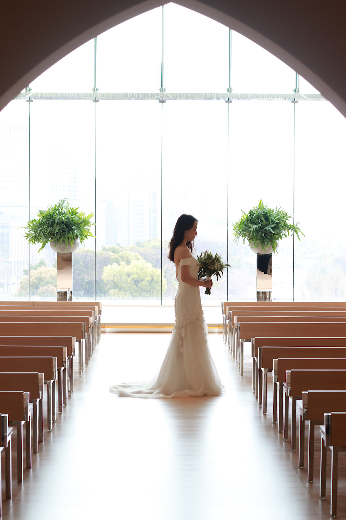 心を和ませるようなパレスホテル東京のチャペルで、等身大の花嫁姿を写真に残してみては。