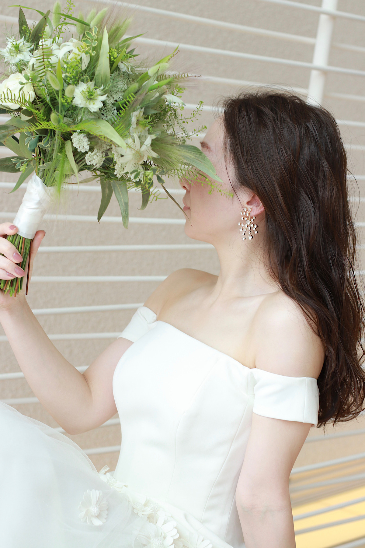 耳元には温かみのあるゴールドにビジューが輝くイヤリングを合わせて。ヘアスタイルはあえてラフにダウンし、緩くカールのかかったスタイルで気取らないリラックス感を演出します。飾りすぎないこなれたコーディネートは、写真からも花嫁の自然な表情を生きいきと感じさせてくれるでしょう。前撮りだからこそ、緊張感のあるお式とは違うリラックスした表情やお二人の空気感を、あなたらしい自由なスタイリングで楽めるはず。扉が開いた瞬間、心ときめいたパレスホテル東京のチャペルで、結婚式当日とは一味違うもっと自由で自然体な花嫁姿を残していただければと思います。
