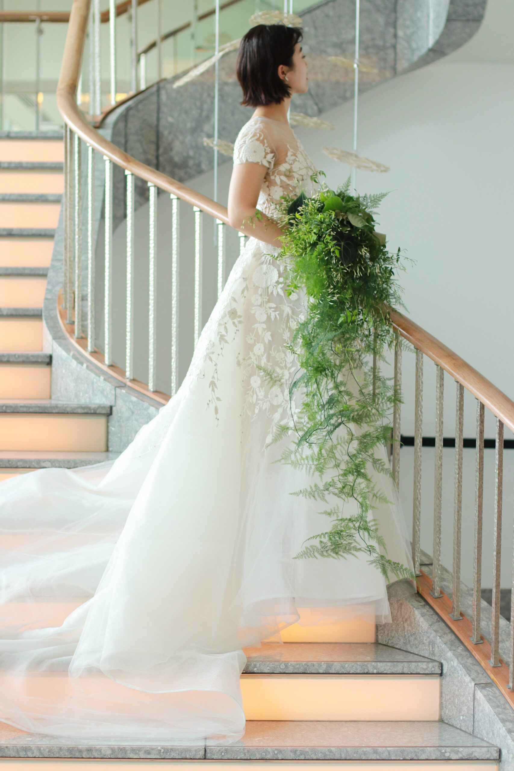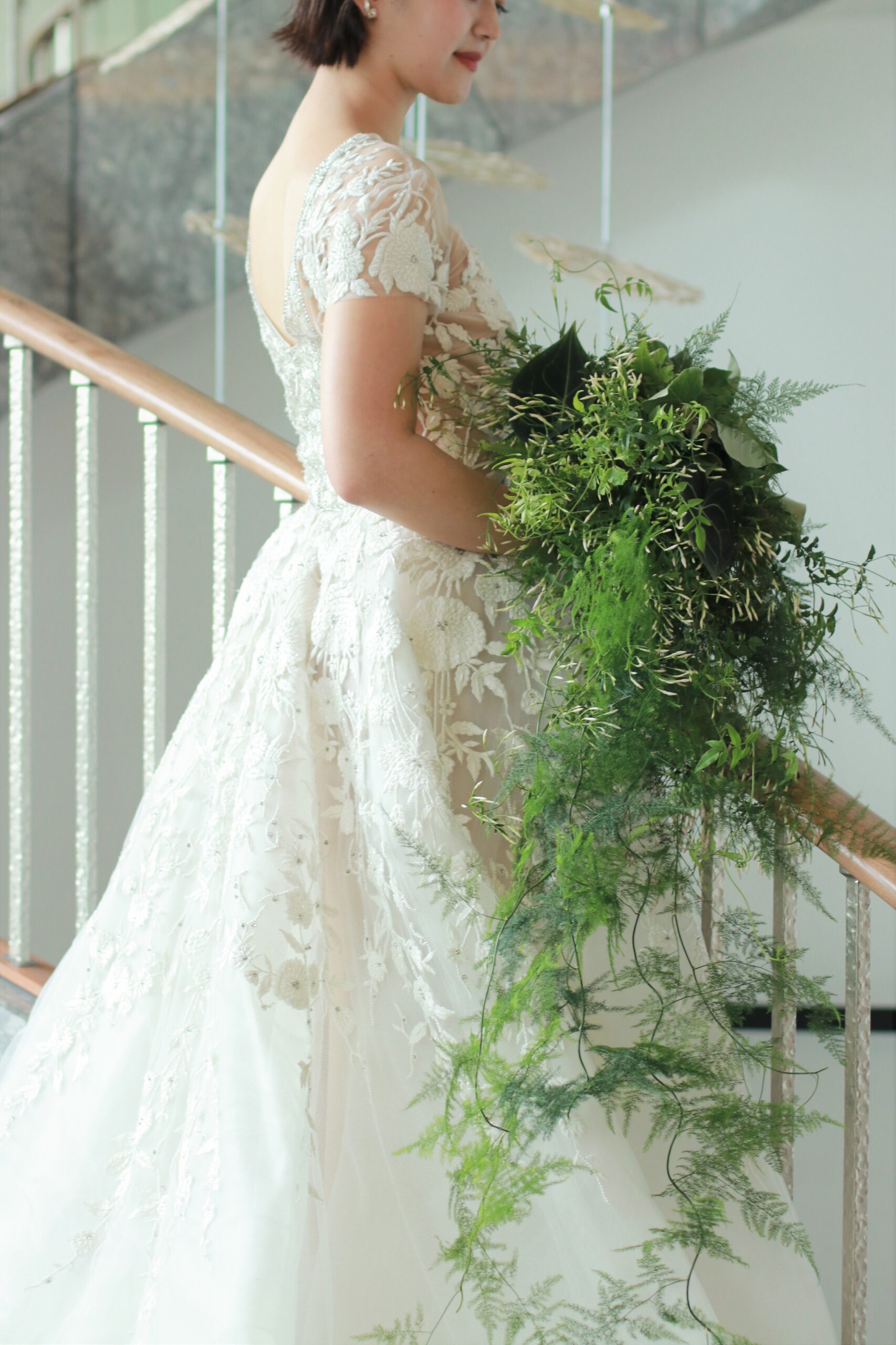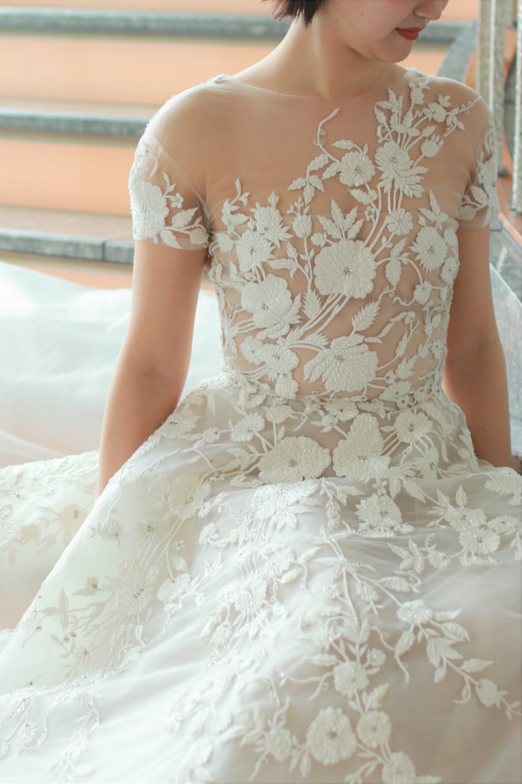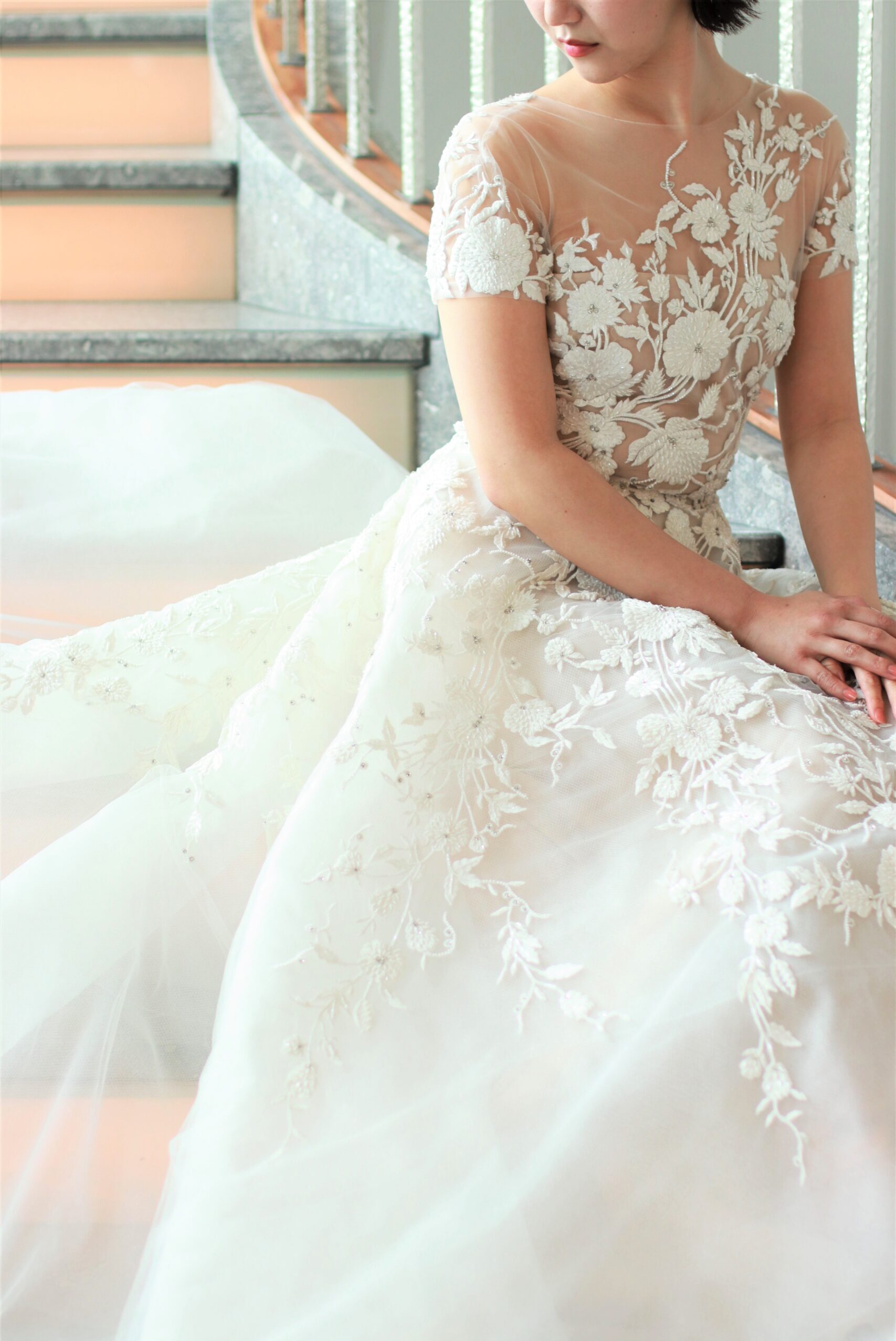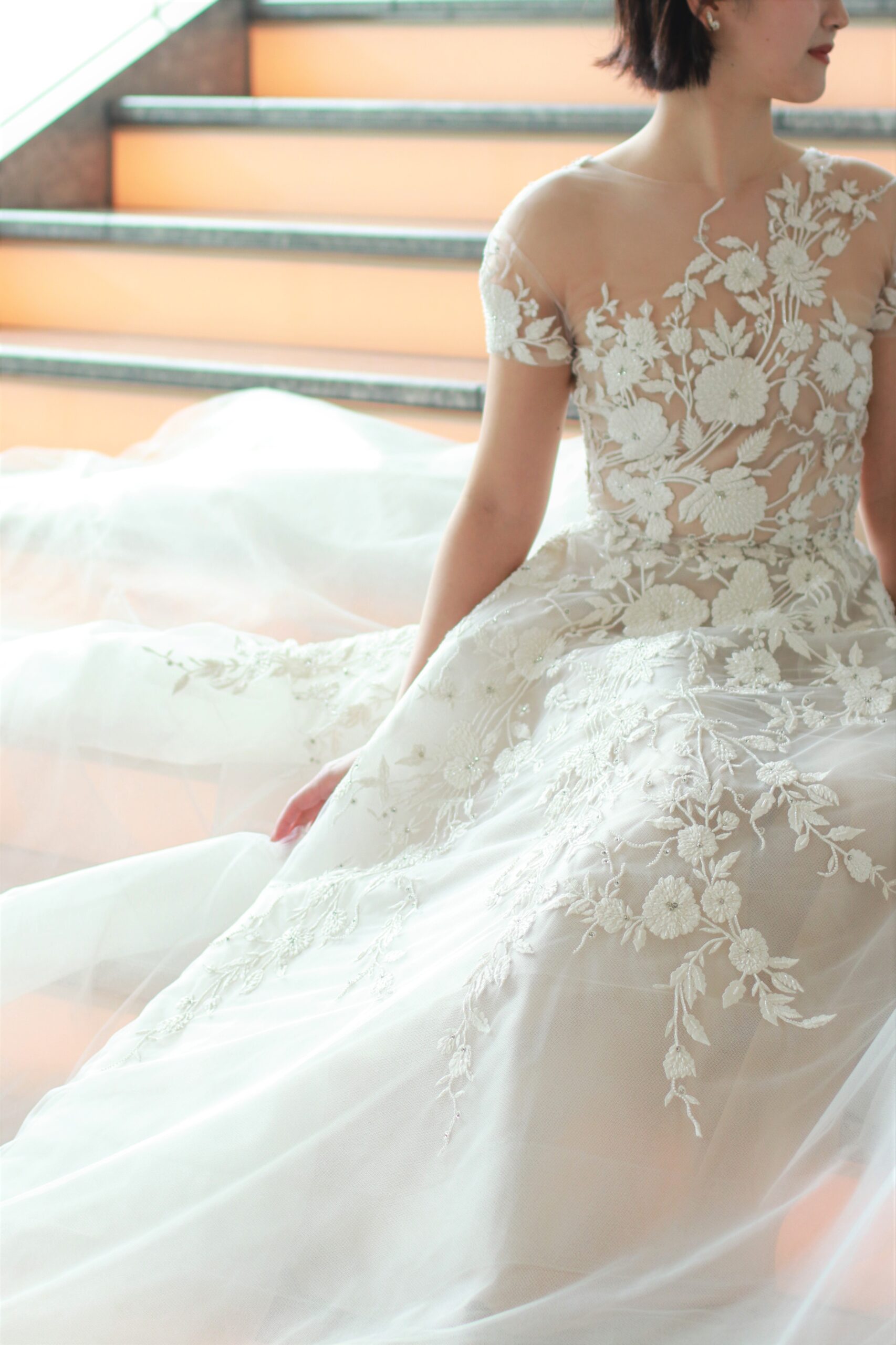 繊細なチュールの上に丁寧に手刺繍を施したリームアクラのウェディングドレスはパレスホテル東京の開放感ある窓から差し込む自然光を浴びきらめきを放ちます。結婚式という特別な一日にぴったりの圧倒的な存在感を放つことでしょう。